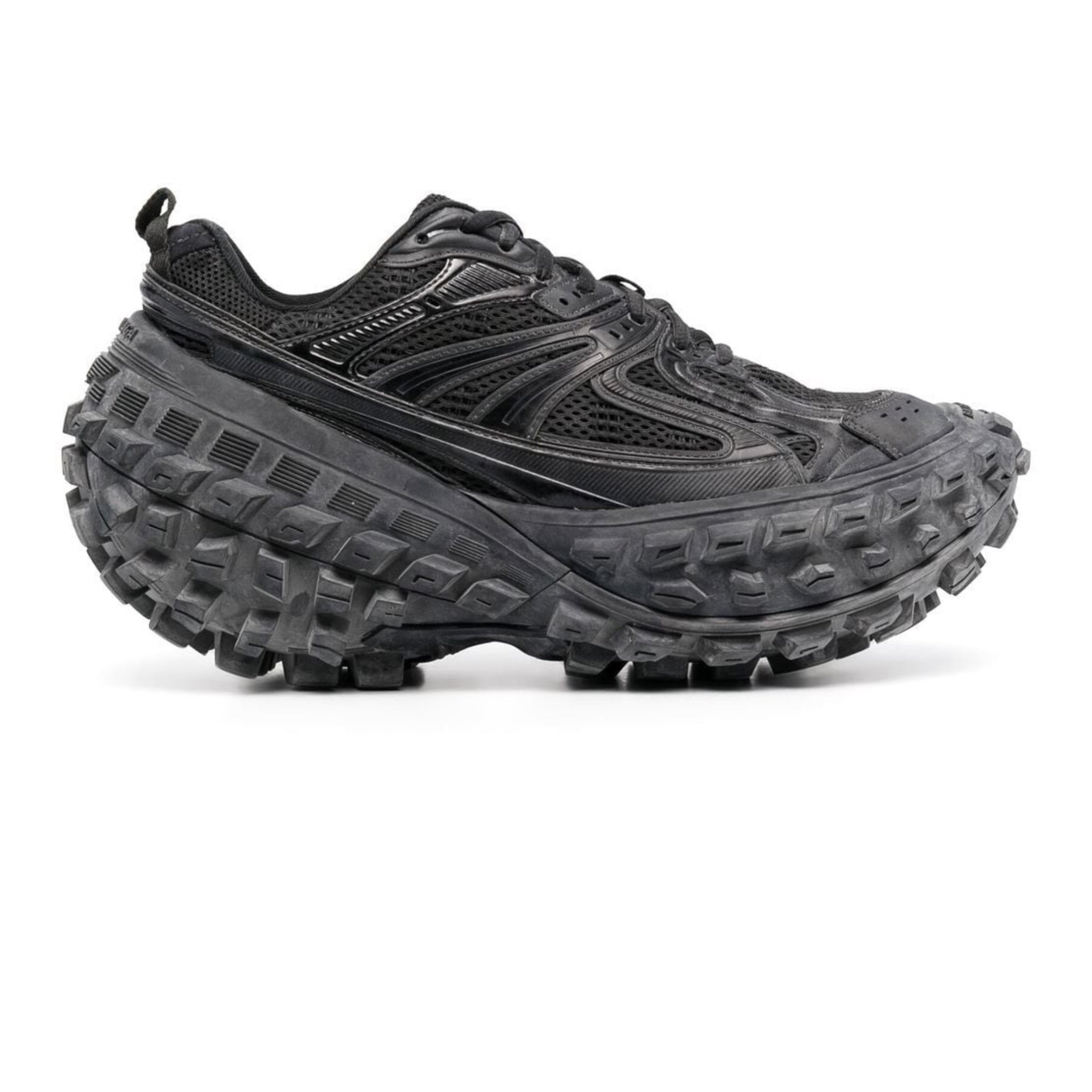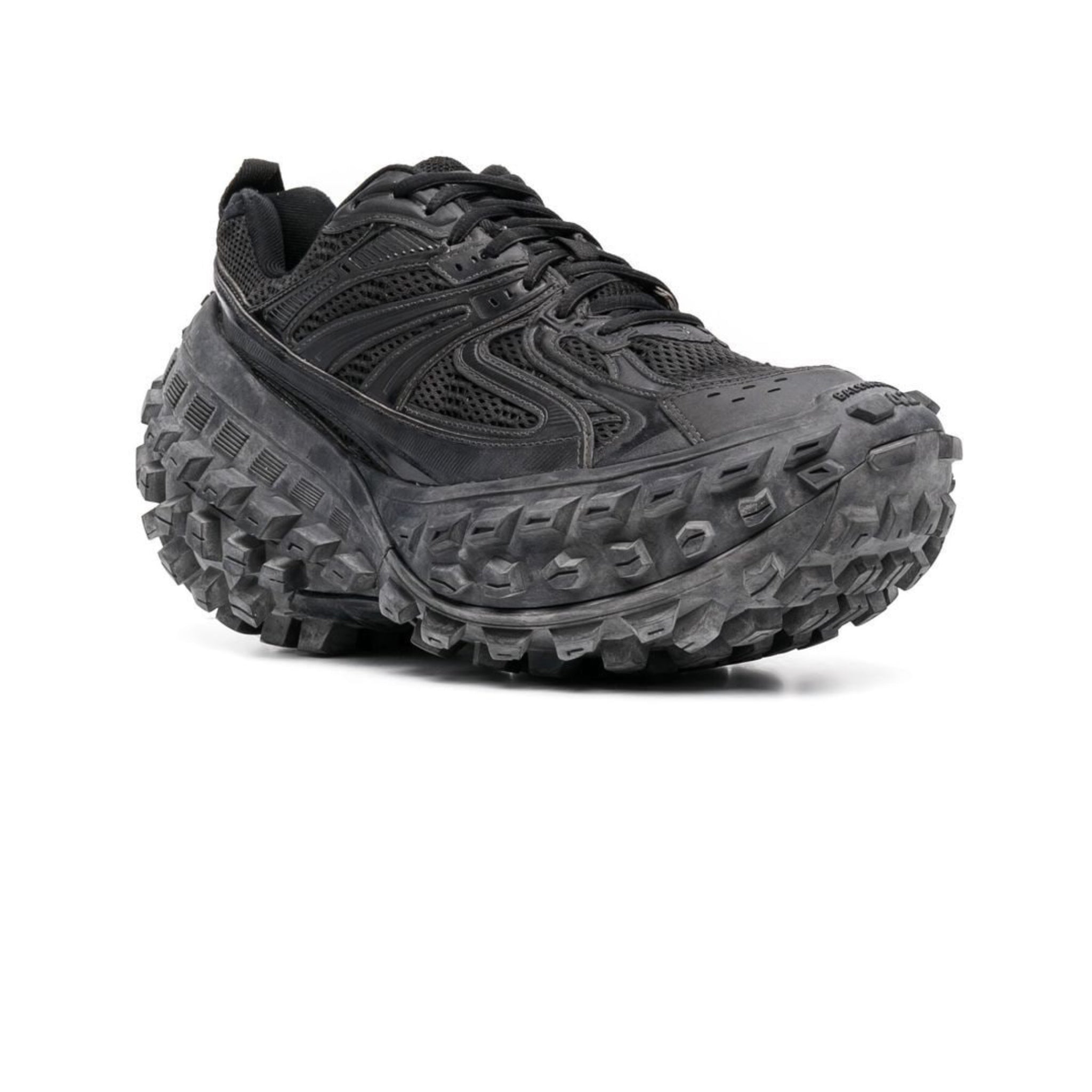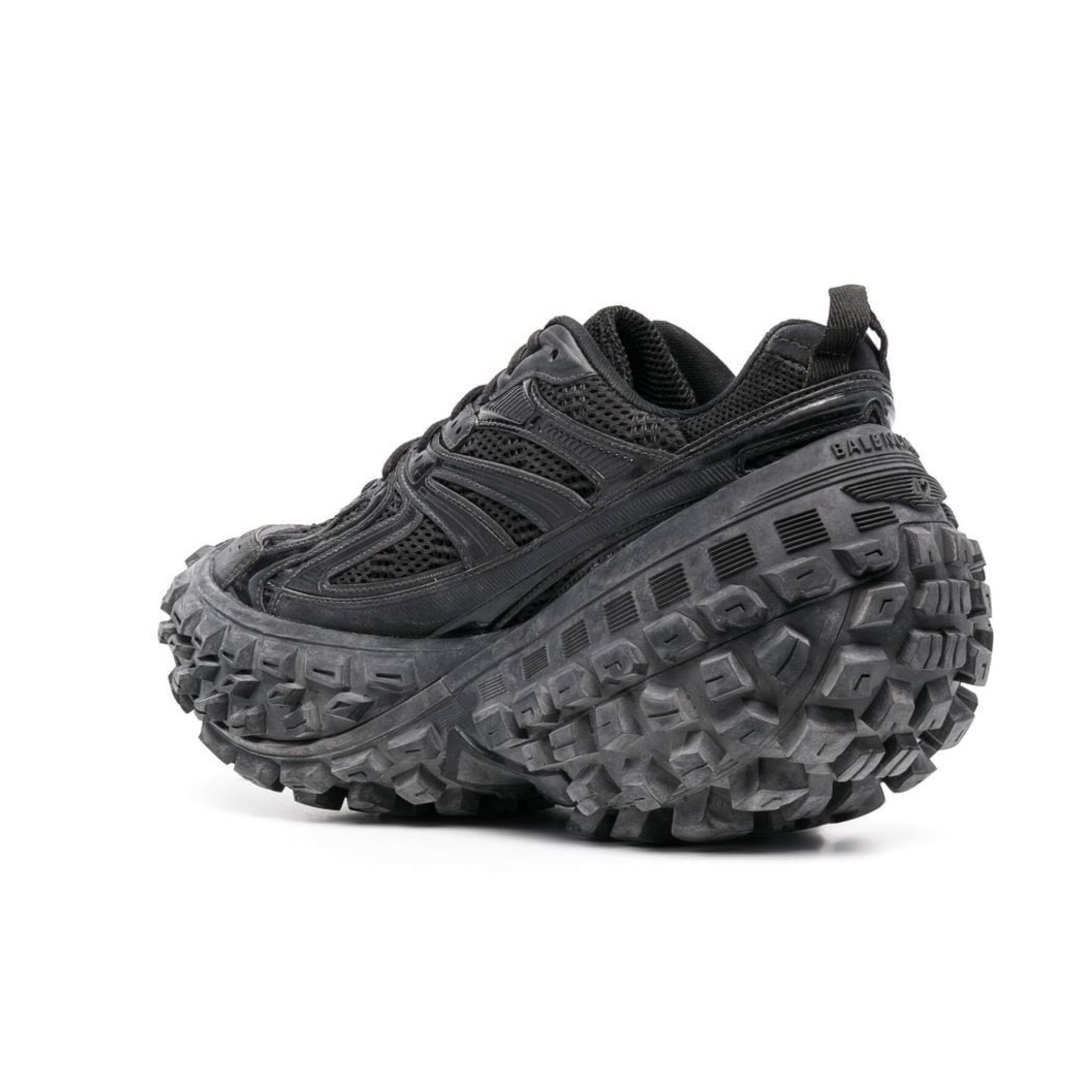 Debuted in 2022, the Bouncer sneakers by Balenciaga are updated for the brand's AW23 collection. Seen here in a tonal khaki hue, the sneakers sit atop an extended rubber outsole that takes inspiration from tires with distinctive treads.