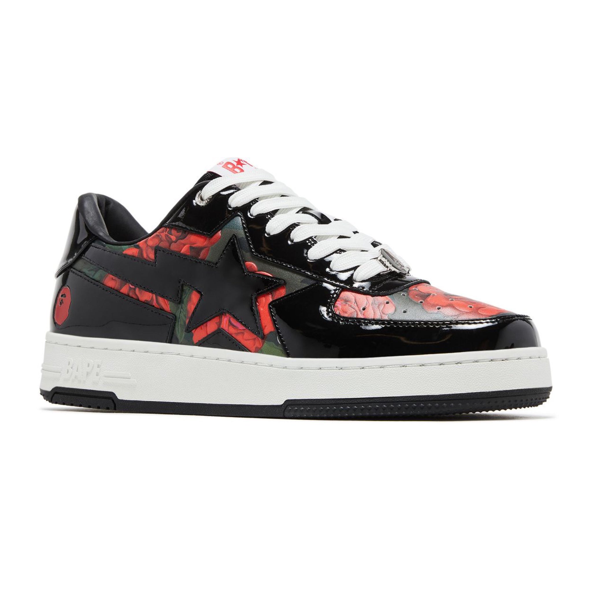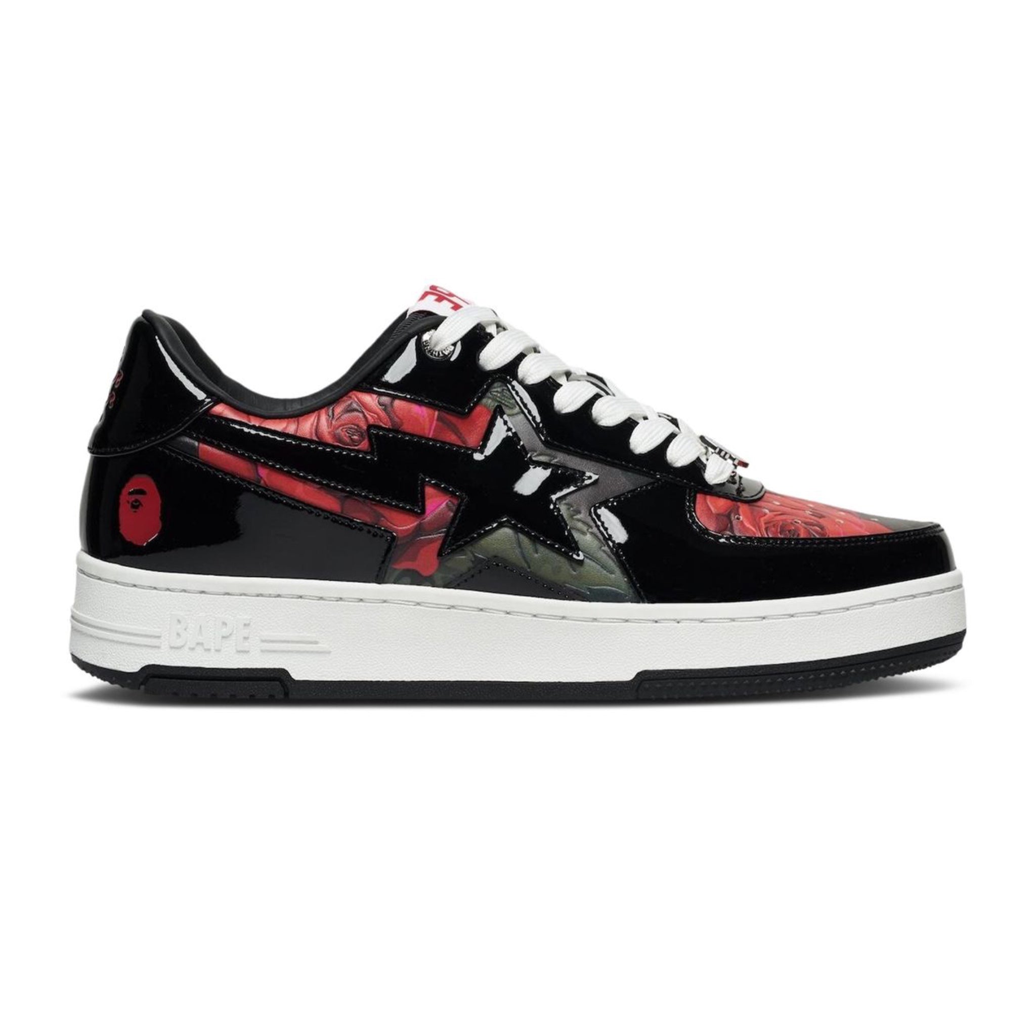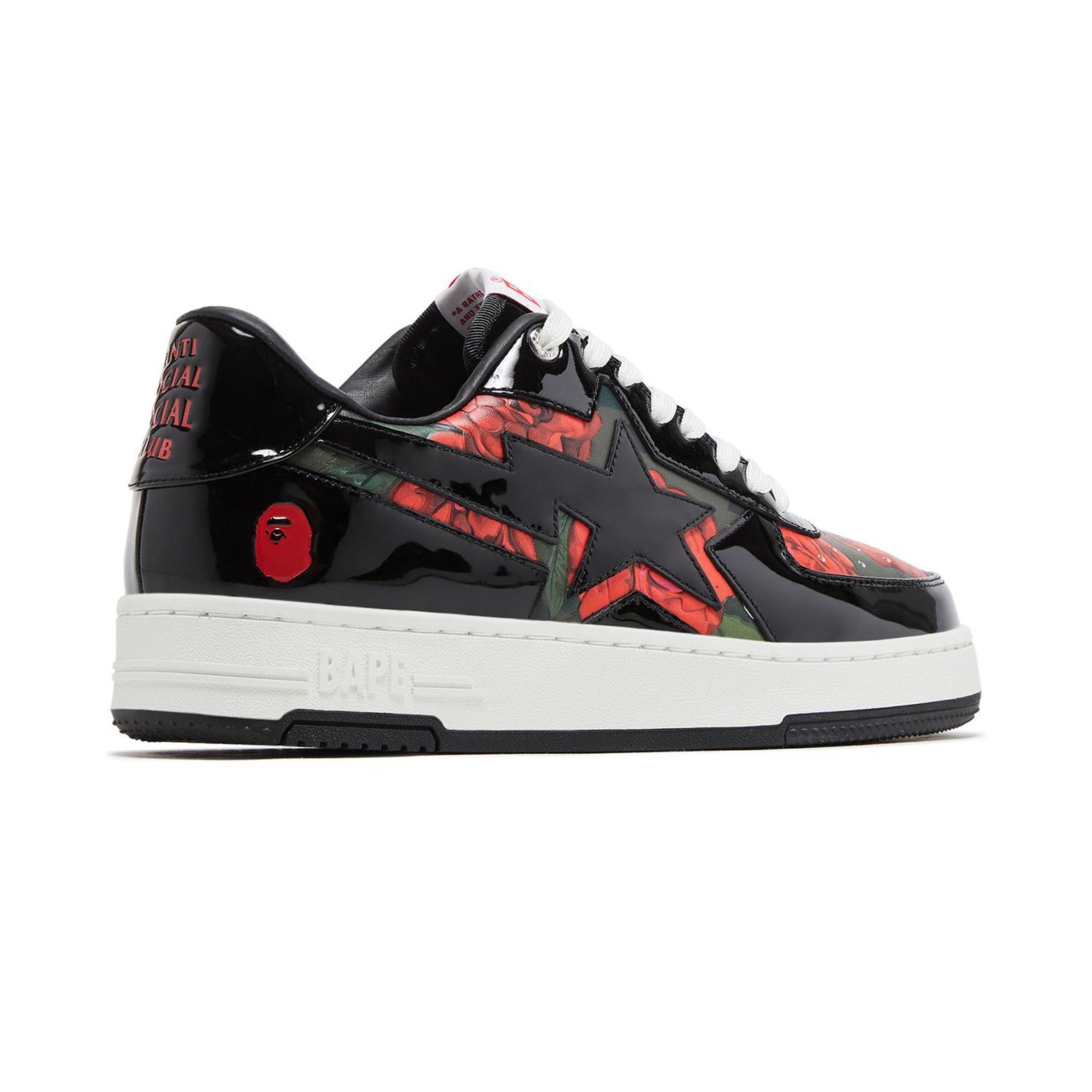 The Bapesta Icon x Anti Social Social Club 'Black' comes from a collection that puts together streetwear brands hailing from Los Angeles and Tokyo. The leather upper has a floral-clad, red and green 1st Camo print, contrasted by black patent leather overlays and a matching STA logo. A BAPE tongue tag meets an Anti Social Social Club signoff debossed on the back tab, and an Ape Head emblem on the side of the heel. These shoes have a traditional white rubber midsole with stitched sidewalls and a BAPE wordmark on the sidewall.
