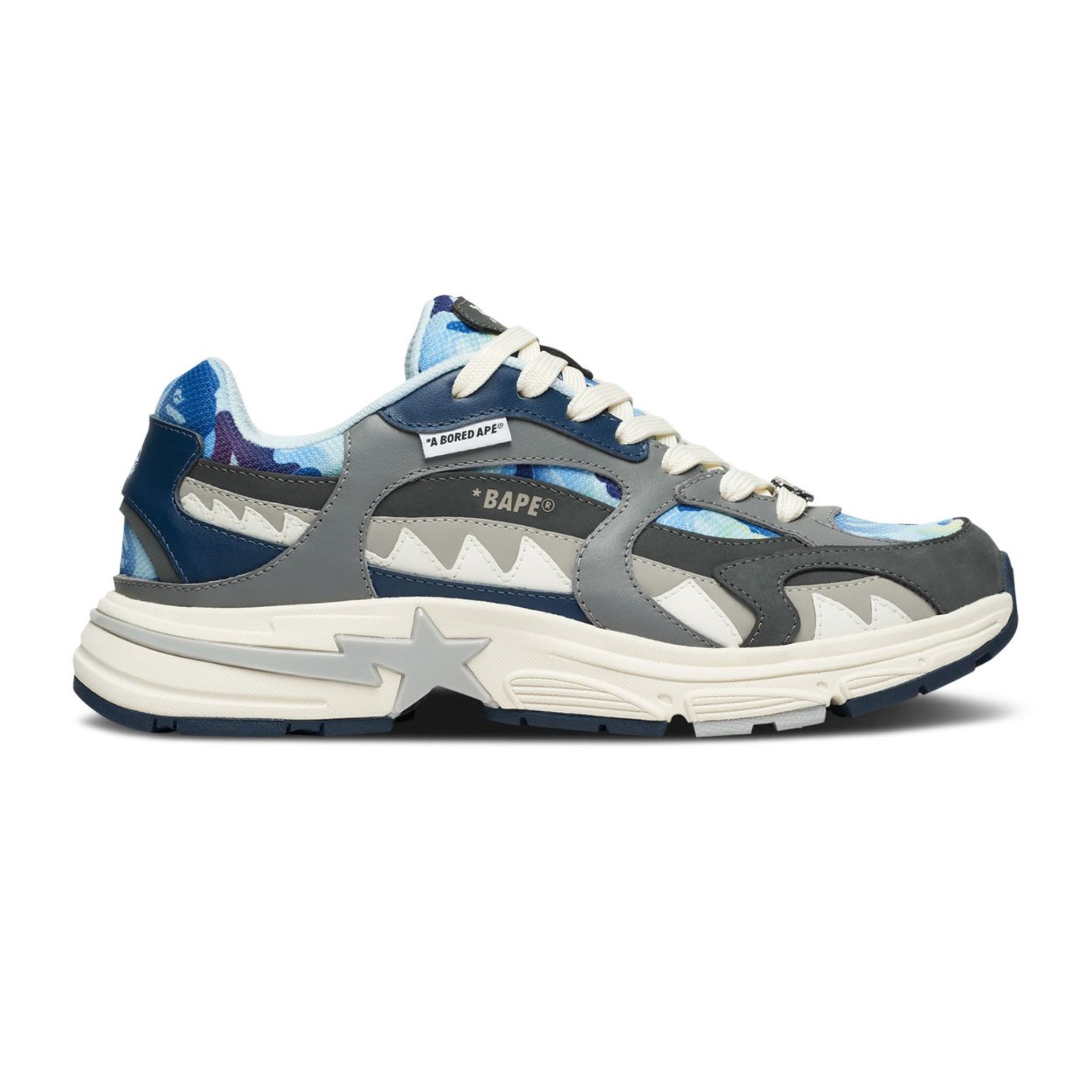The Bored Ape Yacht Club x BAPE Shark Sta 'Blue' was limited to only 1,000 pairs, sporting BAPE's iconic camo print in multiple shades of blue on the mesh upper, bolstered by grey leather overlays. Shark tooth details enrich the side panel, while the blue leather heel overlay showcases both collaborator logos. A foam midsole contains a TPU BAPE STA logo embedded in the sidewall for a signature look.