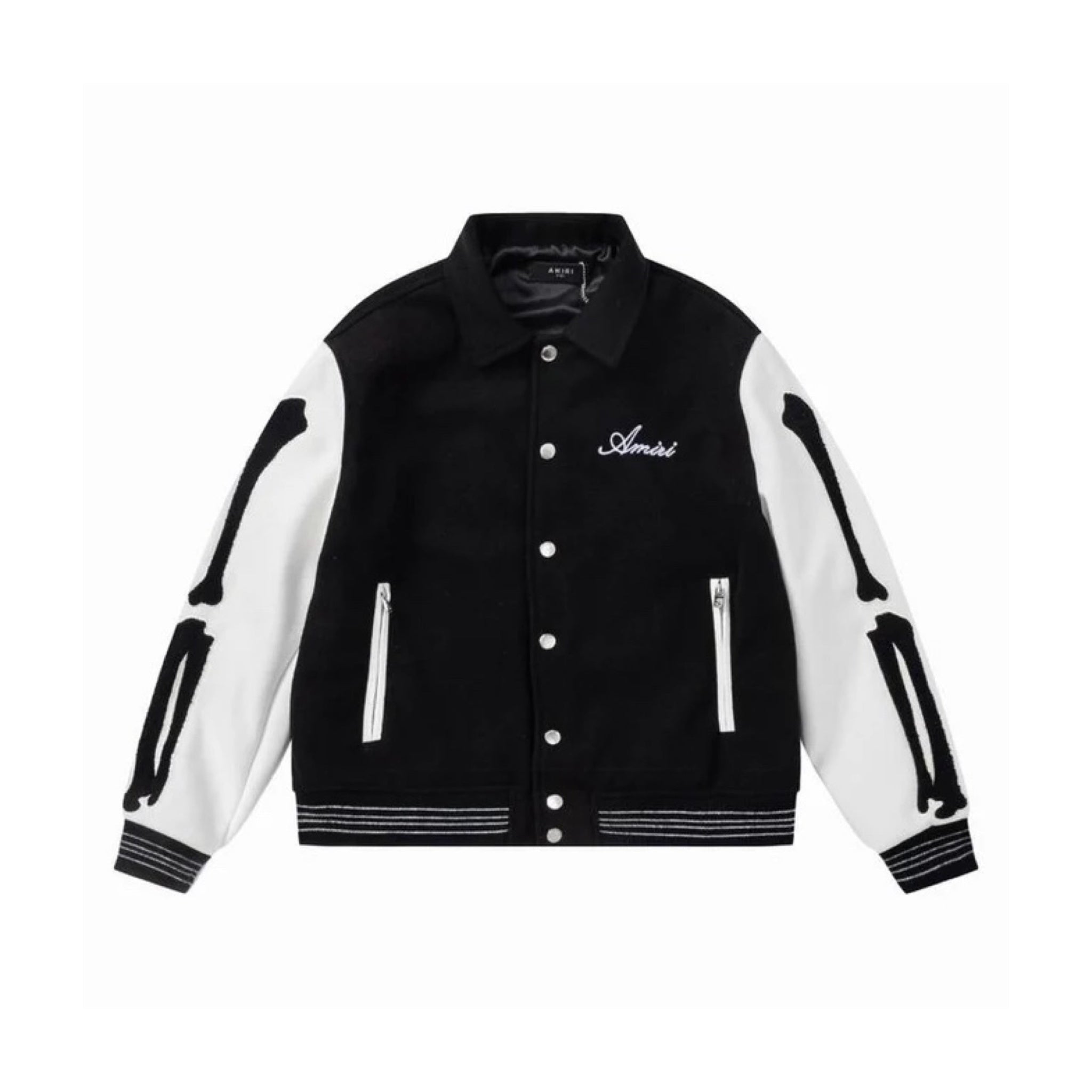 As an industry expert, I present to you the Amiri Bones Varsity Jacket. Made with premium materials, this varsity jacket boasts intricate embroidery and a sleek, comfortable fit. With its unique design and expert craftsmanship, it's a must-have for any fashion-forward individual. Elevate your style game with the Amiri Bones Varsity Jacket.