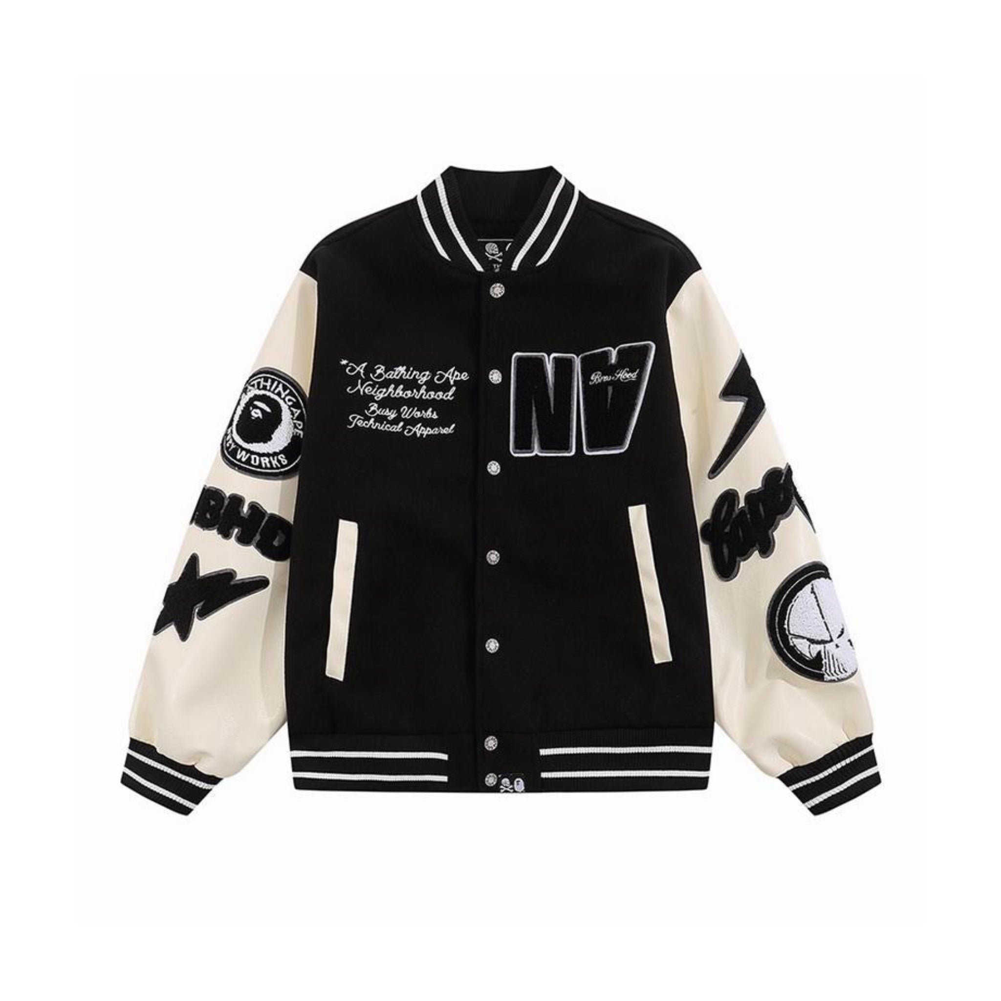 Expertly crafted, the A BATHING APE® x Neighborhood Varsity Jacket combines the unique styles of two iconic streetwear brands. Made from premium materials, this jacket features a classic varsity design and boasts a sleek, modern look. Perfect for any fashion-forward individual looking to make a statement.