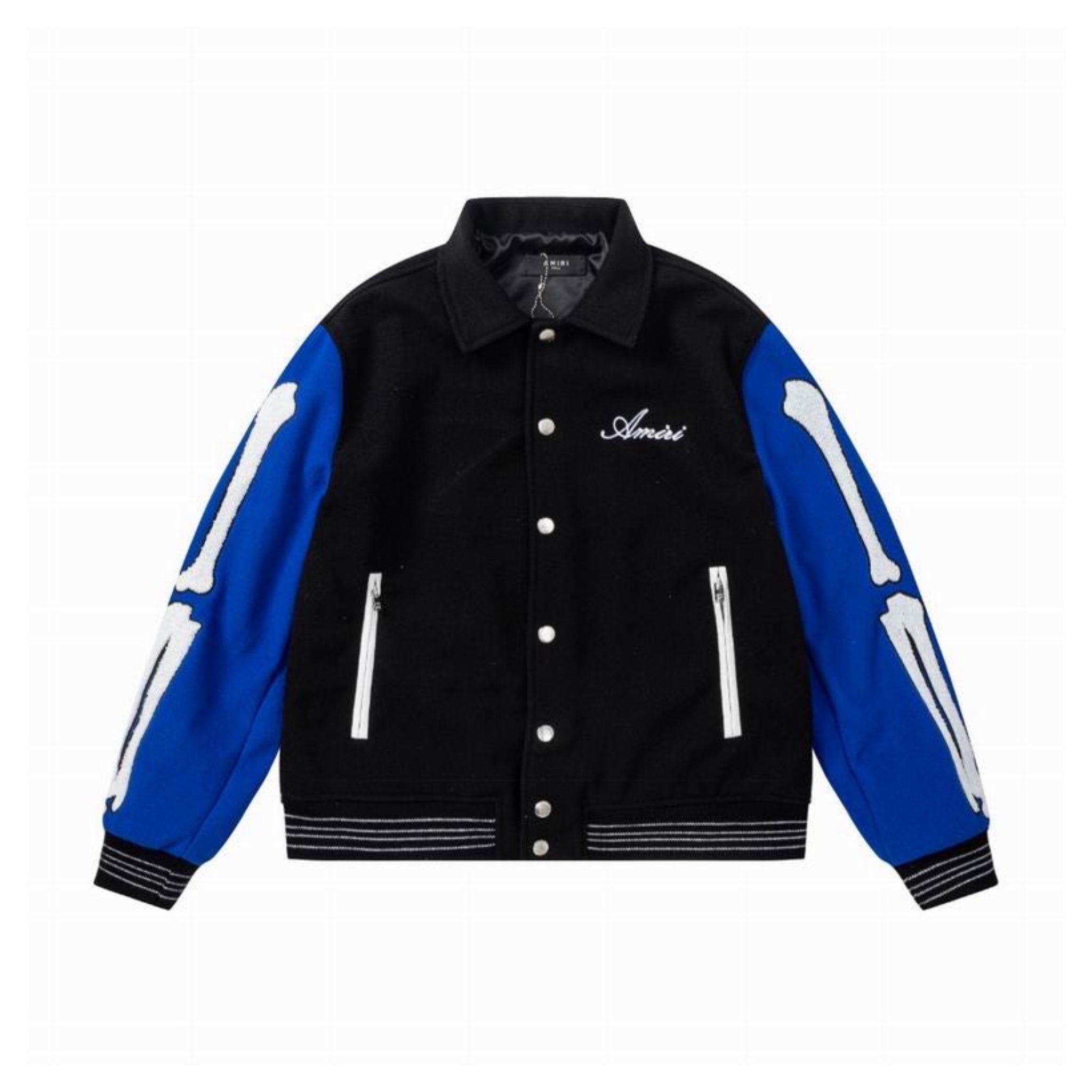 As an industry expert, I present to you the Amiri Bones Varsity Jacket. Made with premium materials, this varsity jacket boasts intricate embroidery and a sleek, comfortable fit. With its unique design and expert craftsmanship, it's a must-have for any fashion-forward individual. Elevate your style game with the Amiri Bones Varsity Jacket.