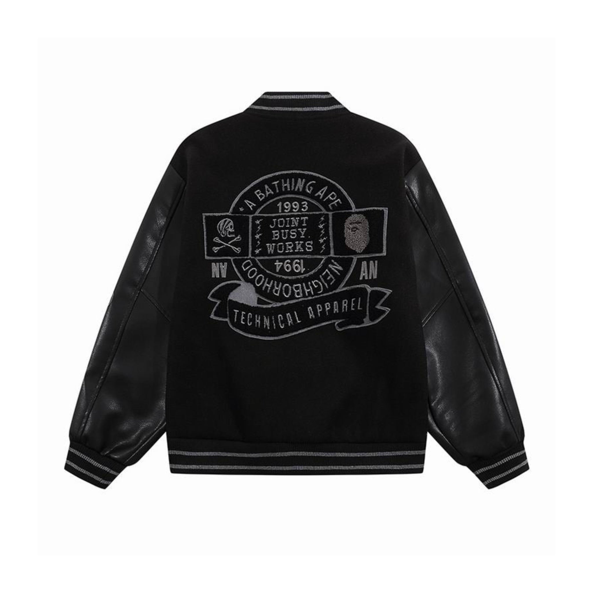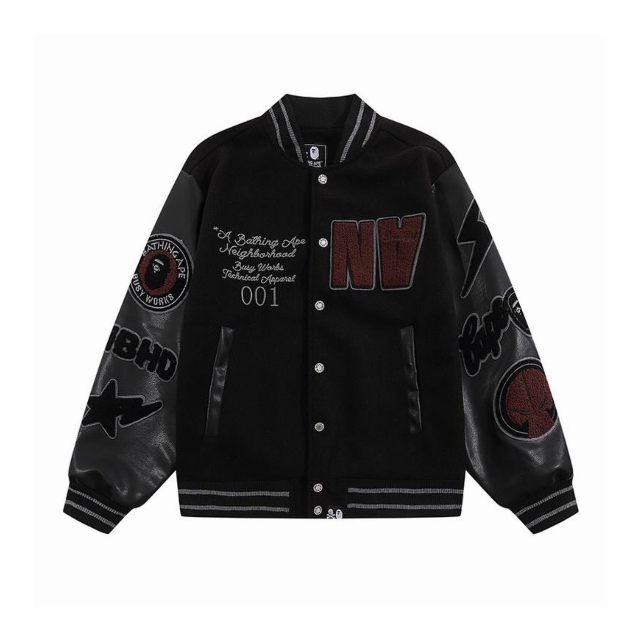 This A BATHING APE® x Neighborhood Varsity Jacket is a stylish collaboration combining the iconic designs of both brands. Made with high quality materials, it features a classic varsity jacket style with bold graphics and a comfortable fit. Perfect for those who appreciate quality and unique fashion.