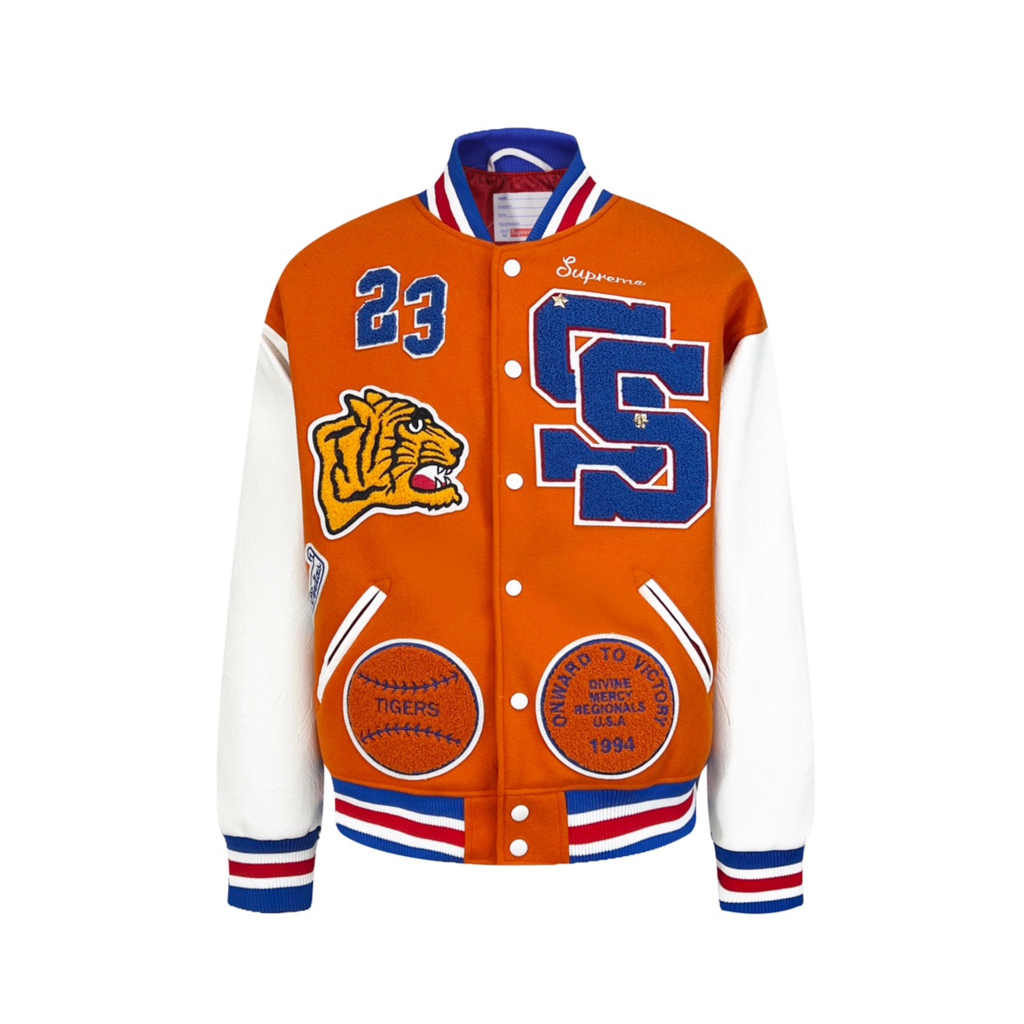 The Supreme FW23 Tiger Varsity Jacket combines classic varsity style with bold tiger embroidery, offering a distinctive look that stands out. Crafted with quality materials, it provides warmth and durability suitable for cooler seasons. Its tailored fit ensures comfort and a sharp silhouette, making it an ideal choice for those seeking both fashion and function in a statement outerwear piece.