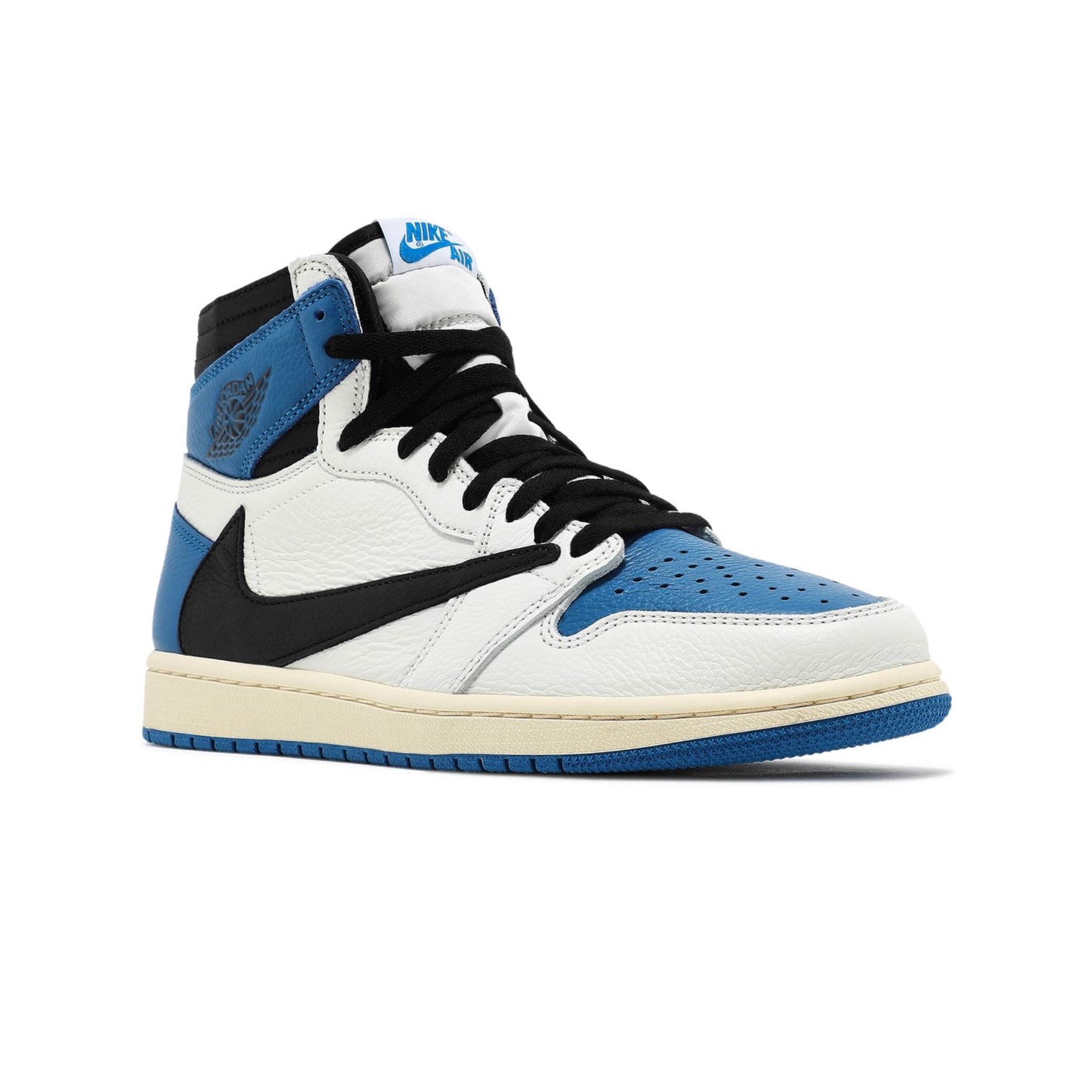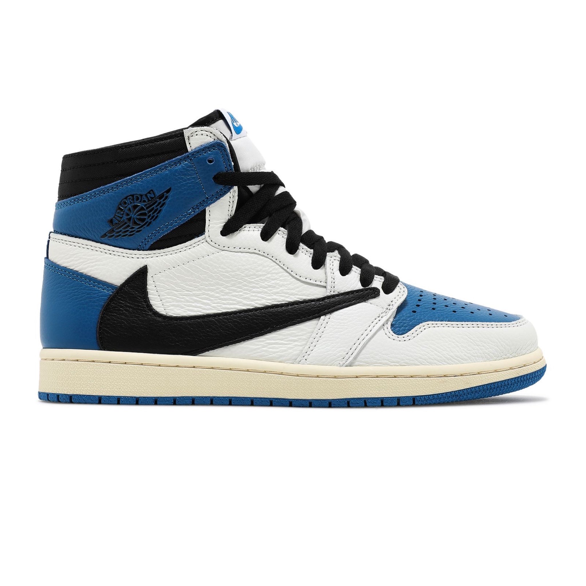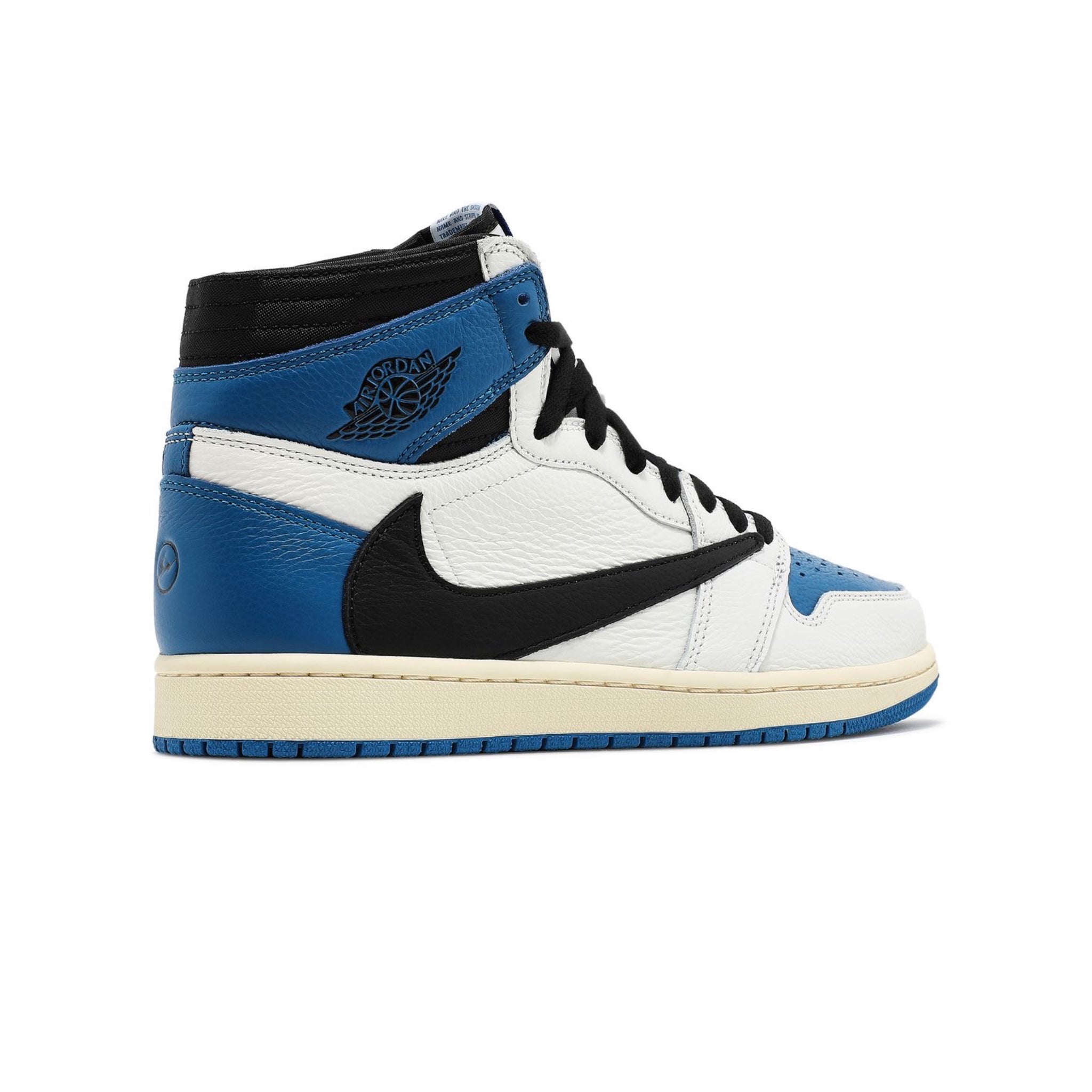 A Jordan Brand collaboration with two major creative partners, the Fragment Design x Travis Scott x Air Jordan 1 Retro High released in July 2021. The shoe's upper is built with a white tumbled leather base, contrasted by black on Travis Scott's signature backward Swoosh branding. The black nylon collar includes a hidden pouch, similar to a 2019 collaboration, while the toe box, collar and heel overlay all add Military Blue to the look. The heel also includes fragment design's lightning bolt logo on the right shoe, with Cactus Jack branding on the left, while underfoot, an off-white midsole houses Air in the heel to offer the usual cushioning. More Military Blue on the concentric rubber outsole completes the look.