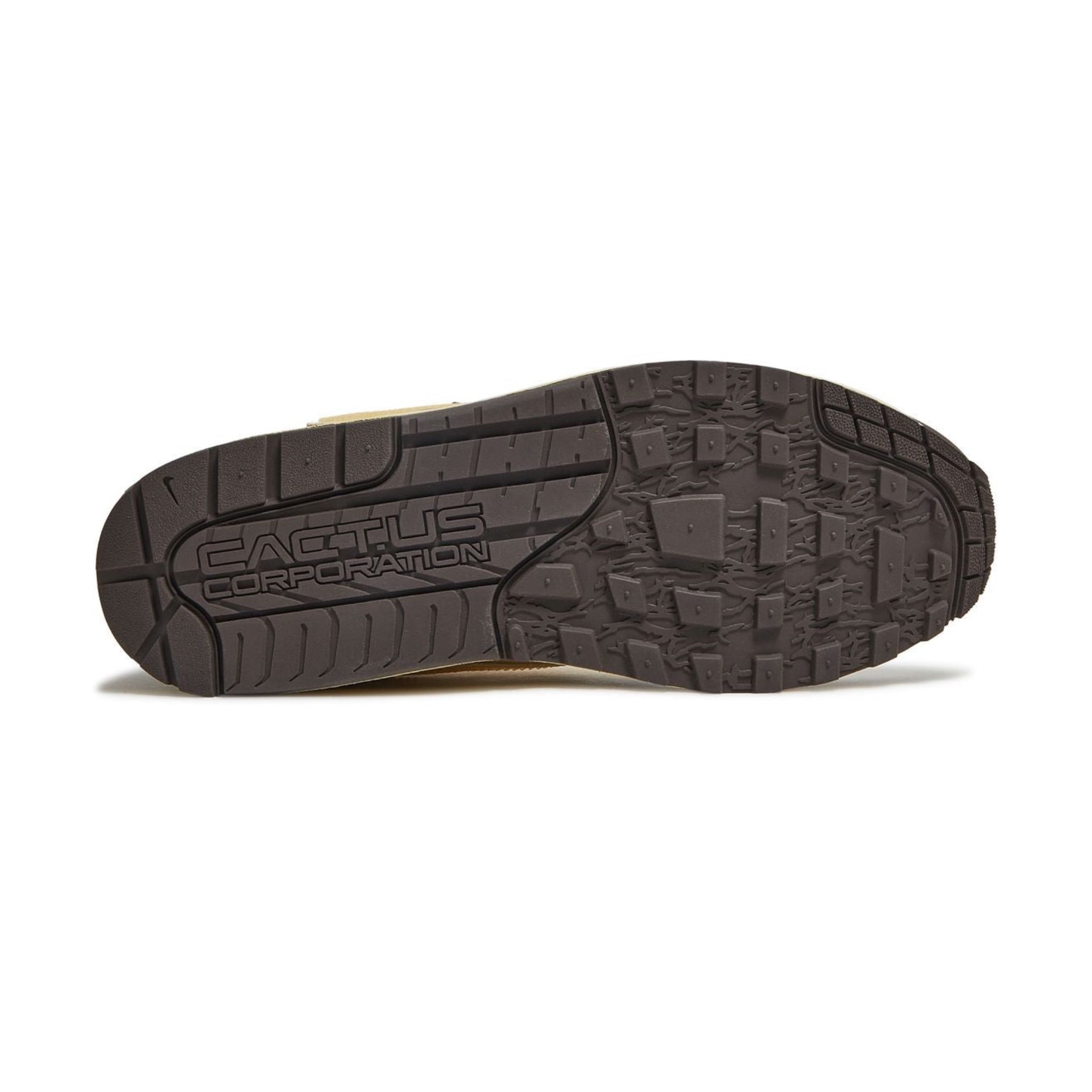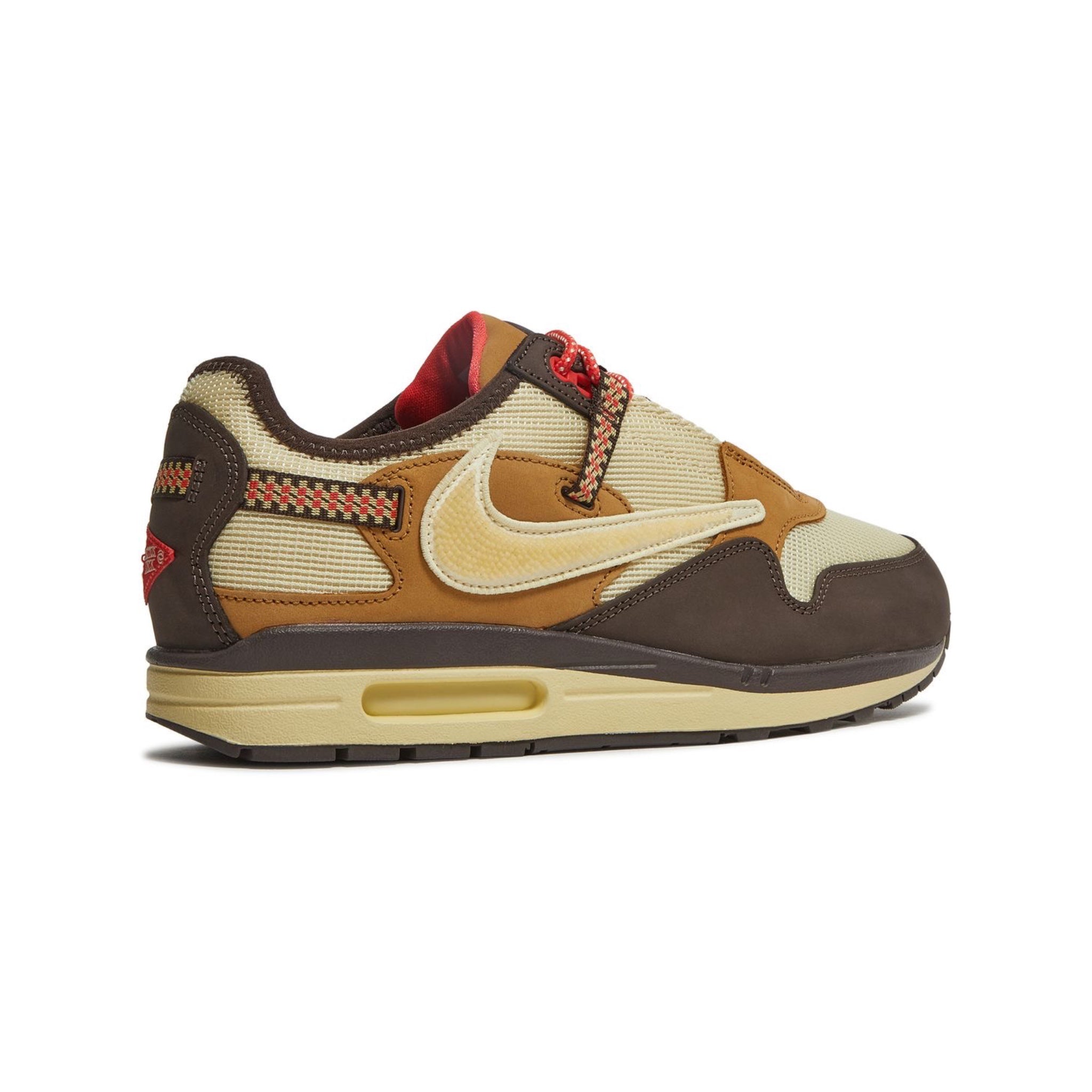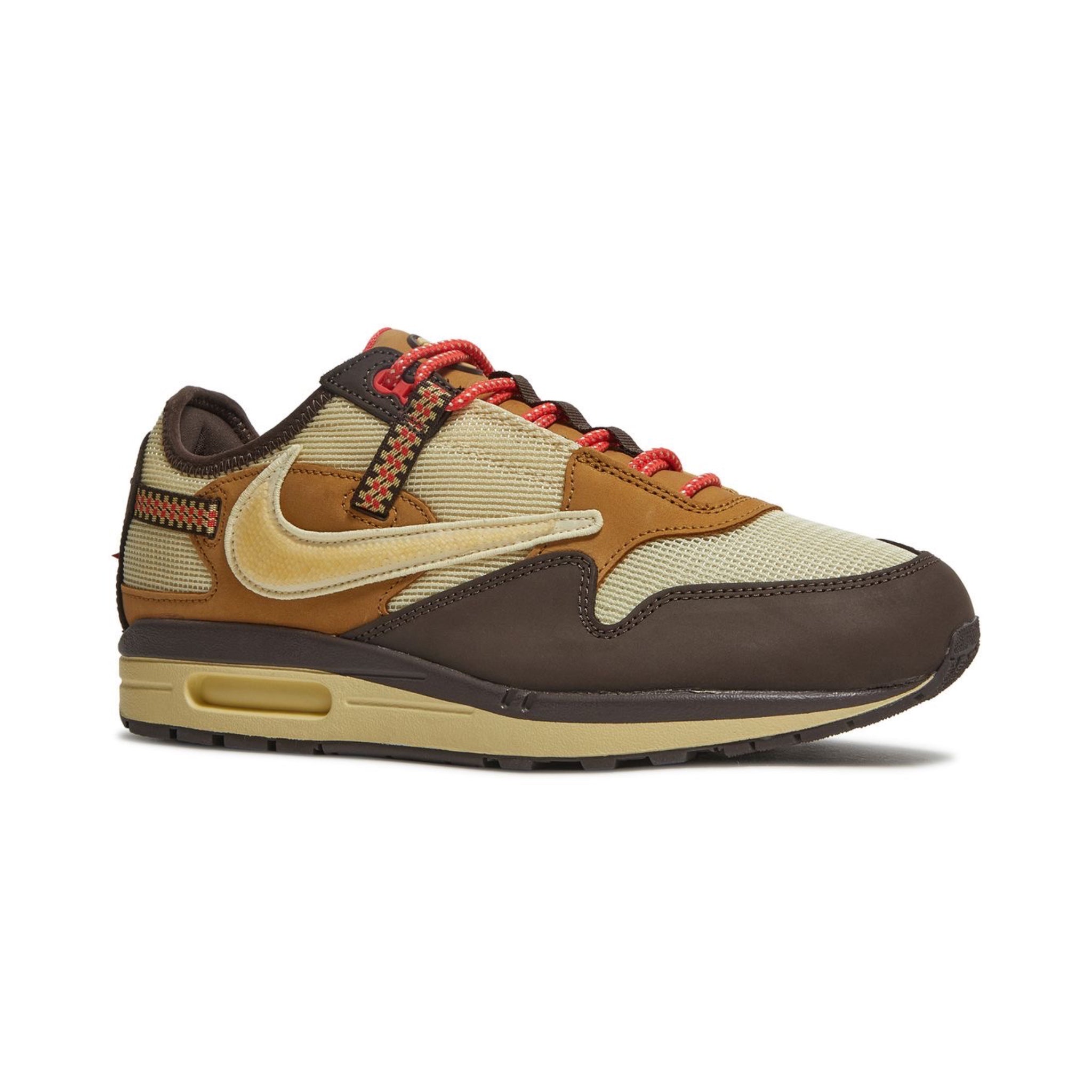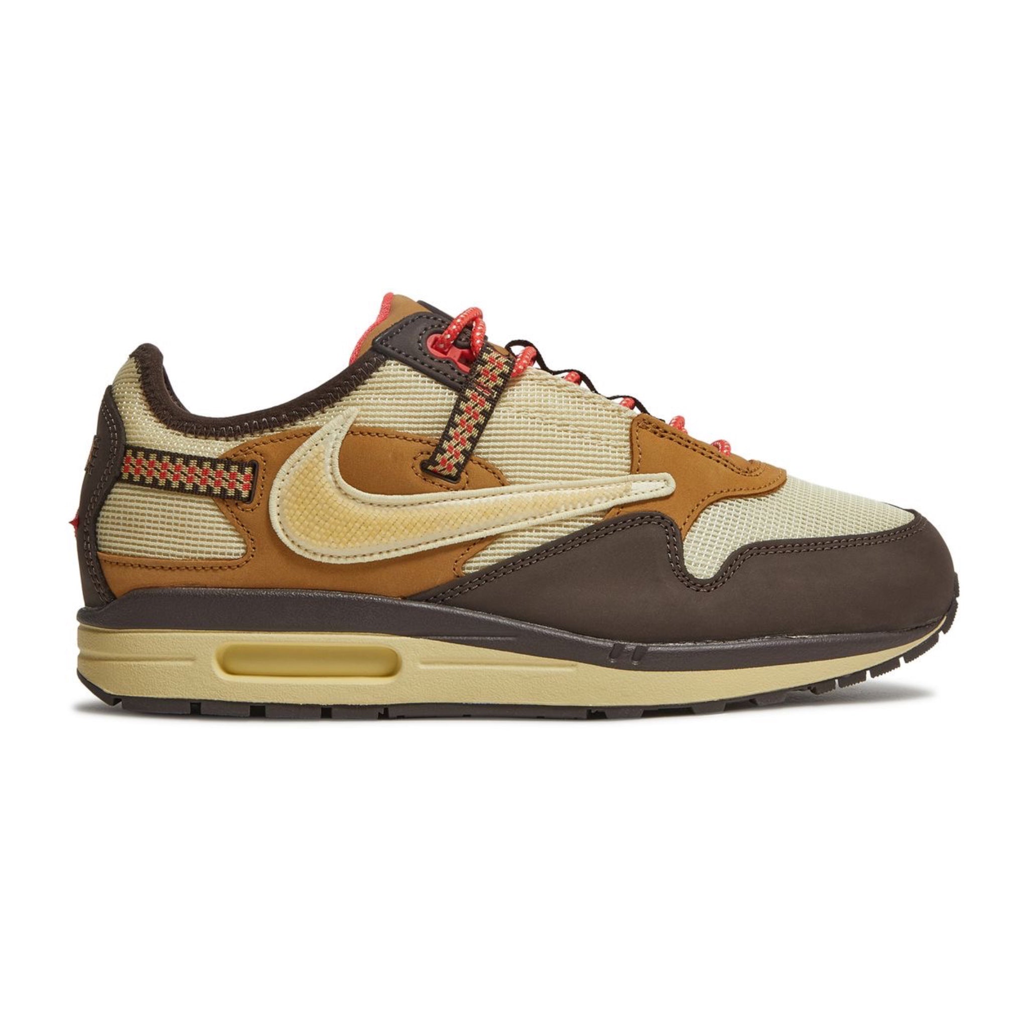 The iconic runner gets a rugged outdoor-inspired makeover in the Travis Scott x Nike Air Max 1 'Baroque Brown.' Red hiker-style laces tie over a cream-colored mesh upper with dark tan leather overlays and a brown nubuck mudguard. The rapper's signature reverse Swoosh is on the lateral quarter panel in a Lemon Drop finish with multicolor woven straps that are integrated into the laces and heel overlay. The latter consists of a crimson triangular patch accompanied with Cactus Jack branding on the right shoe and the signature Nike logo is on the left. It's built on a two-tone foam midsole that's fitted with Air-sole cushioning in the heel and supported by a waffle-traction rubber outsole.
