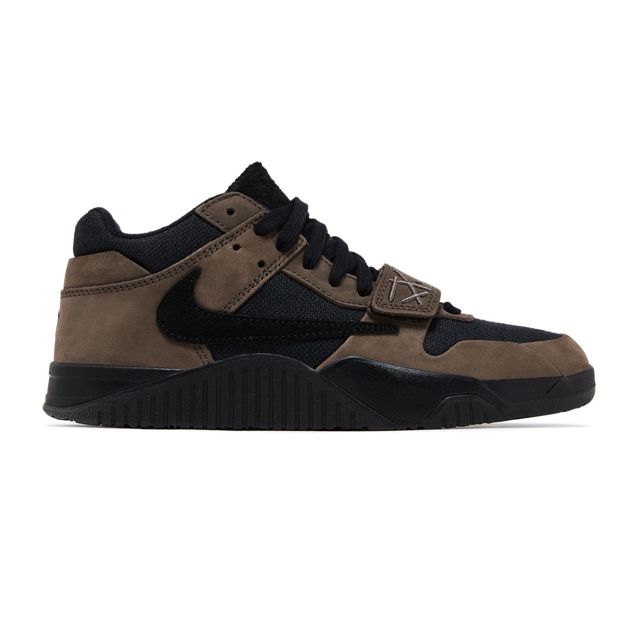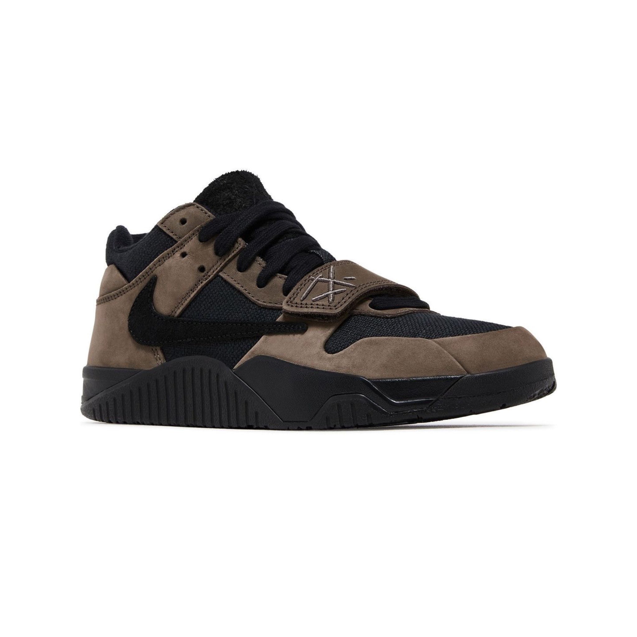 The Travis Scott x Jordan Jumpman Jack TR 'Dark Mocha' dons La Flame's signature reverse Swoosh in black suede, matching the black canvas upper and complementing the brown nubuck overlays. The Jumpman logo adorns the tongue, while the Cactus Jack smiley logo graces the heel area. 'TS' is embroidered on the adjustable forefoot strap, while an oversized 'Jack' graphic can be seen on the black rubber outsole. The matching black foam midsole above keeps every step plush and comfortable.