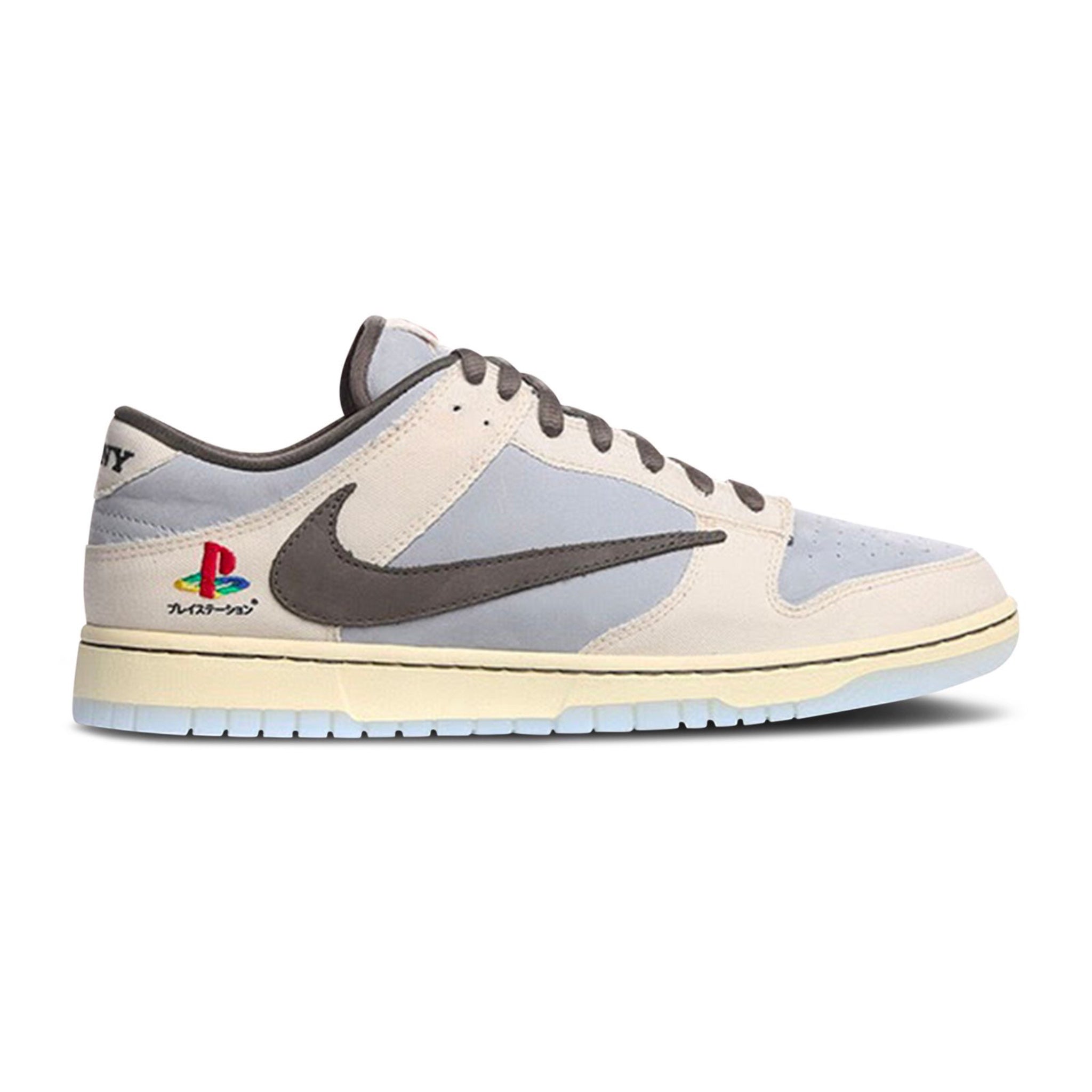 The Travis Scott x Playstation x Dunk Low released as part of Travis Scott's promotional push for the PlayStation 5. Originally teased through Scott's social media channels in October 2020, and eventually released through a raffle, the shoe emerges with a suede and textile construction throughout the upper. A backwards Swoosh stands out on the side wall, with a PlayStation logo on the lateral heel. The heel patch includes the Sony logo, while underfoot, the rubber outsole reveals 'PlayStation' in English on the right shoe and Japanese characters on the left.