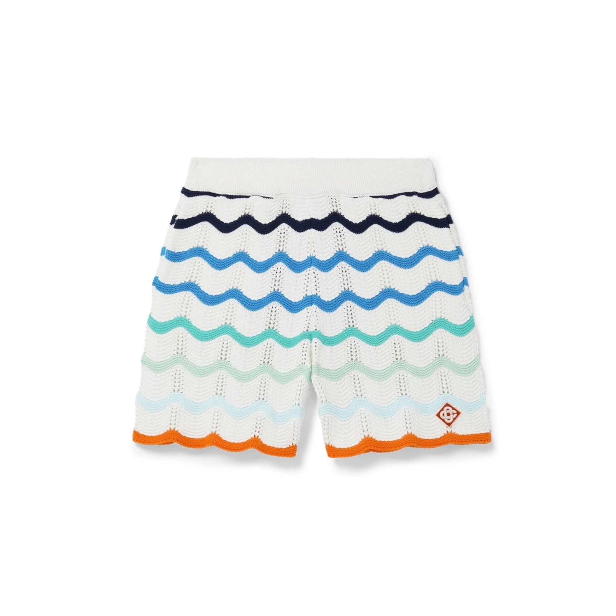 The Gradient Wave crochet shorts are a classic design crafted from gradient wave crochet cotton fabric featuring the house's Memphis wave-inspired design element in gradient colours tying back to the capsule’s travel and vacation theme. Completed with a ribbed waistband, drawstring fastening, and contrast edge detail on the hem.