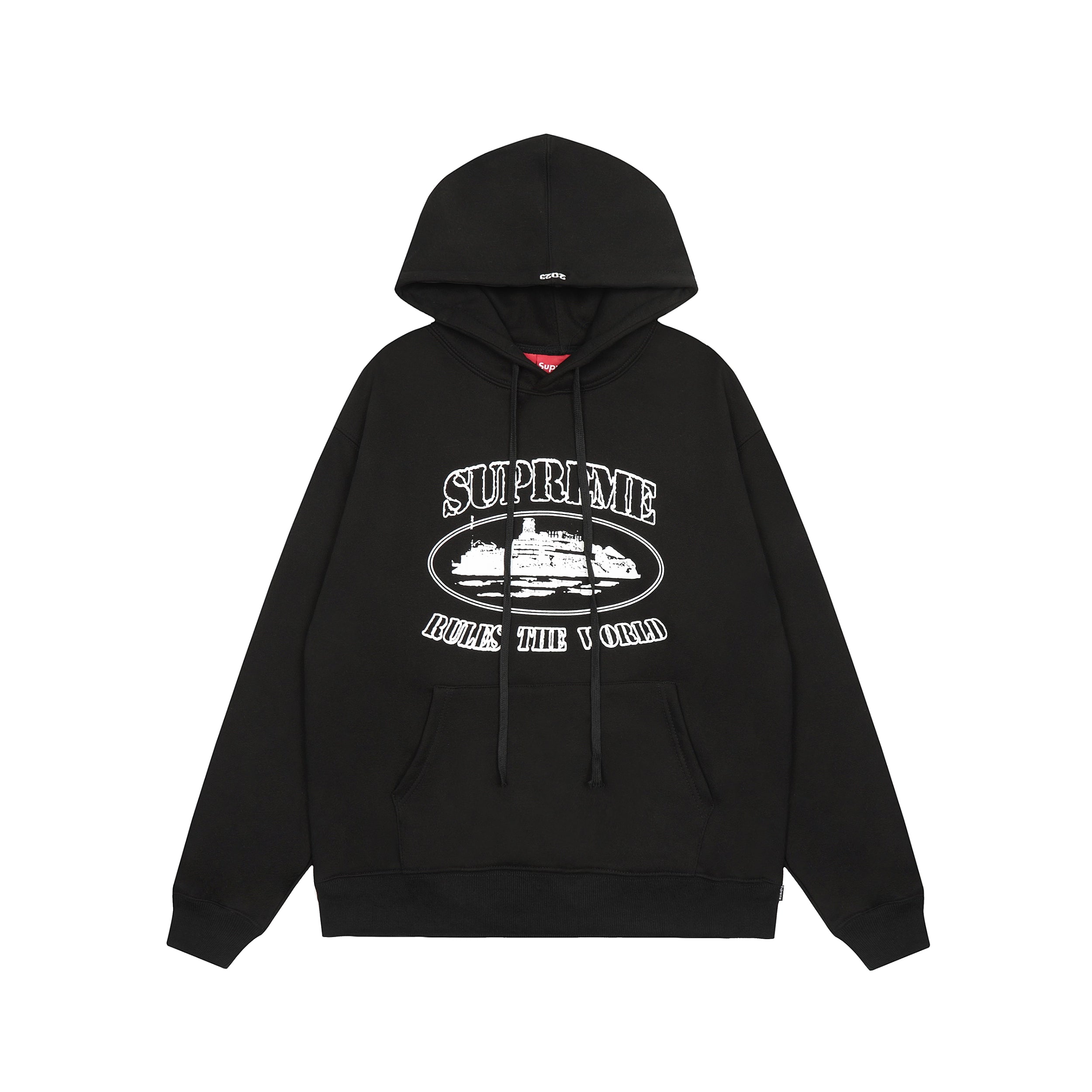 The Supreme x Corteiz Hoodie features a bold front print declaring "Rules the World," complemented by a distinctive letter design on the back. Crafted for those who appreciate streetwear with a statement, this hoodie combines iconic branding with a contemporary edge, offering both style and comfort for everyday wear.