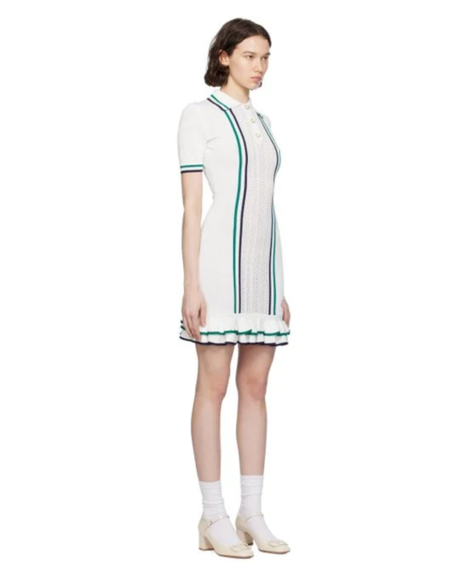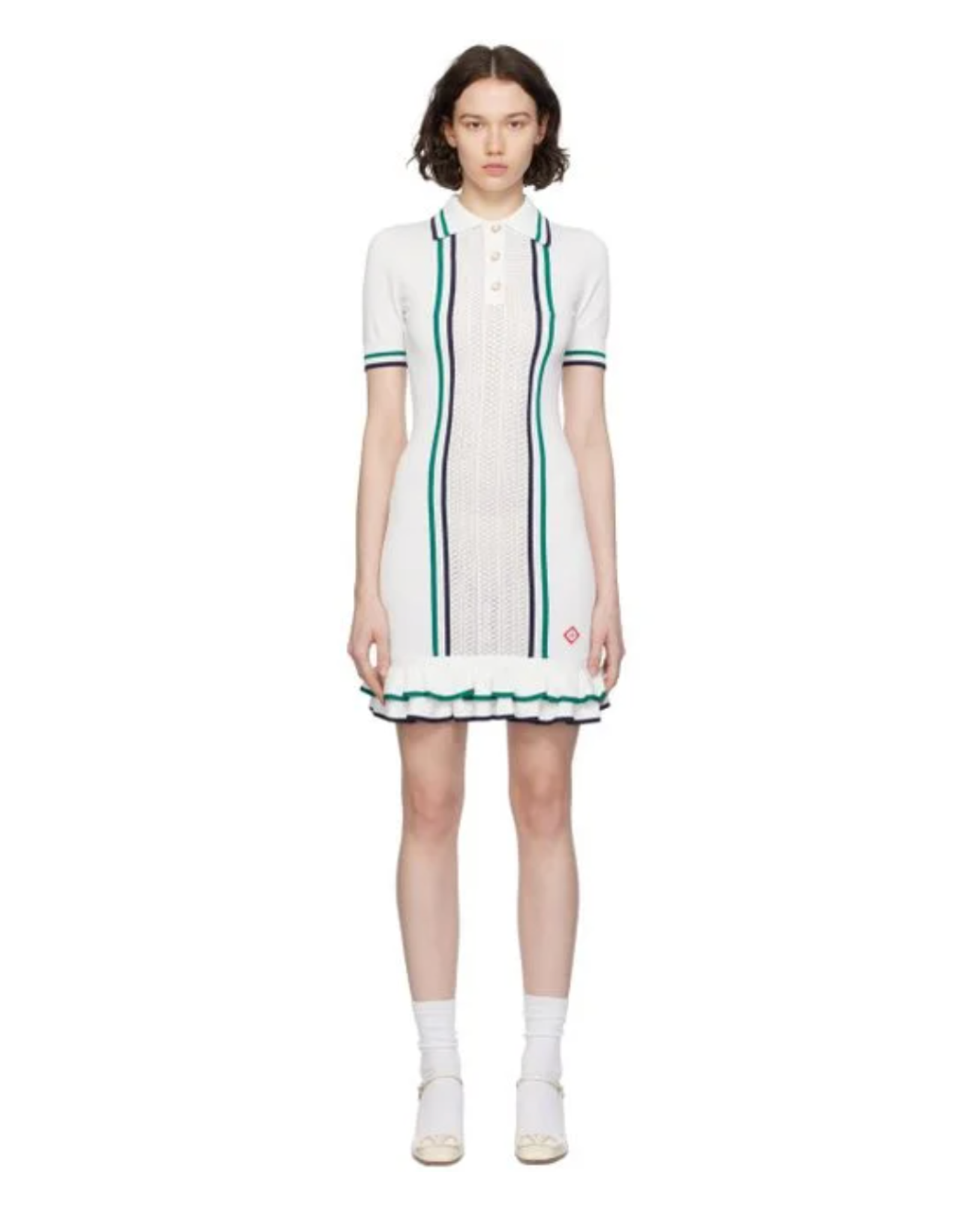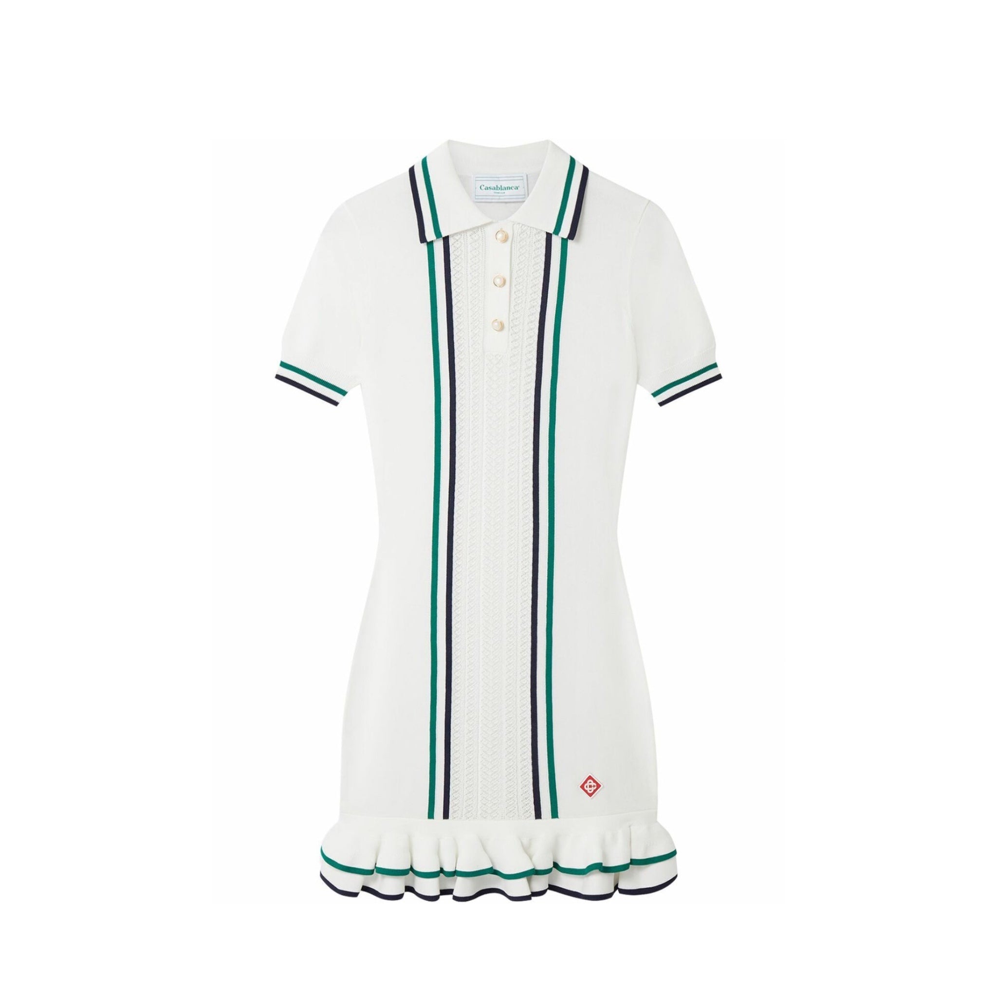 The Casablanca Pointelle Tennis Mini Dress combines classic sporty elegance with delicate craftsmanship. Featuring a breathable pointelle knit, this mini dress offers lightweight comfort and subtle texture, ideal for warm days on or off the court. Its tailored silhouette ensures a flattering fit, while the refined design details elevate your athletic-inspired wardrobe with expert sophistication.
