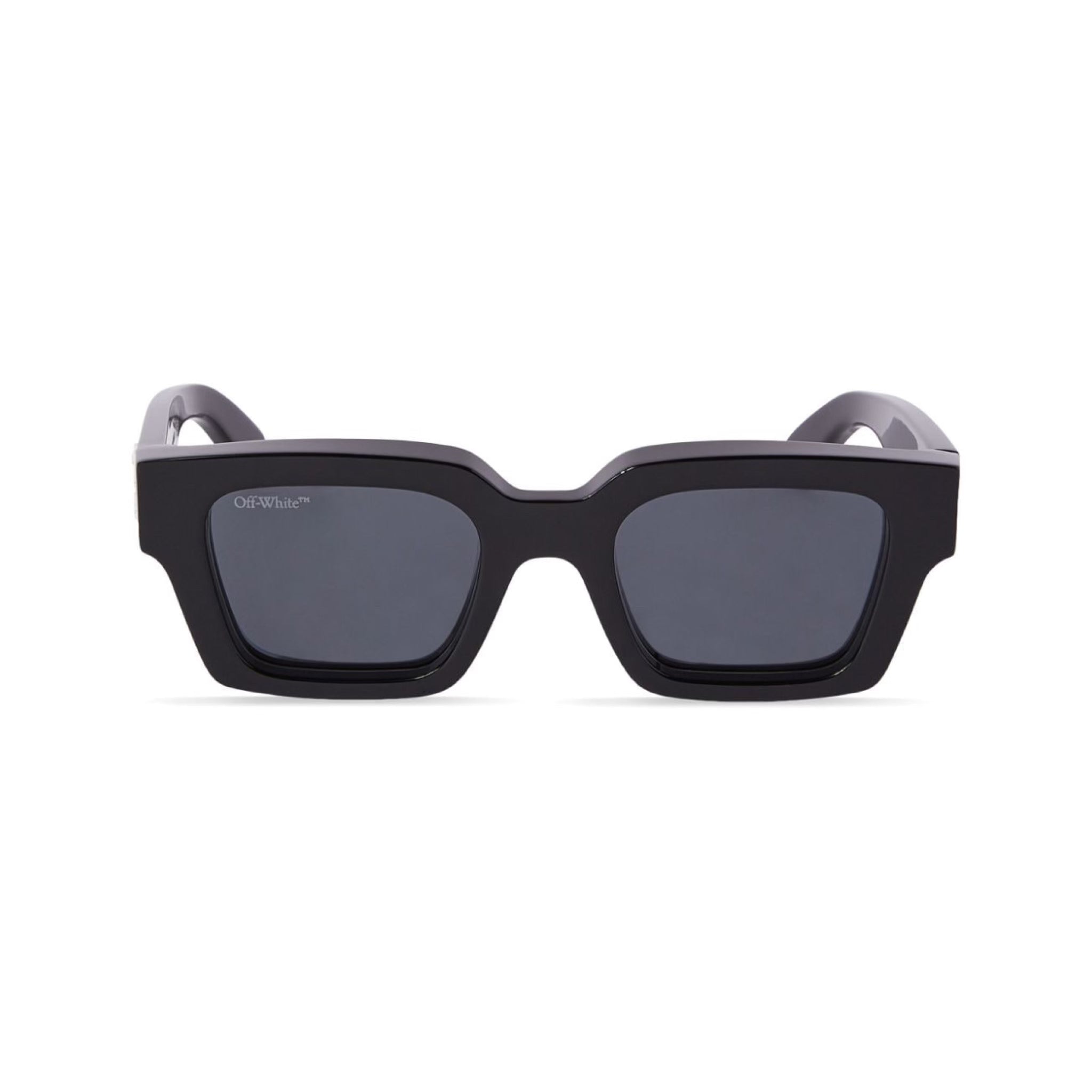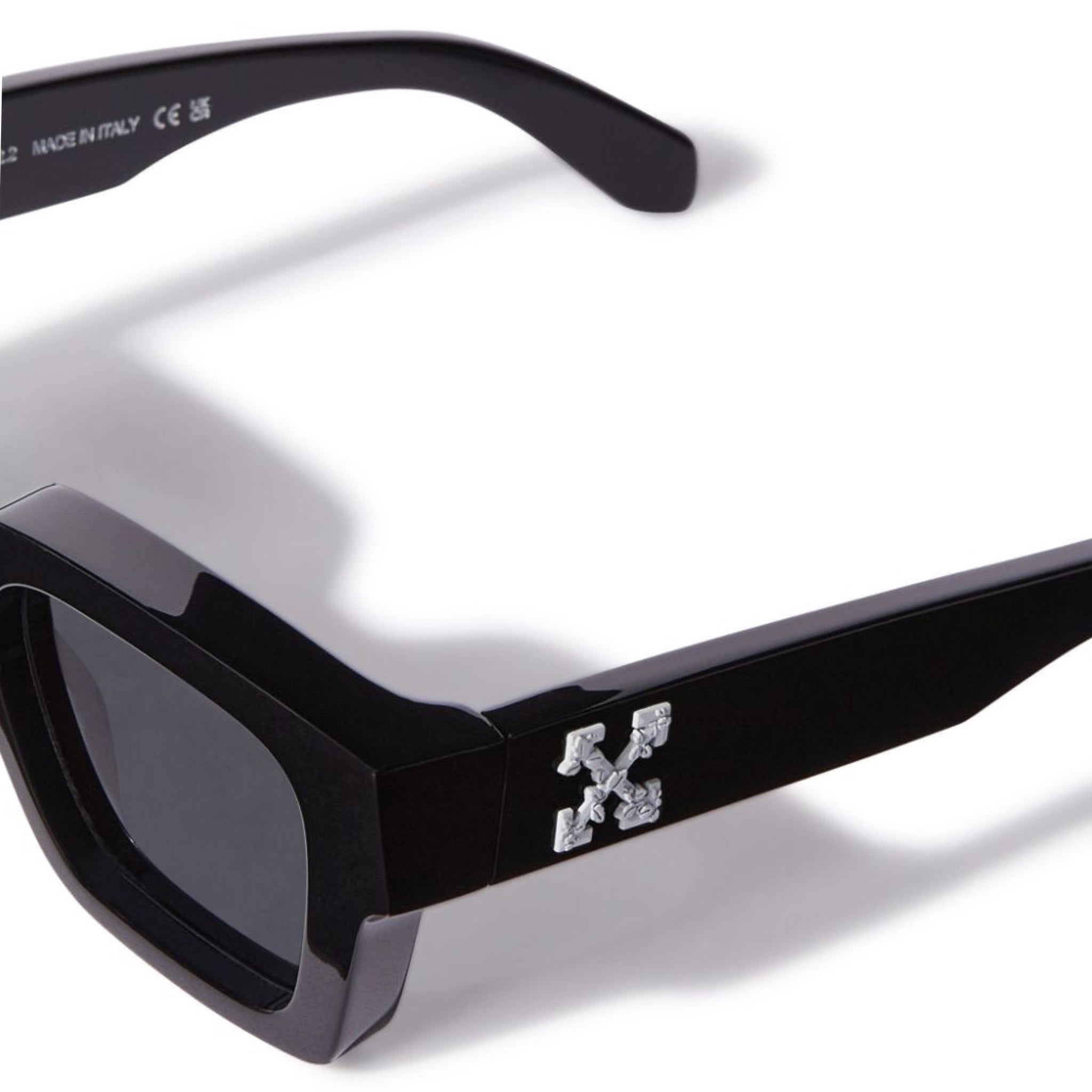 A white Arrows motif plaque adorns the arm of Off-White's Virgil sunglasses, adding a branded finish to the rectangular design.