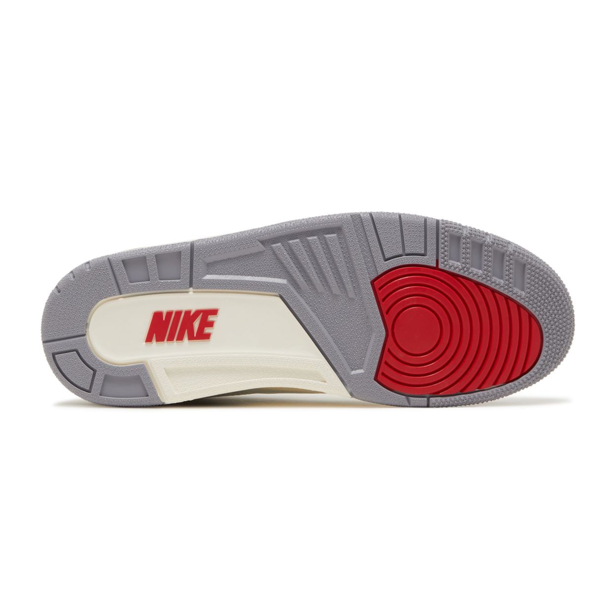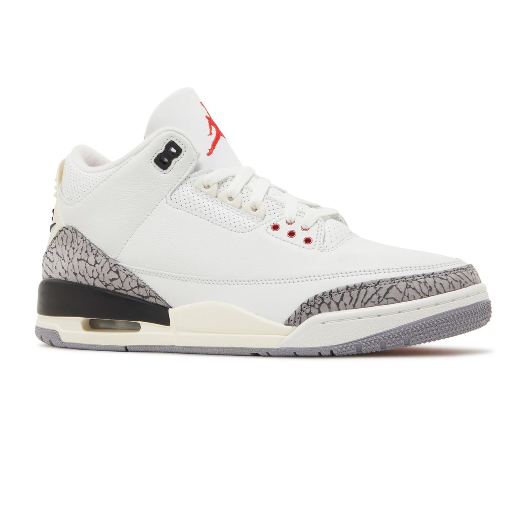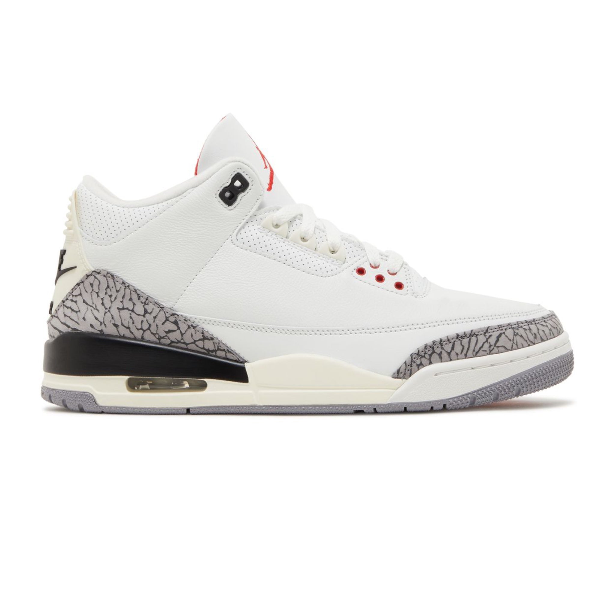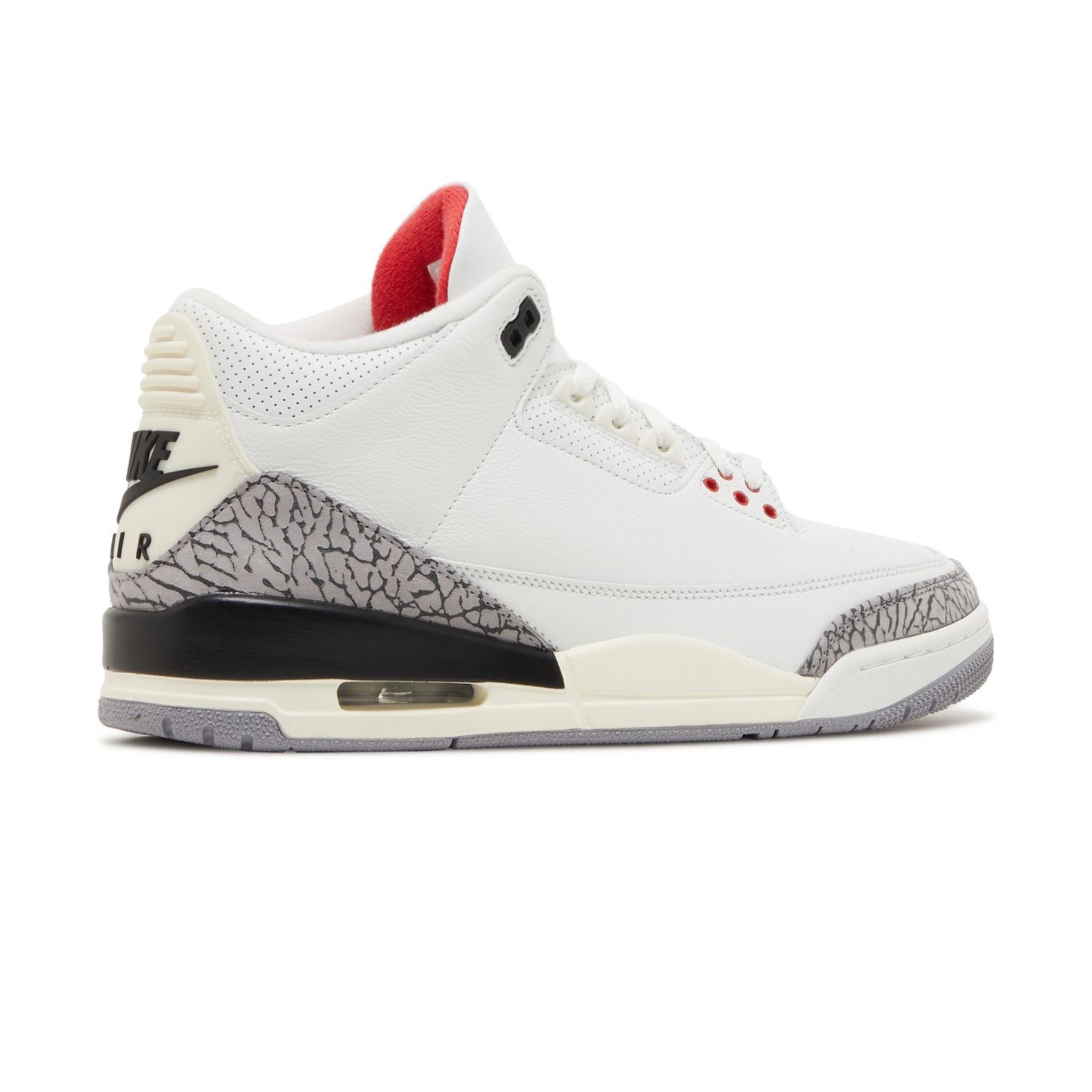 Commemorating 35 years of a classic silhouette, the Air Jordan 3 Retro 'White Cement Reimagined' marks the return of an original colorway and duplicating the build of the original 1988 model. The upper combines white leather with overlays on the heel and toe in the trademark elephant print that designer Tinker Hatfield introduced, with Varsity Red pops on the tongue’s Jumpman branding and the lace loops. Additional branding appears on the heel tab with ‘Nike Air.’ Comfort underfoot is ensured by a visible Air-sole unit and the back heel and midsole are imbued with an aged yellow tint to showcase a vintage look.