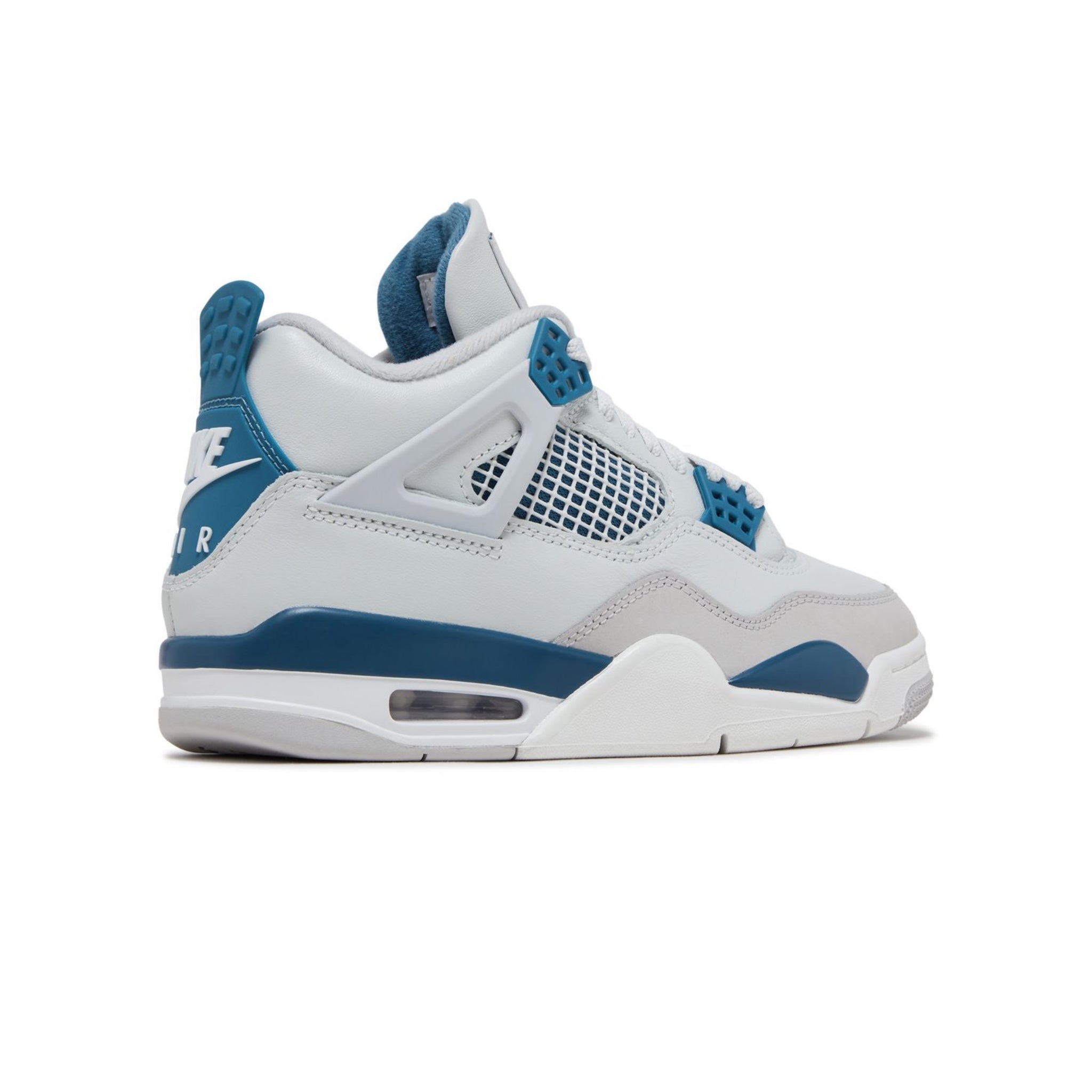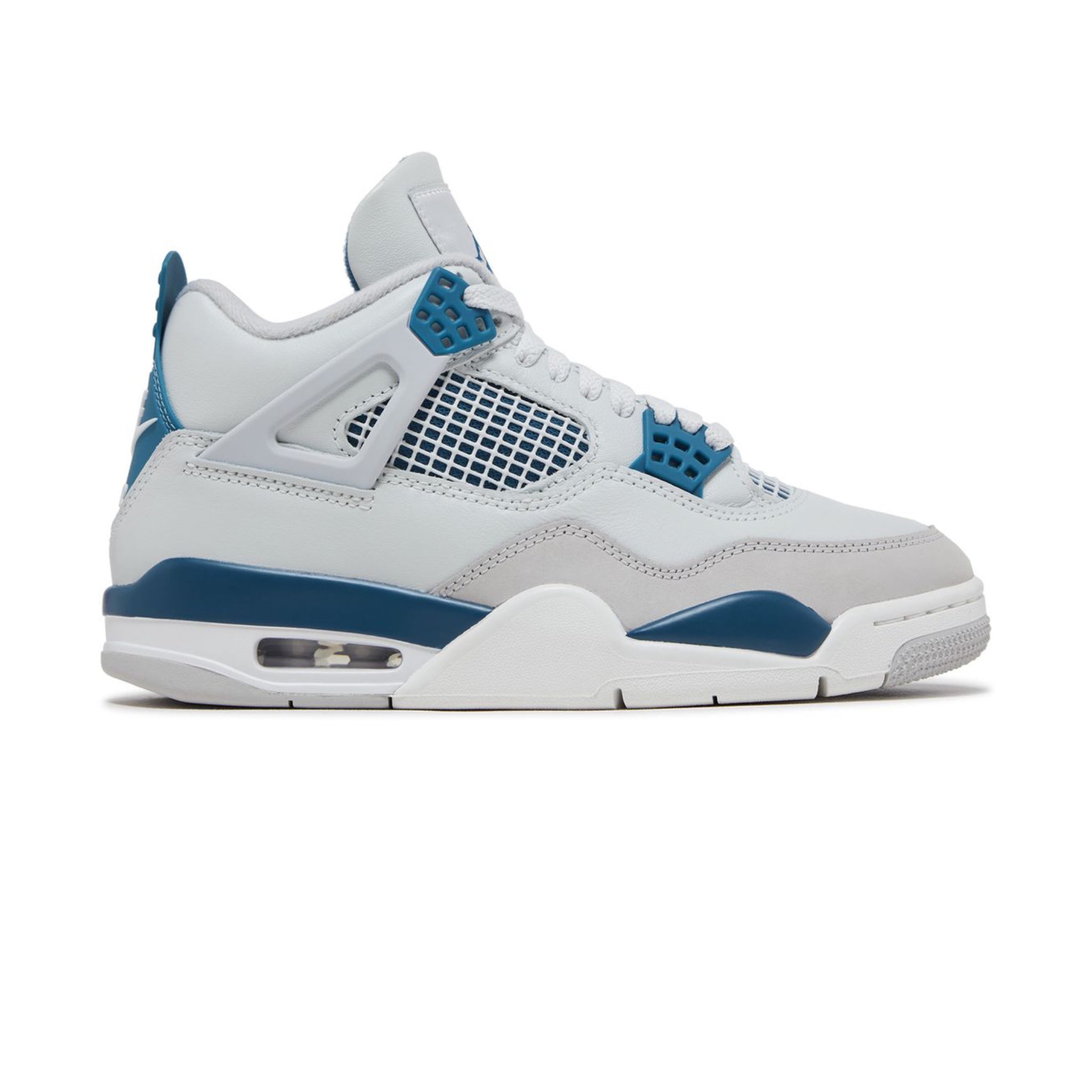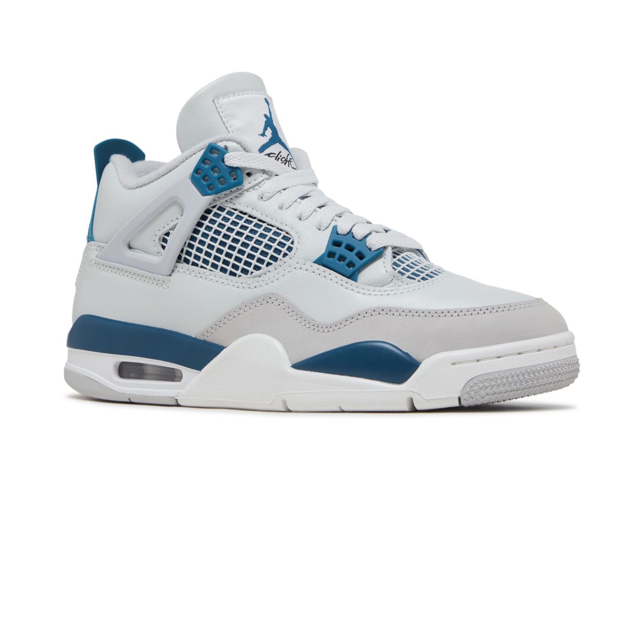 Bringing back a classic OG colorway, the 2024 version of the Jordan 4 Retro 'Military Blue' also known as 'Industrial Blue' returns with an off-white leather upper and nubuck forefoot overlays. The blue Jumpman logo decorates the tongue tag, matching the color of the molded eyelets, back tab and the underneath of the side panel netting. These shoes have a lightweight midsole with an encapsulated Air-sole forefoot unit and a visible Air bag in the heel.