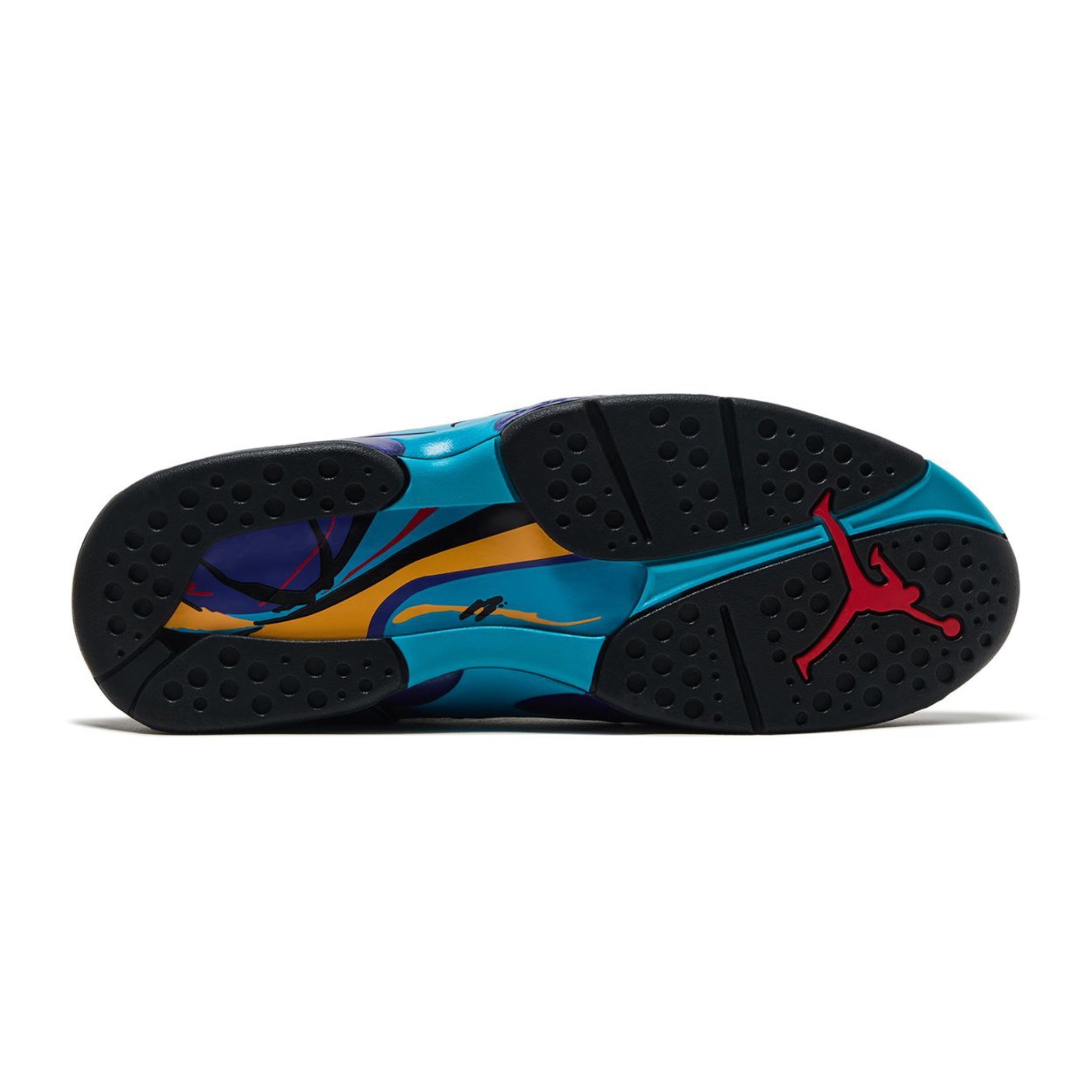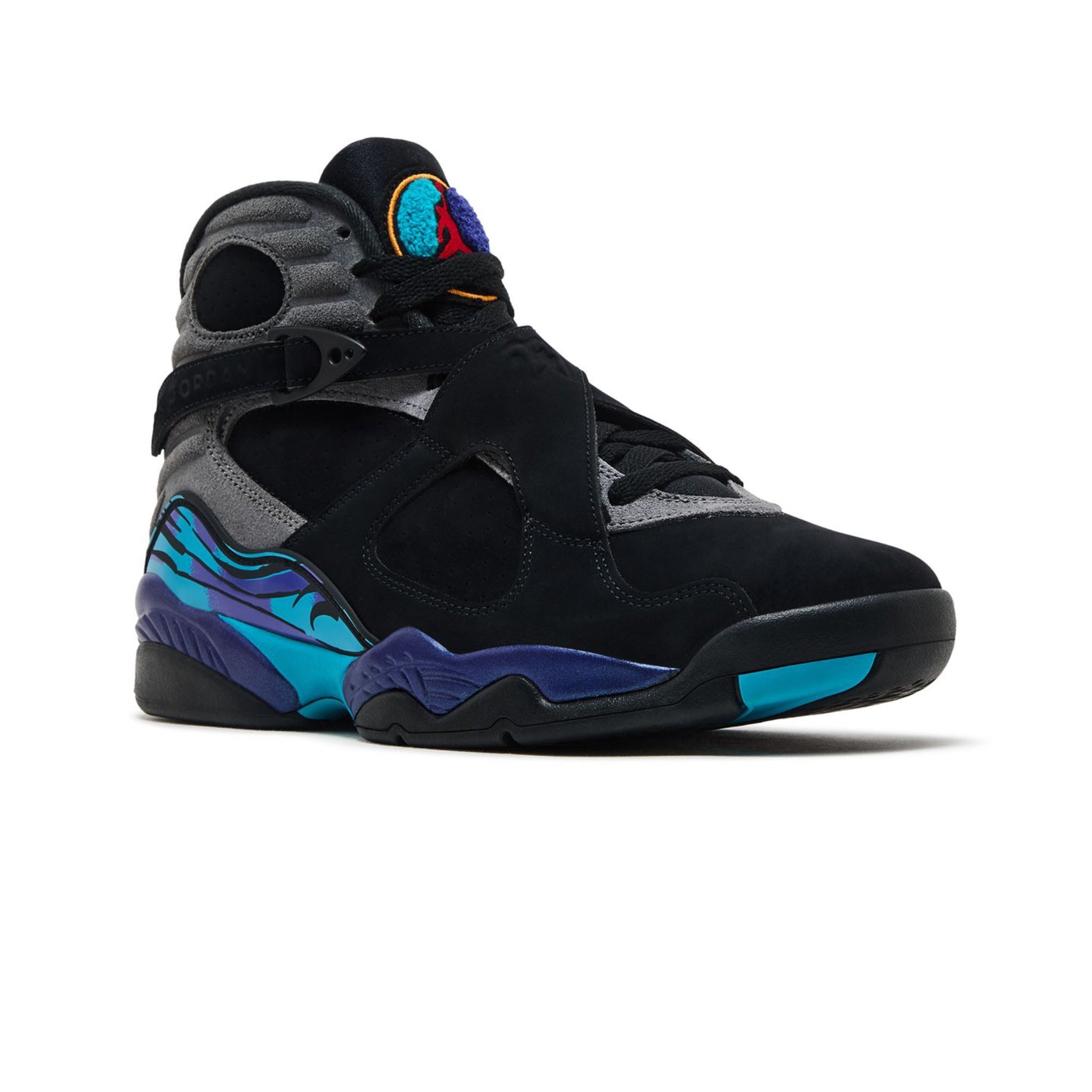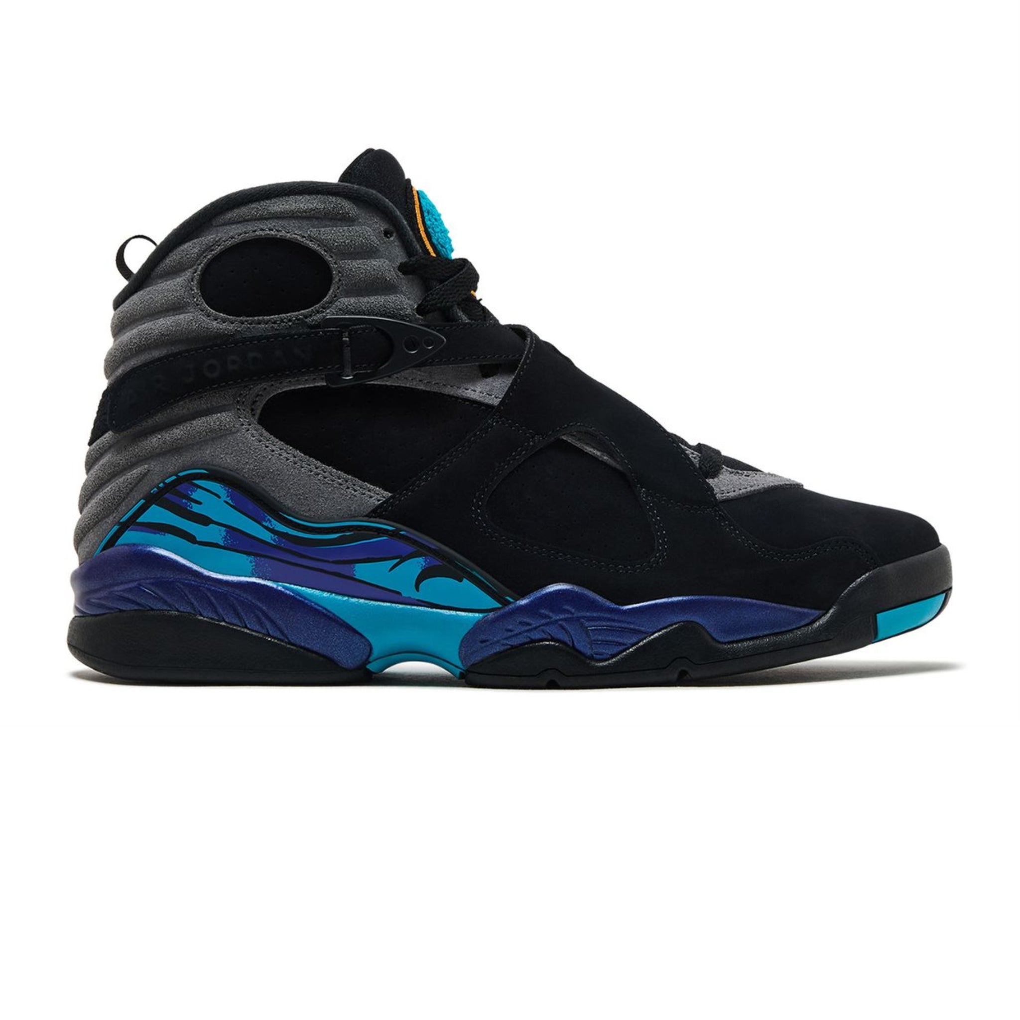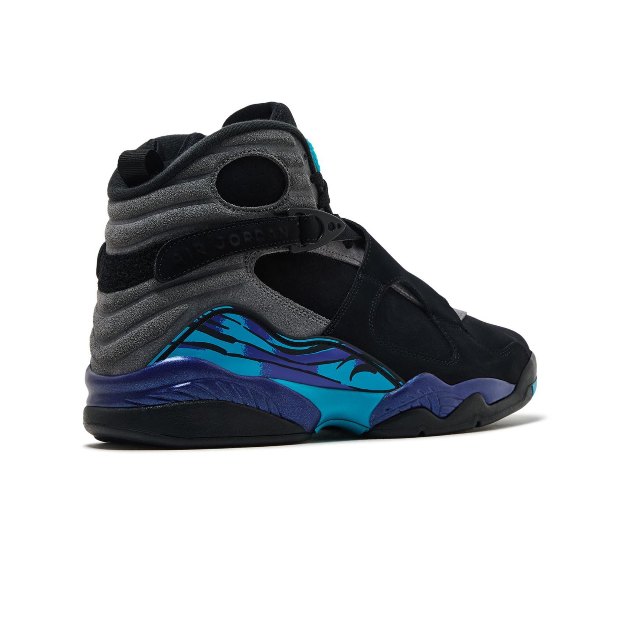 The 2025 version of the Air Jordan 8 Retro 'Aqua' uses teal and purple hues on the foam midsole, which packs Nike Air in the forefoot and heel areas. Loyal to the original 1993 design, these sneakers have a black and grey nubuck upper secured with a unique cross-strap design. The signature multicolor chenille tongue tag is stamped with a red Jumpman logo, and a teal support panel that sports purple brush strokes.