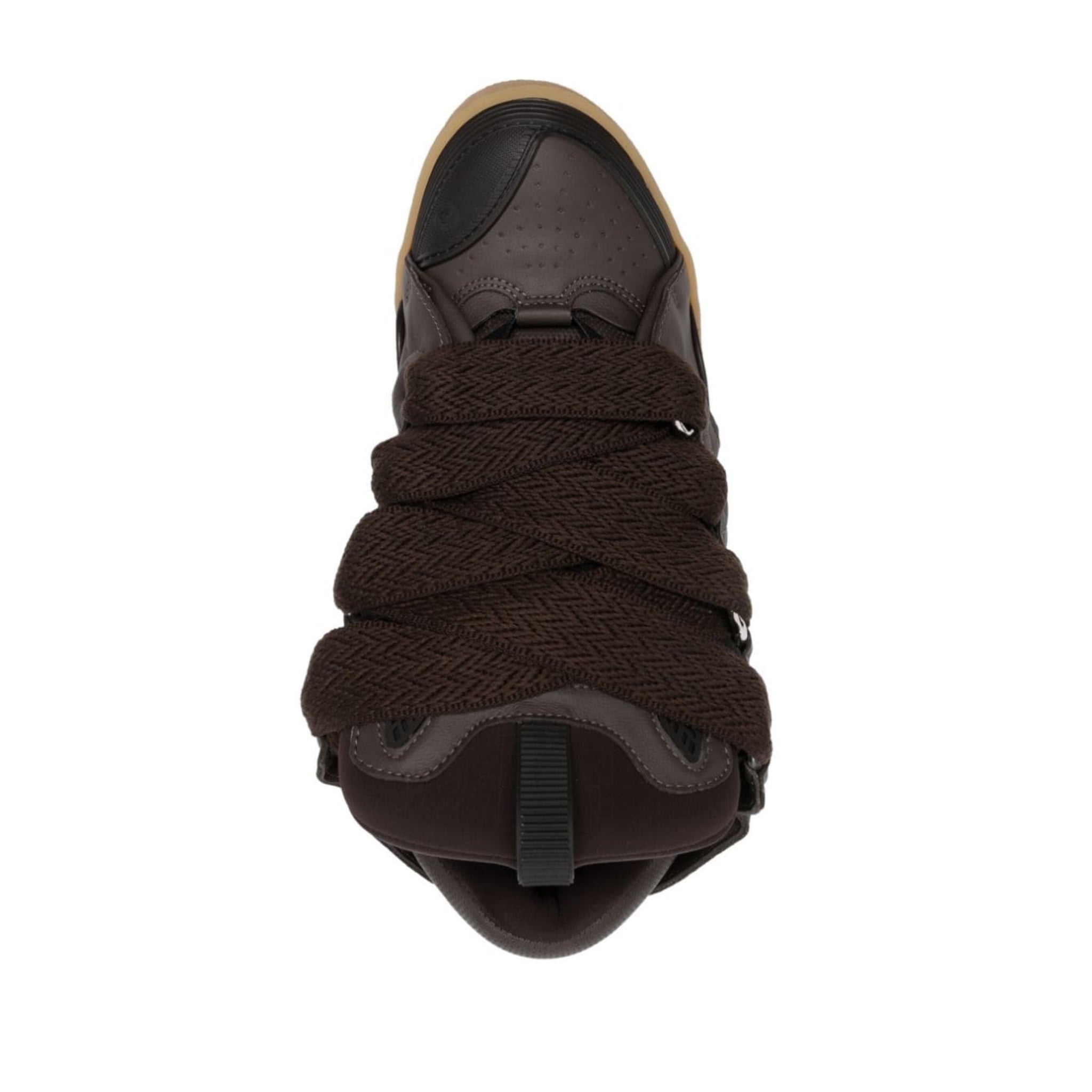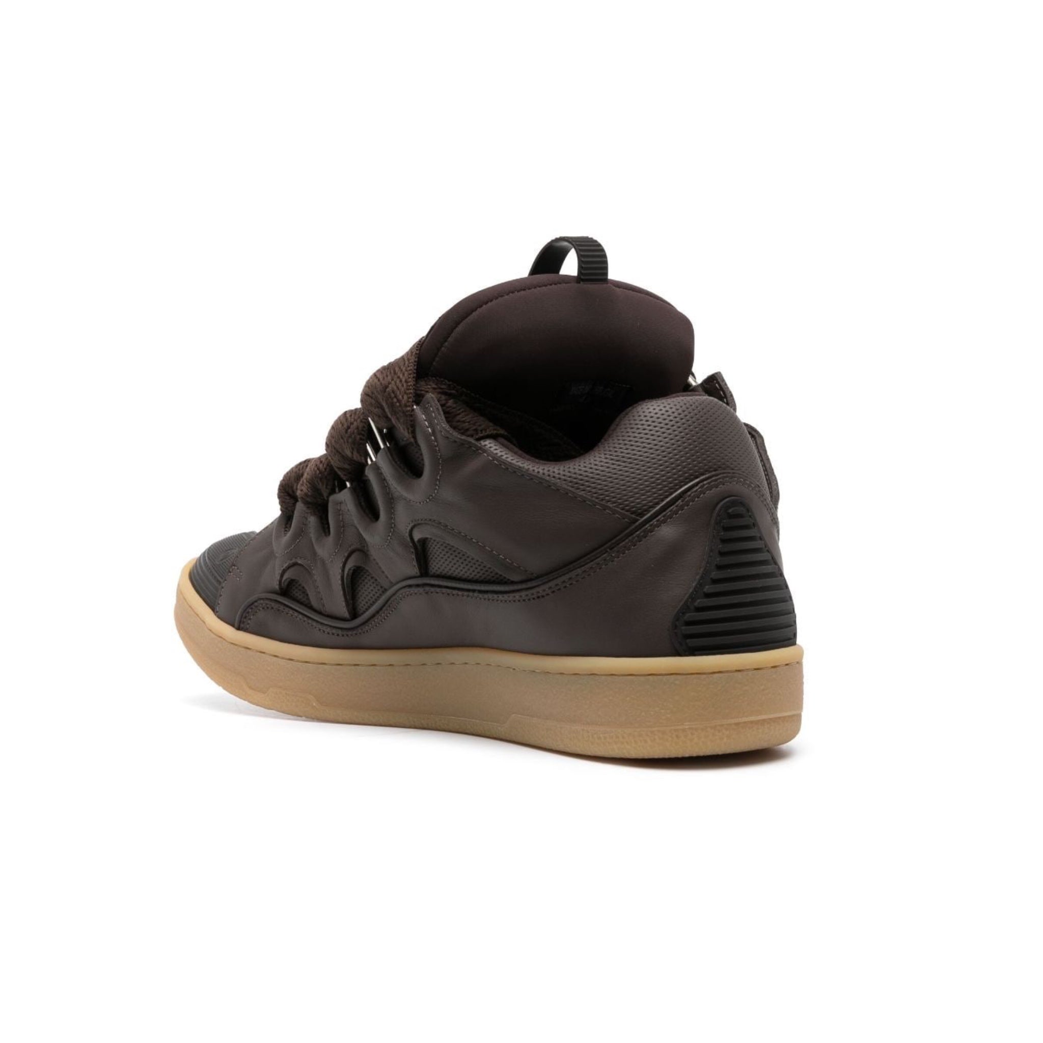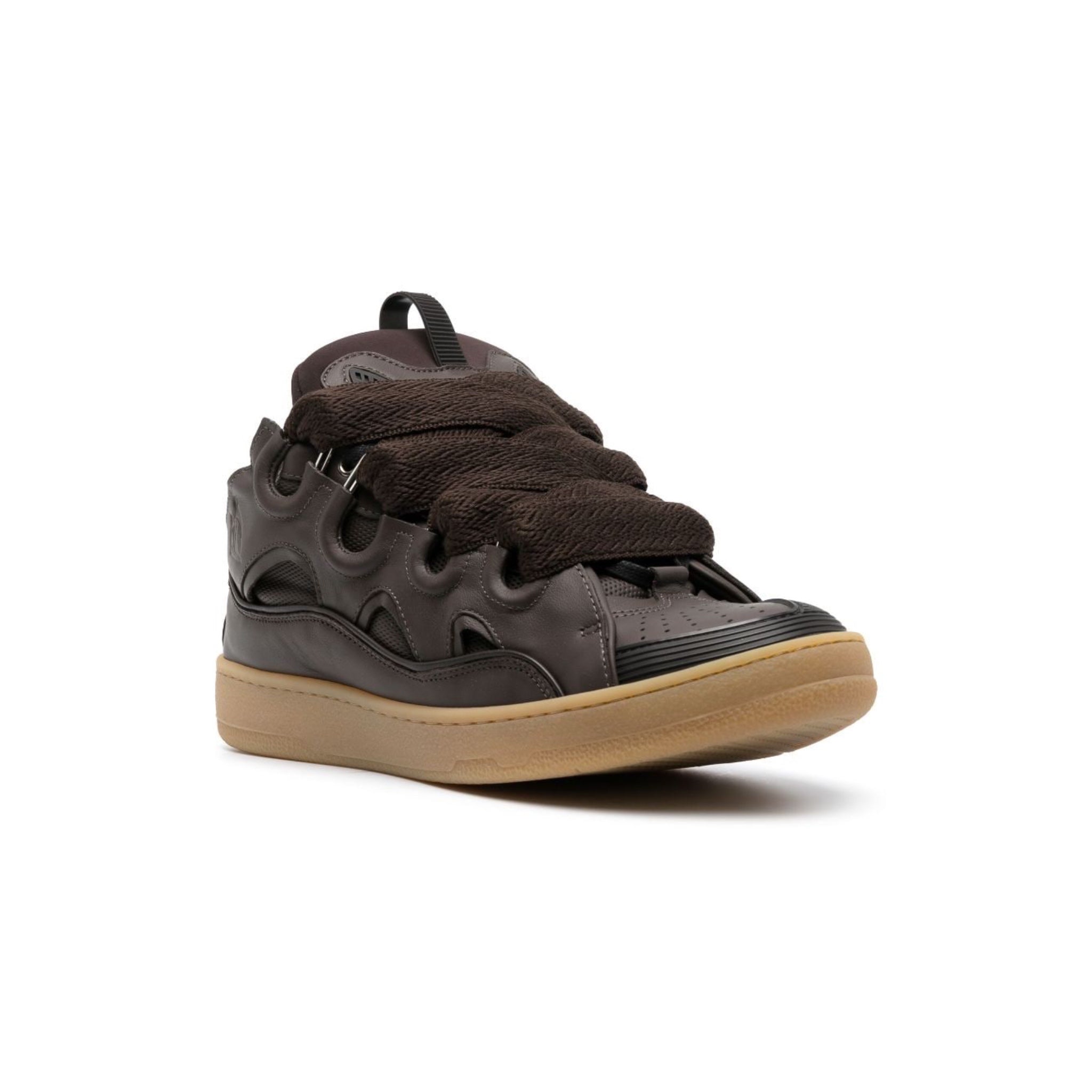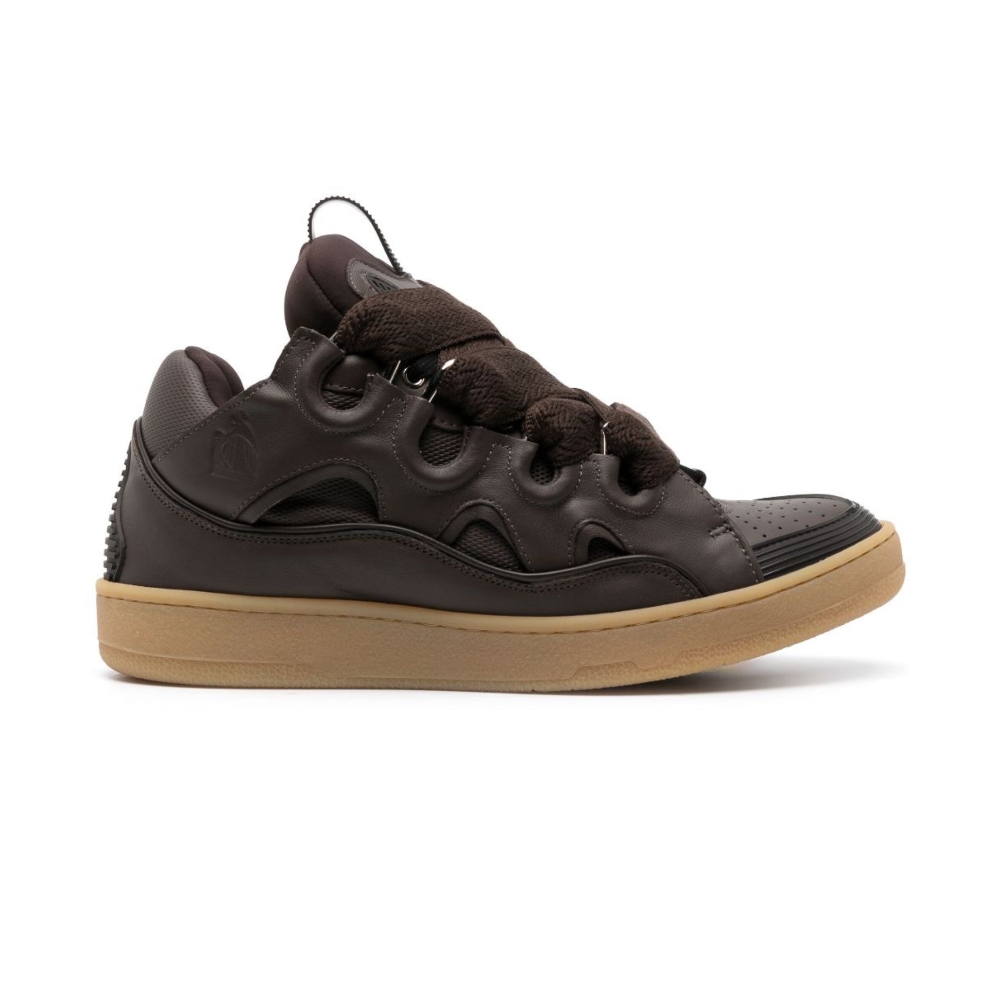 For SS23, Lanvin introduces a deep brown iteration of the Curb sneakers: a '90s-inspired silhouette distinguished by its exaggerated proportions. Crafted from a leather and mesh-layered upper, they stand out for their oversized laces and extended padded tongue, subtly adorned with the label's signature Mother and Child logo.