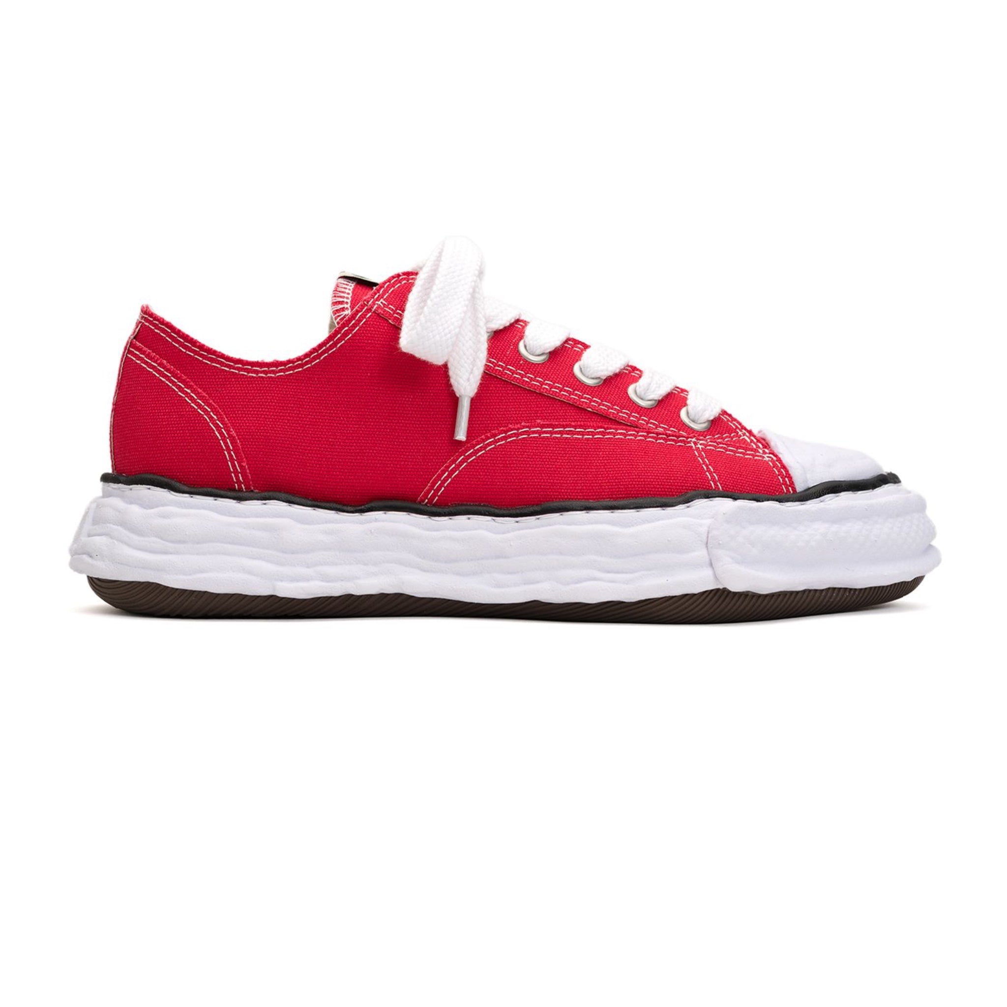 Maison Mihara Yasuhiro's Peterson 23 sneakers demonstrate the brand's avant-garde aesthetic. They’re crafted from red canvas to a low-top silhouette and grounded on the brand's Original Sole: it’s hand-modelled from clay by namesake designer, Mihara Yasuhiro, hence its irregular appearance.
