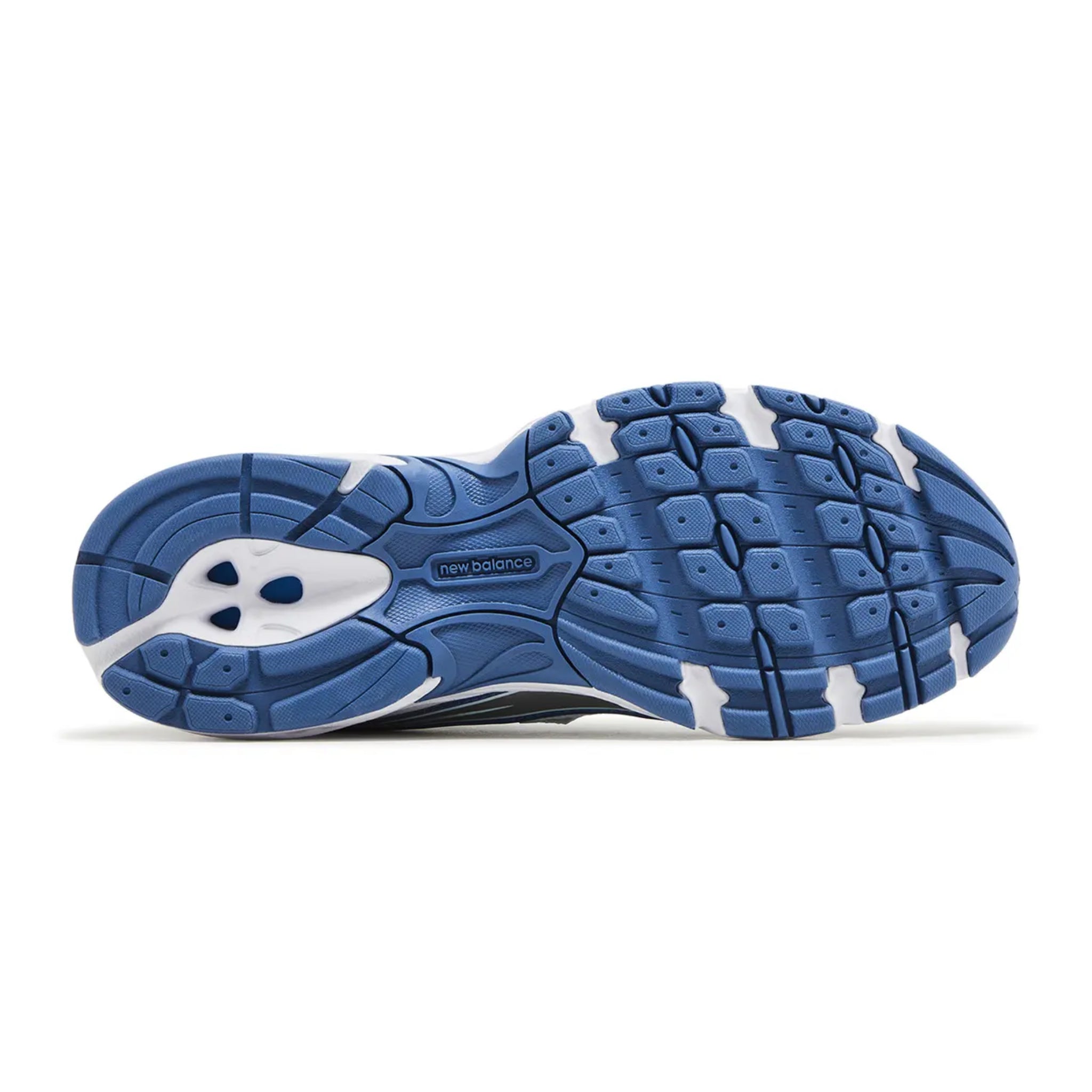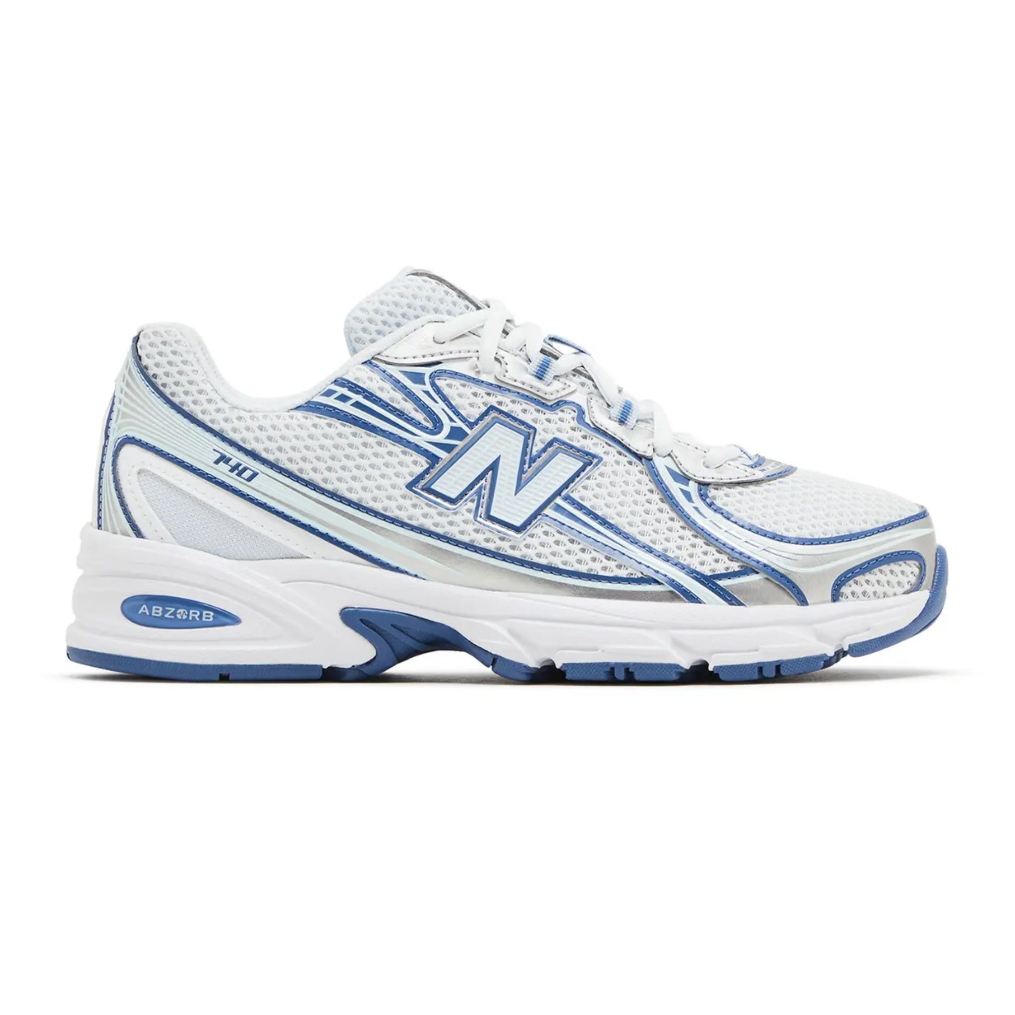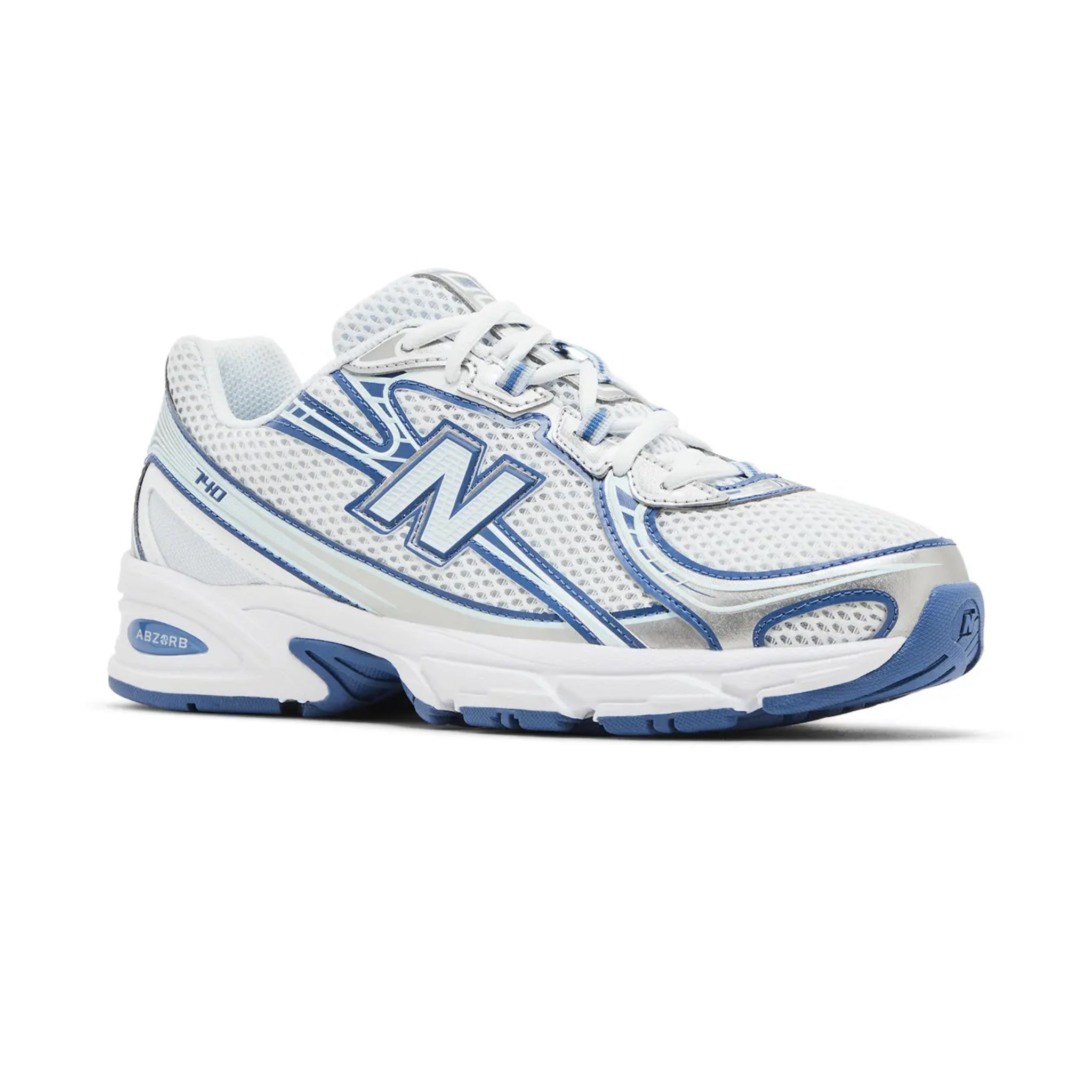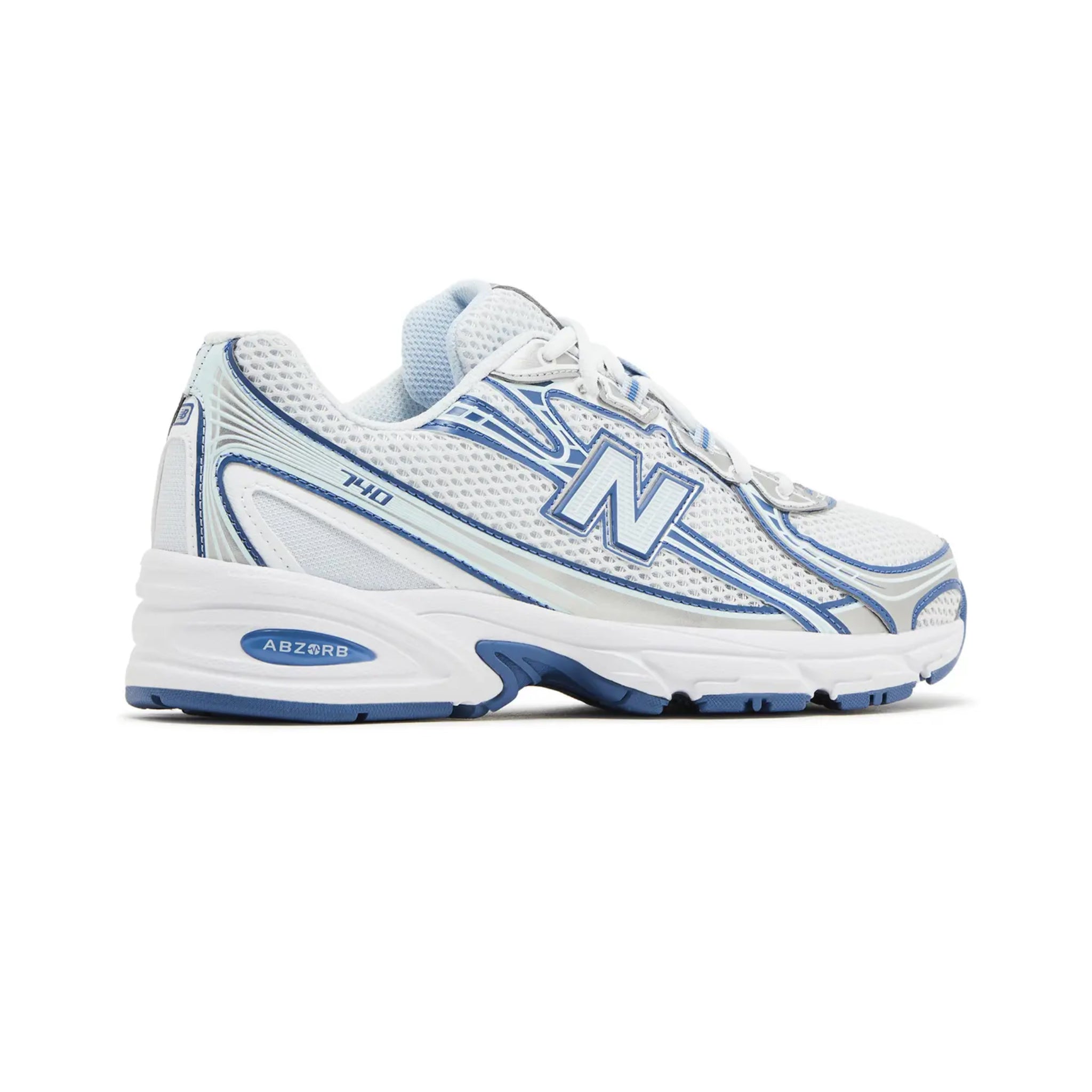 The New Balance 740v2 'Ice Blue' has a white open-cell mesh upper, bolstered with synthetic metallic silver overlays piped in a blue trim. A molded 'N' logo adorns the side panel, while a Flying NB badge is showcased on the heel. A white ABZORB midsole works in tandem with a blue rubber outsole.