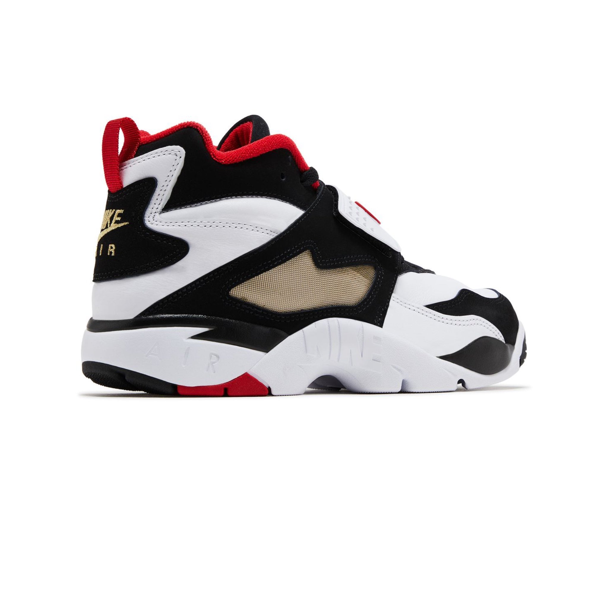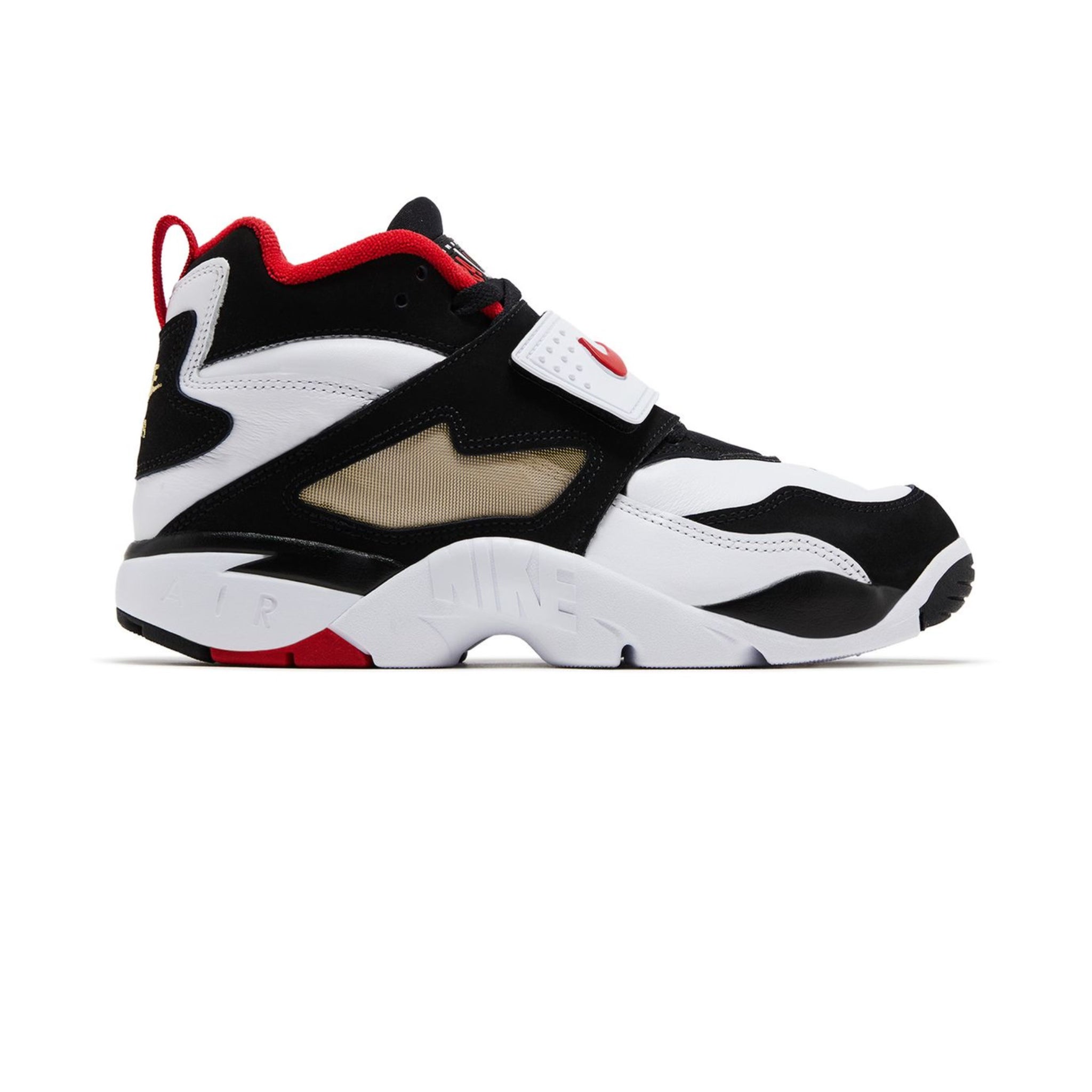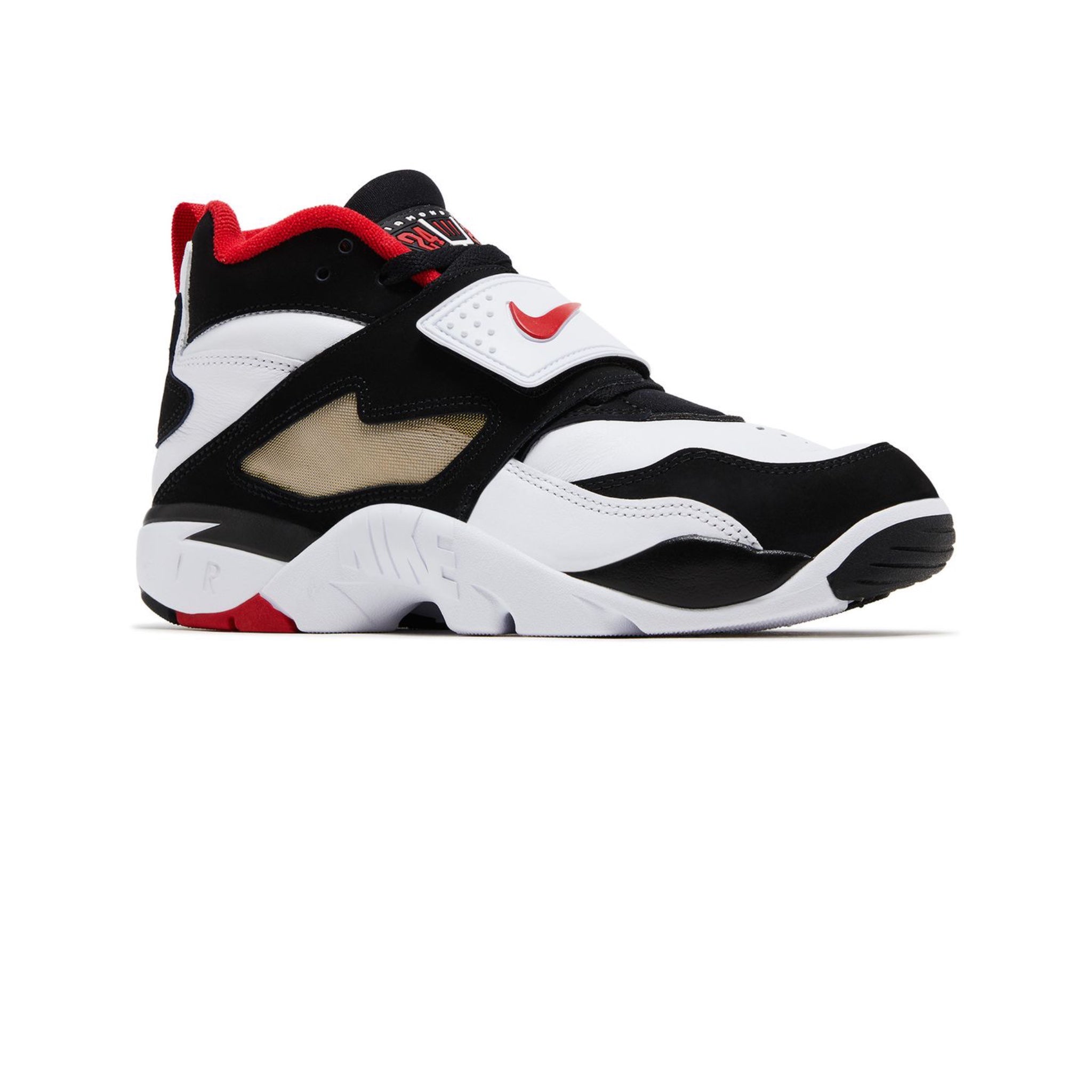 The 2025 edition of the Nike Air Diamond Turf '49ers' stays true to the original 1993 release, rocking a white and black leather upper secured with a wide midfoot strap. The latter gets an embossed red Swoosh, which matches the collar lining and the Nike Air logo on the heel. These kicks have a full-length foam midsole with encapsulated Air-Sole cushioning underfoot.
