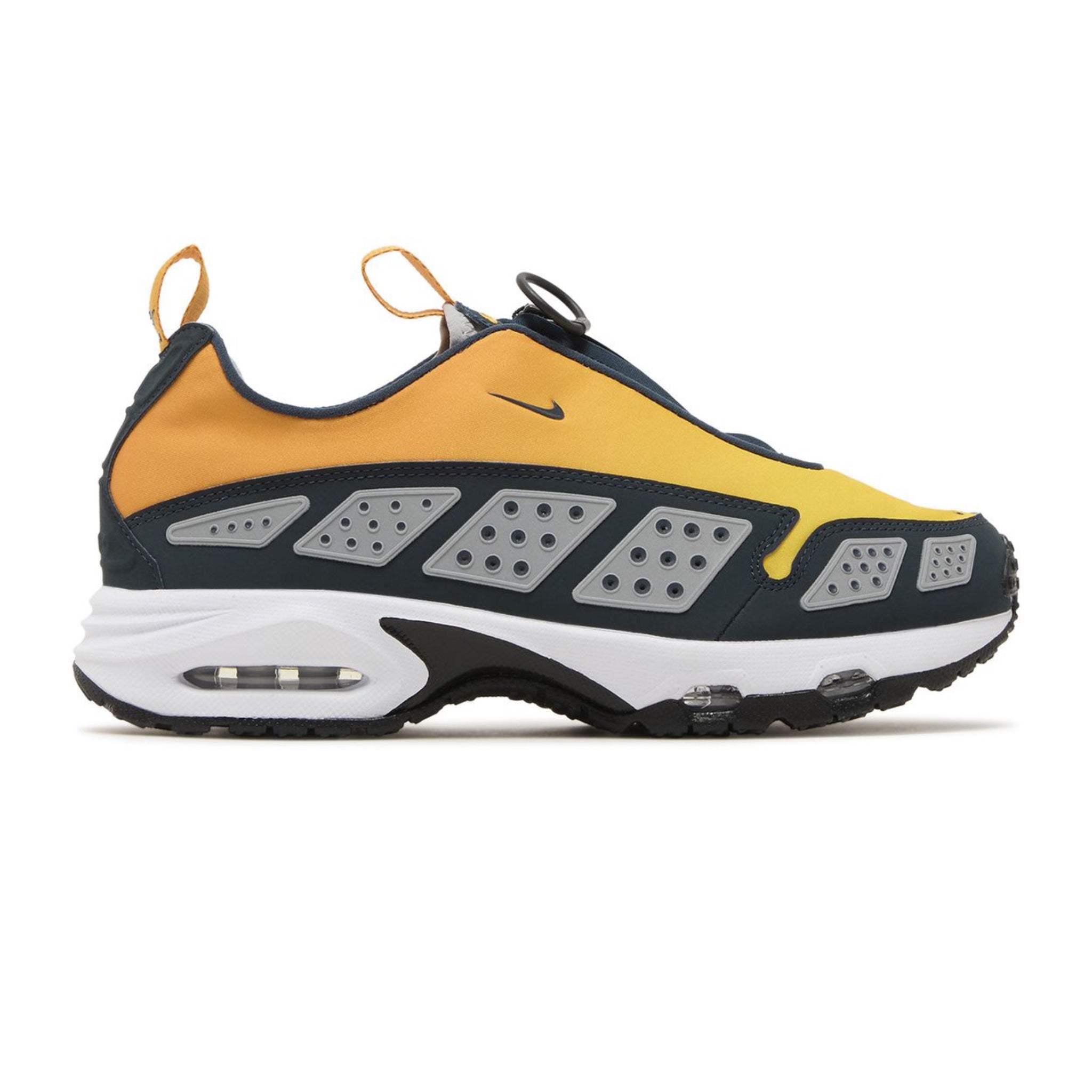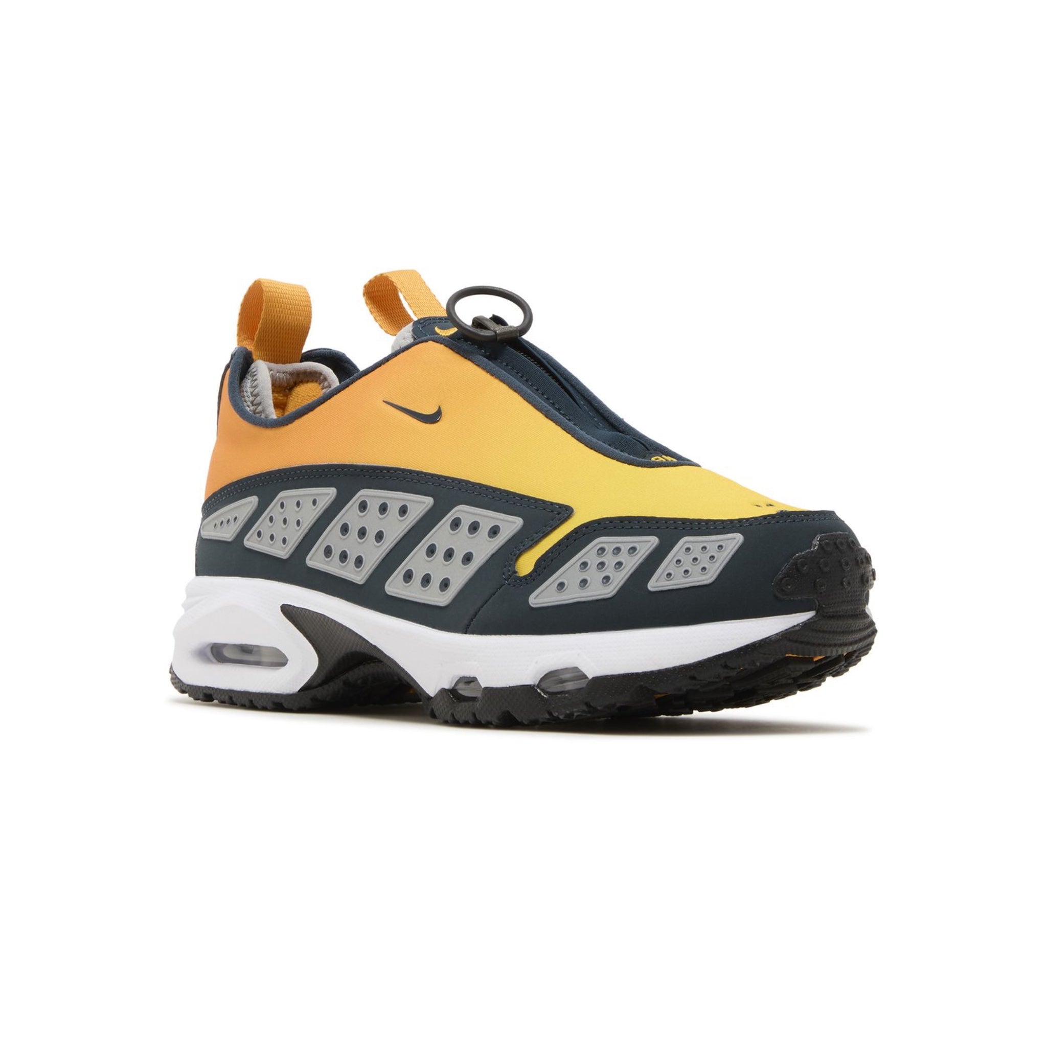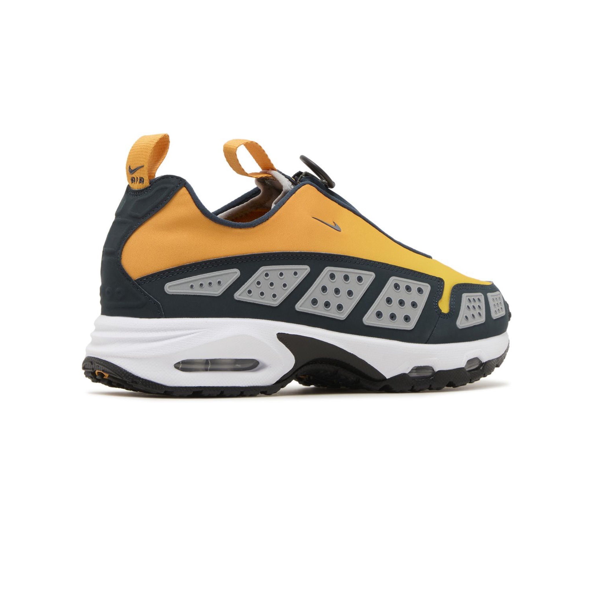 The Nike Women's Air Sunder Max 'Canyon Gold' has a stretchy knit shroud, secured with a zipper. A black synthetic nubuck mudguard is overlaid with reflective grey TPU panels. These shoes have a plush Phylon midsole, augmented with Nike Air cushioning in the forefoot and heel.