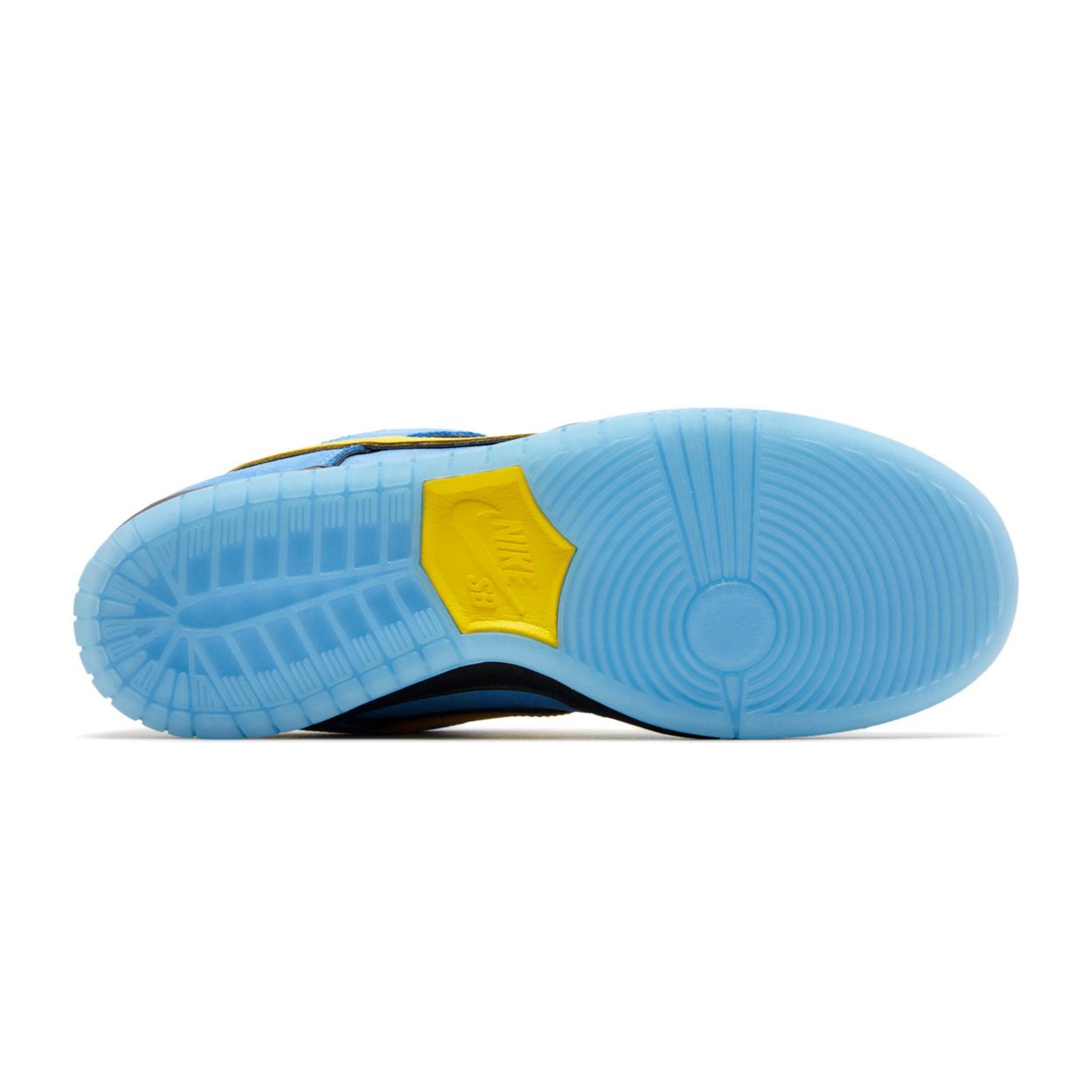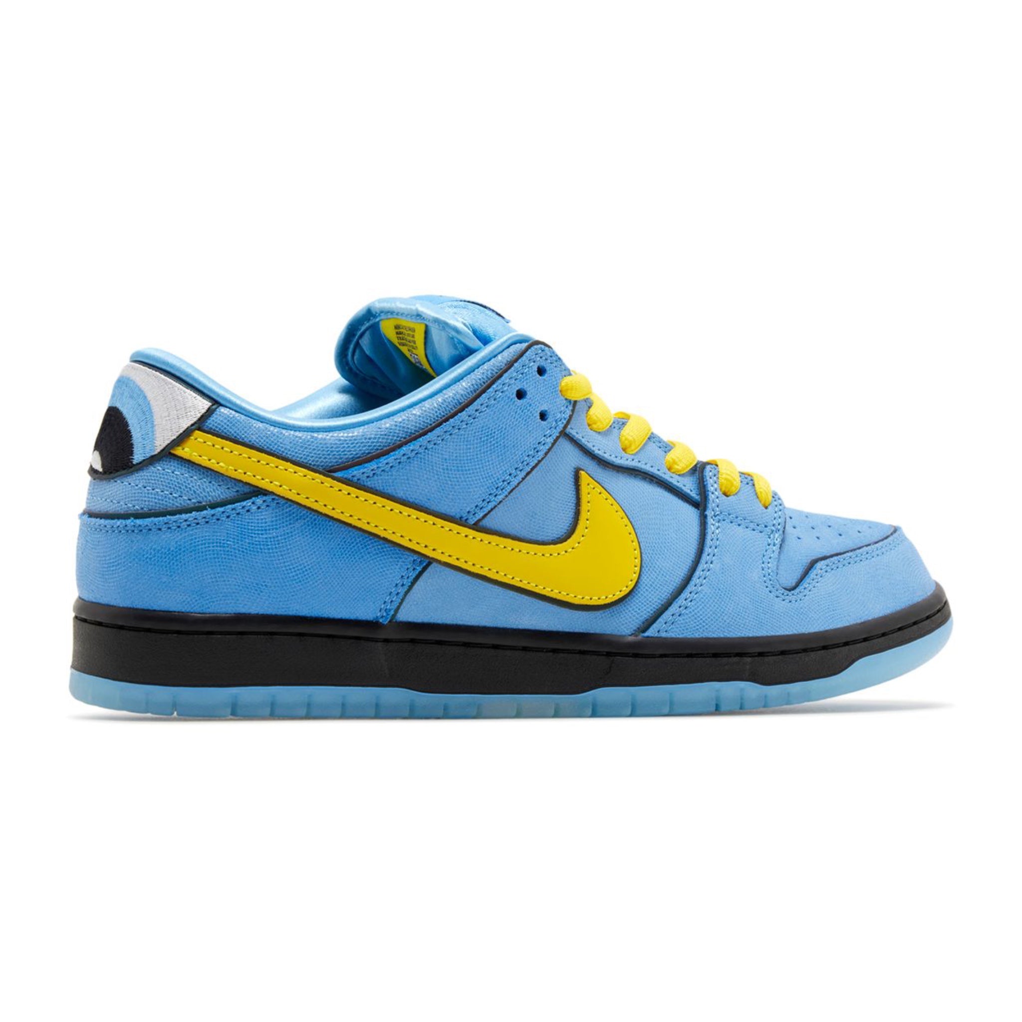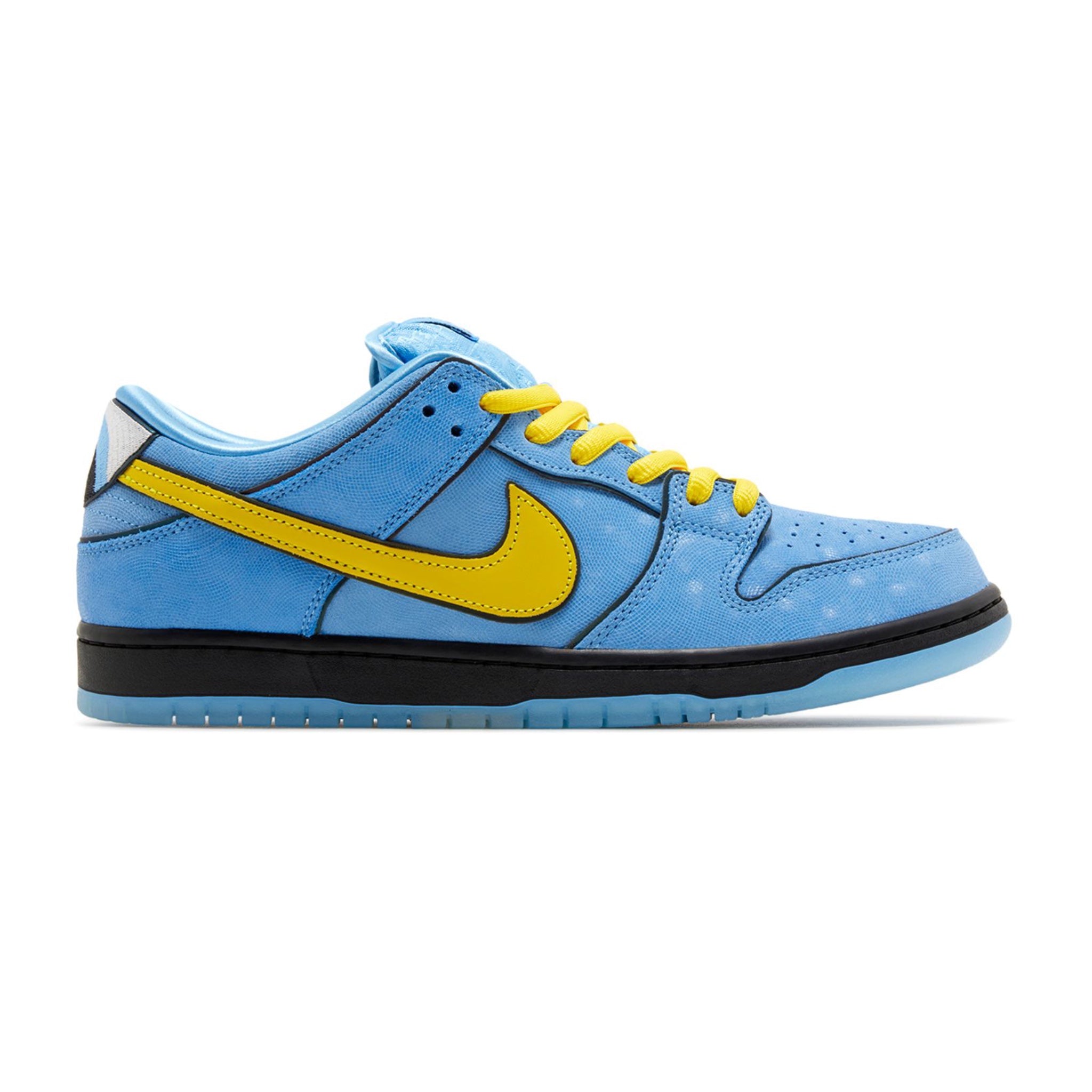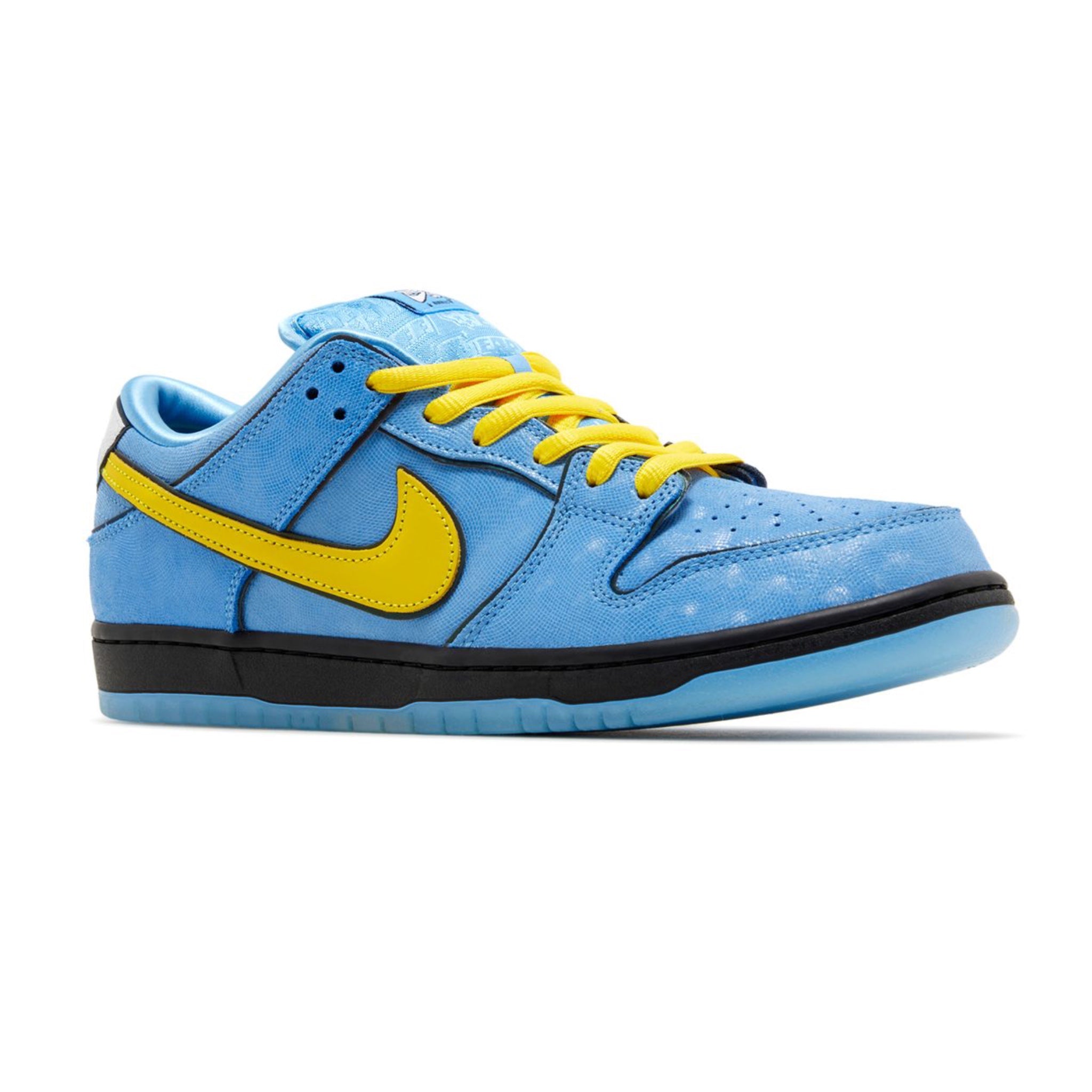Part of a shoe collection inspired by the popular animated series, the Powerpuff Girls joined forces with Nike to create the Dunk Low Pro SB QS 'Bubbles.' A sturdy cupsole with black sidewalls and a blue-tinted translucent rubber outsole supports the sneaker. The textured blue leather upper is lined with glossy satin and accented by black piping and a bold yellow Swoosh. The Powerpuff Girls logo graces the repeating pattern on each plush tongue and the oversized heel tabs mimic Bubbles' iconic blue eyes.