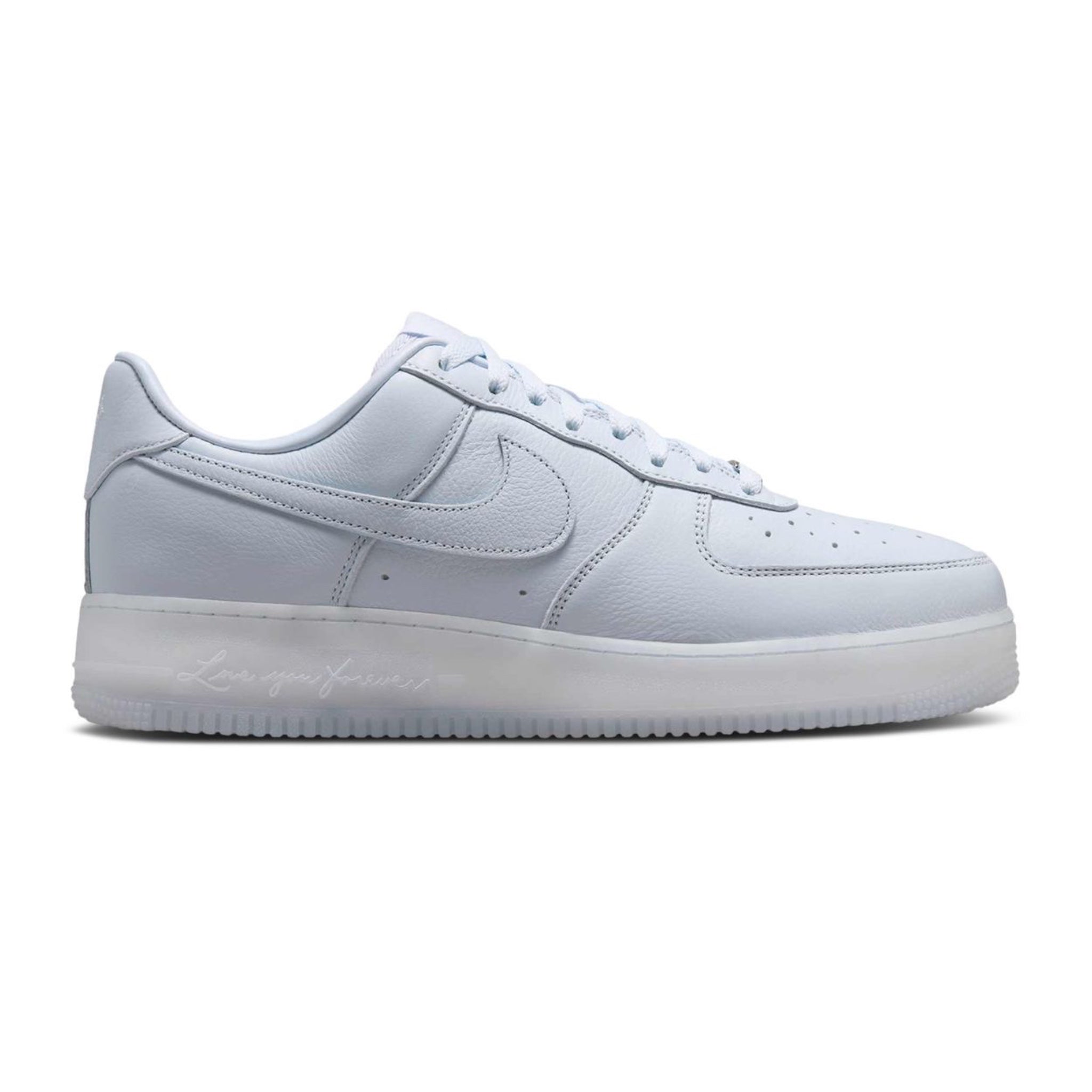 The NOCTA x Nike Air Force 1 Low 'Certified Lover Boy - White Cobalt Tint' uses subtle details inspired by Drake's favorite childhood book — 'Love You Forever.' A pale blue tumbled leather upper gets a brand new perforation pattern on the toe box and synthetic leather collar. The Nike Air logo appears on the right back tab, while the NOCTA North Star logo decorates the left. A partially see-through rubber cupsole is stamped with a 'Love You Forever' nod on the sidewall. The outsole replaces the traditional stars with embossed hearts.