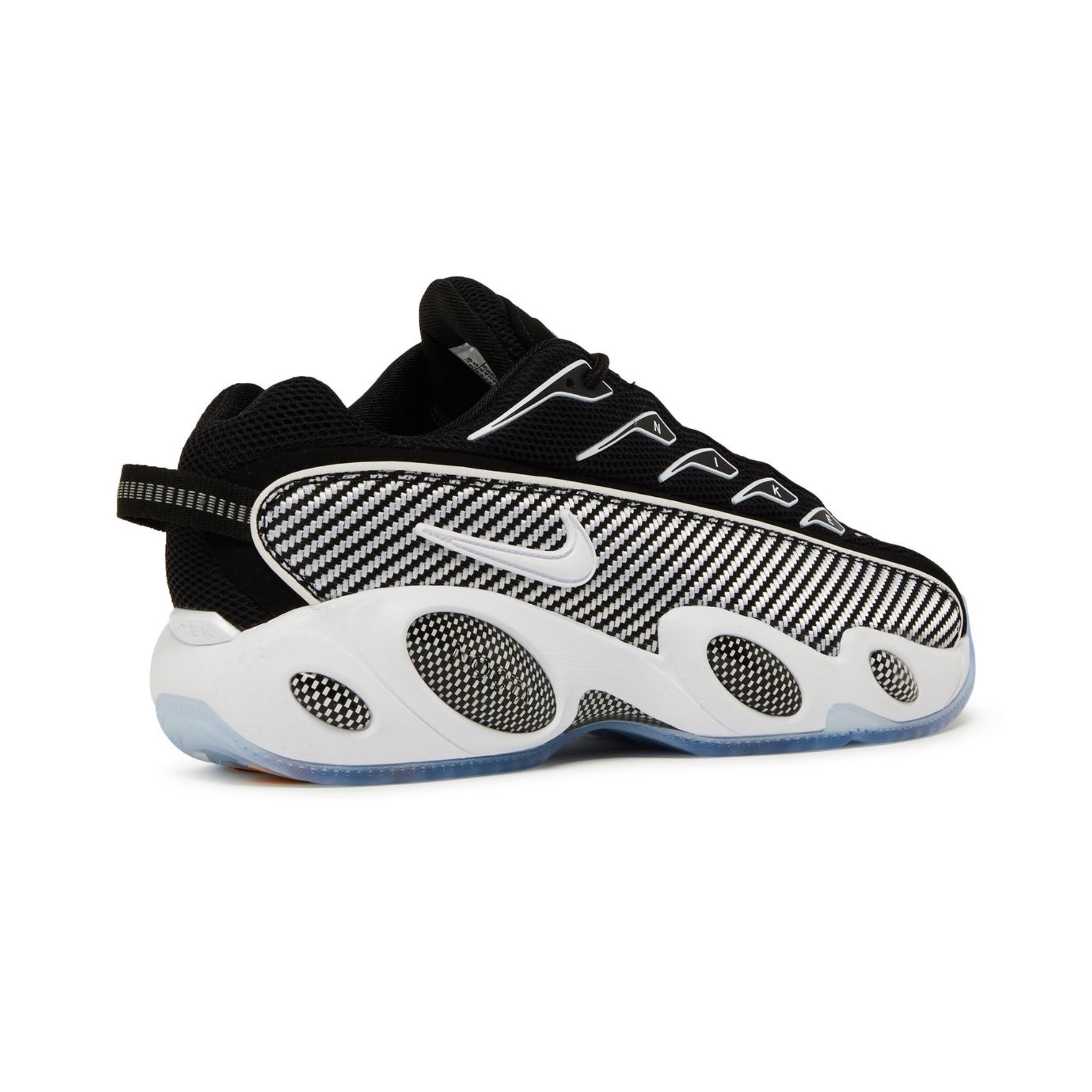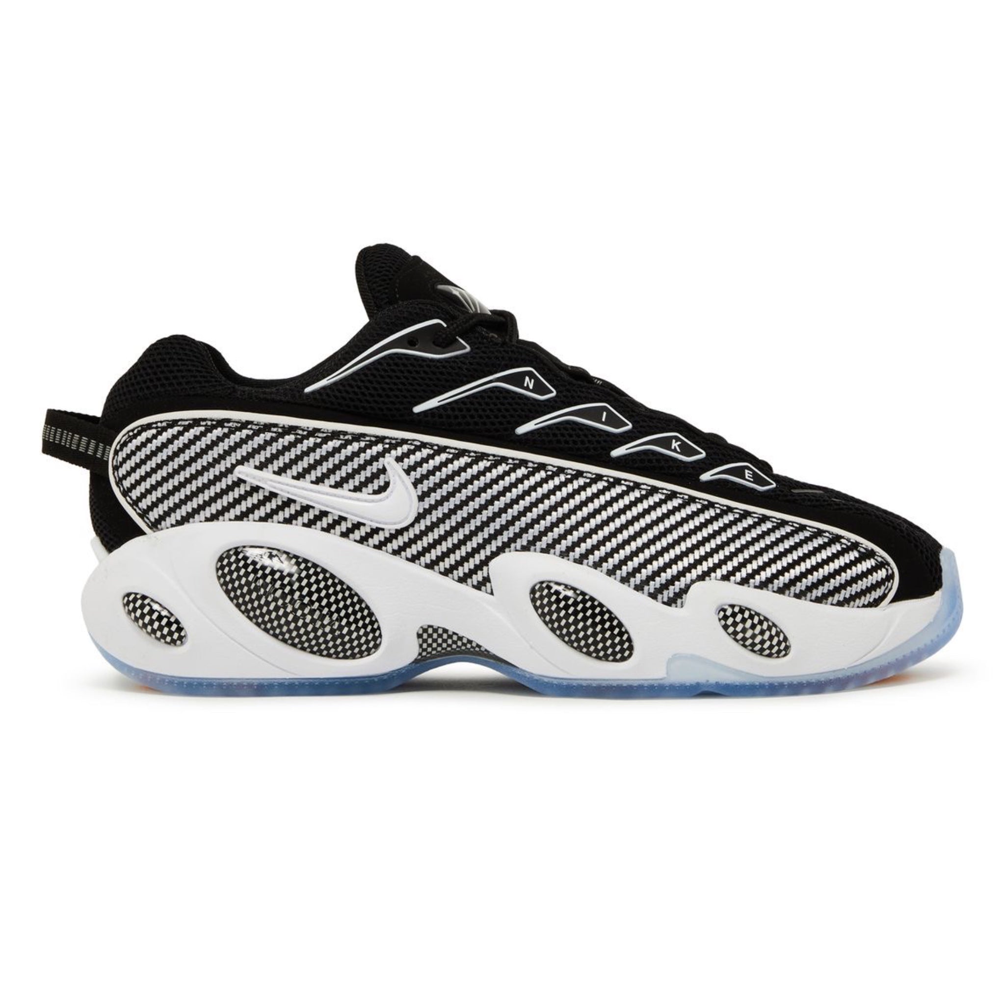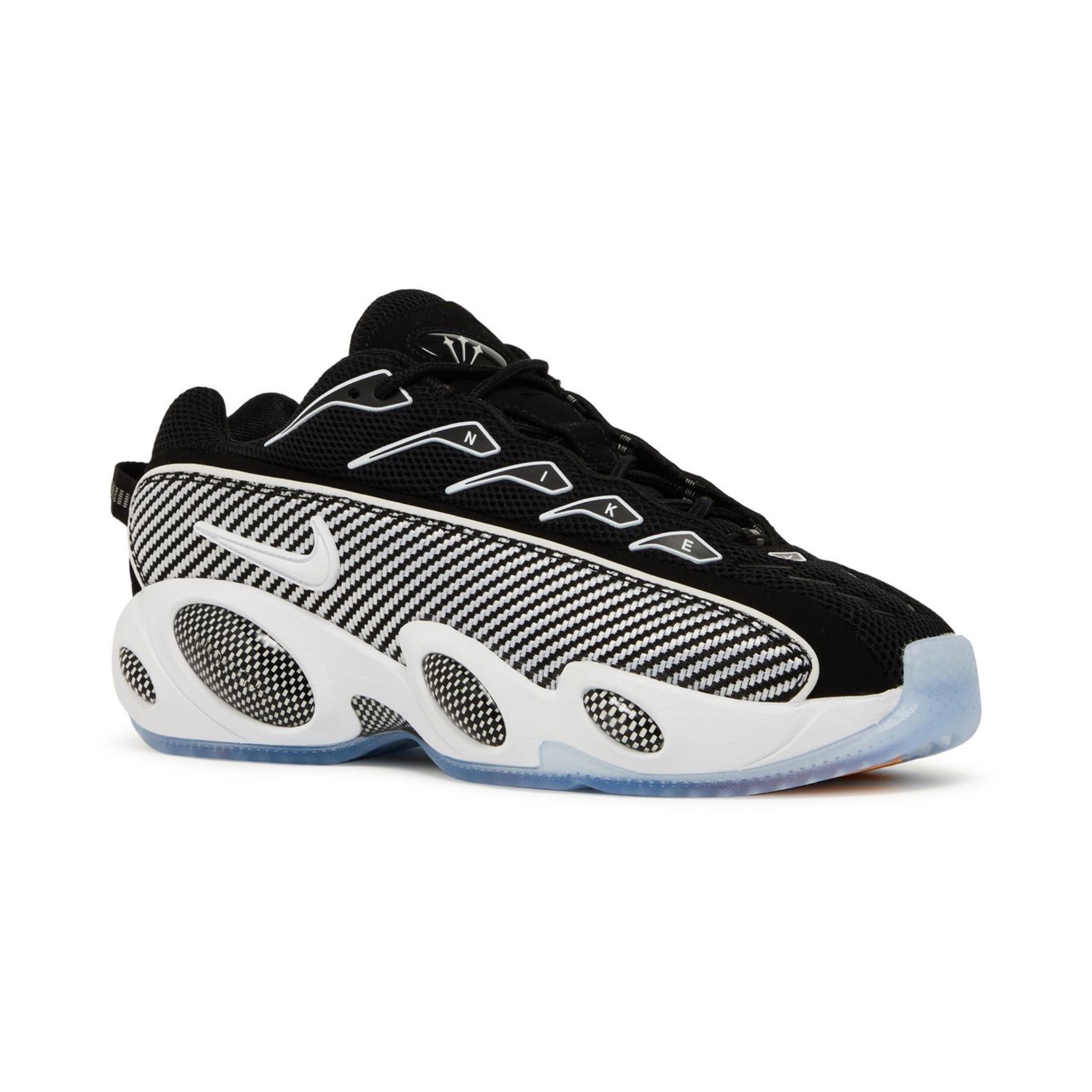 Introducing an attention-grabbing design within the collaborative collection of NOCTA x Nike, the Glide 'Black White' showcases a striking silhouette under Drake's Nike sub-label. Drawing inspiration from the classic Nike Zoom Flight 95, this retro-inspired model stands out with its wavy foam midsole, featuring unique 'bug eye' accents embedded in the sidewall, and a translucent rubber outsole for added style. The upper combines breathable black mesh with black and white woven textile side panels. The tongue displays NOCTA branding, while each decorative eyelet proudly spells out 'NIKE.'