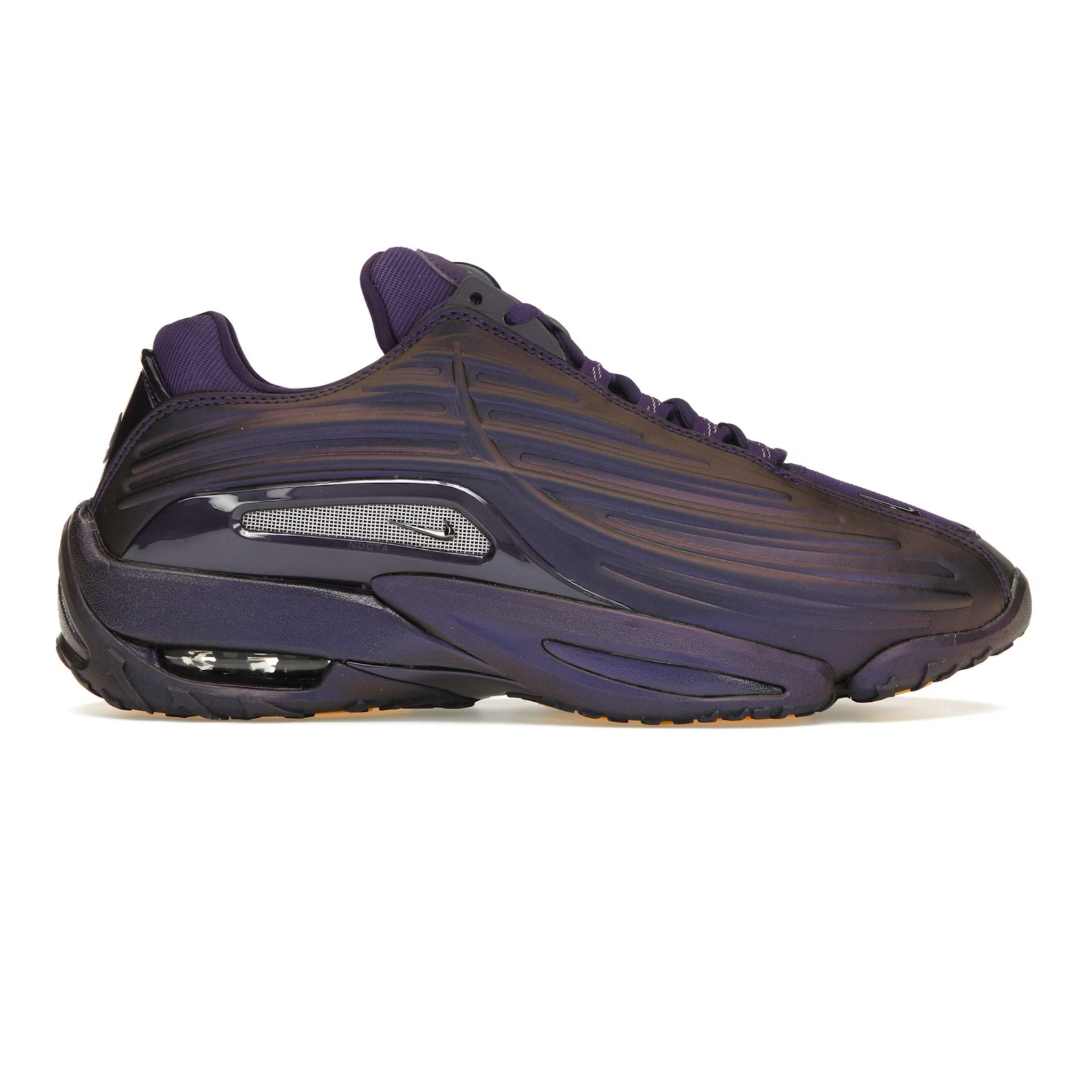 The NOCTA x Nike Hot Step 2 'Eggplant' sports a violet mesh upper with molded, iridescent synthetic leather side panels. The NOCTA logo appears on the jeweled tongue tag and the insoles. A matching purple foam midsole contains an exposed Air-sole heel unit, undergirded by a yellow rubber outsole.