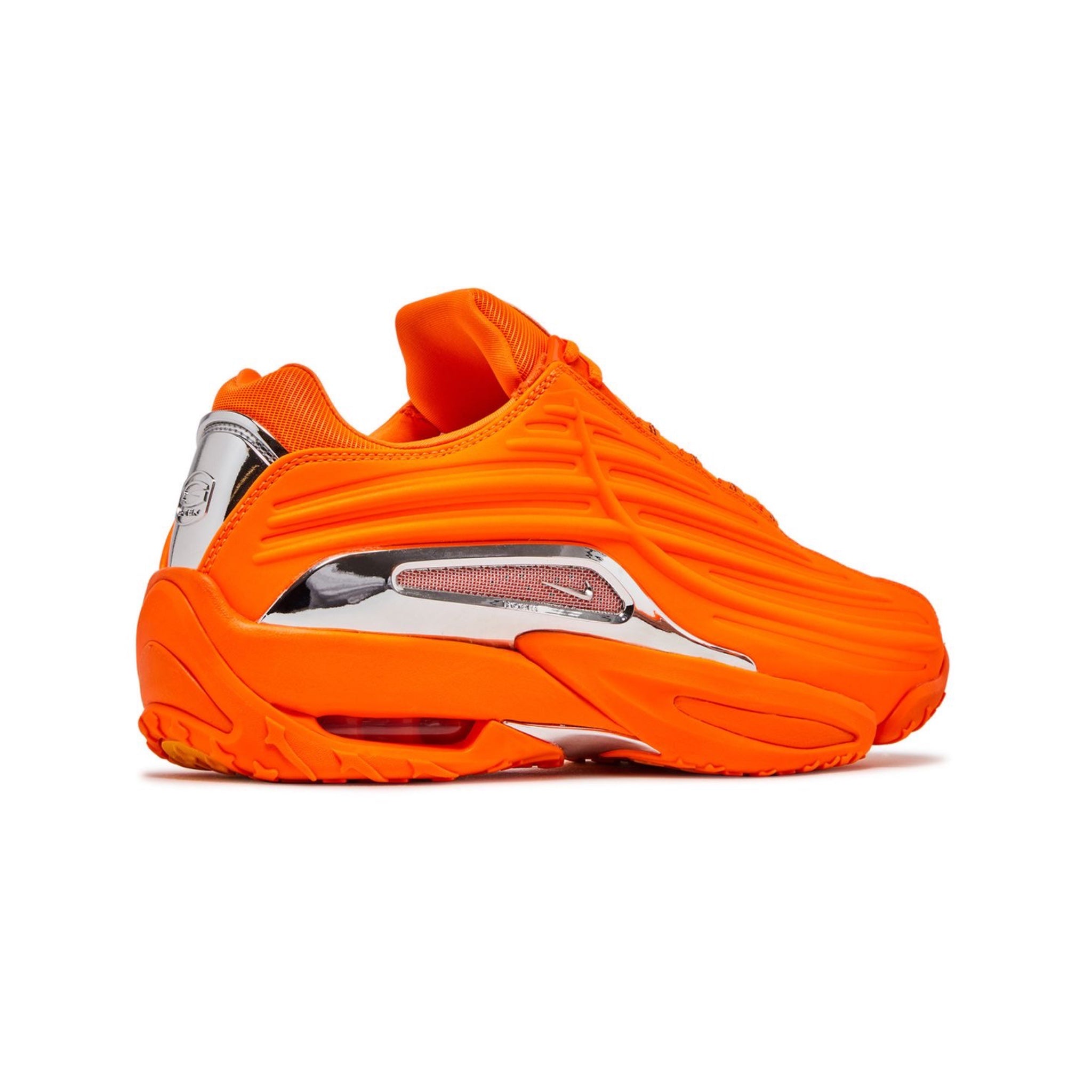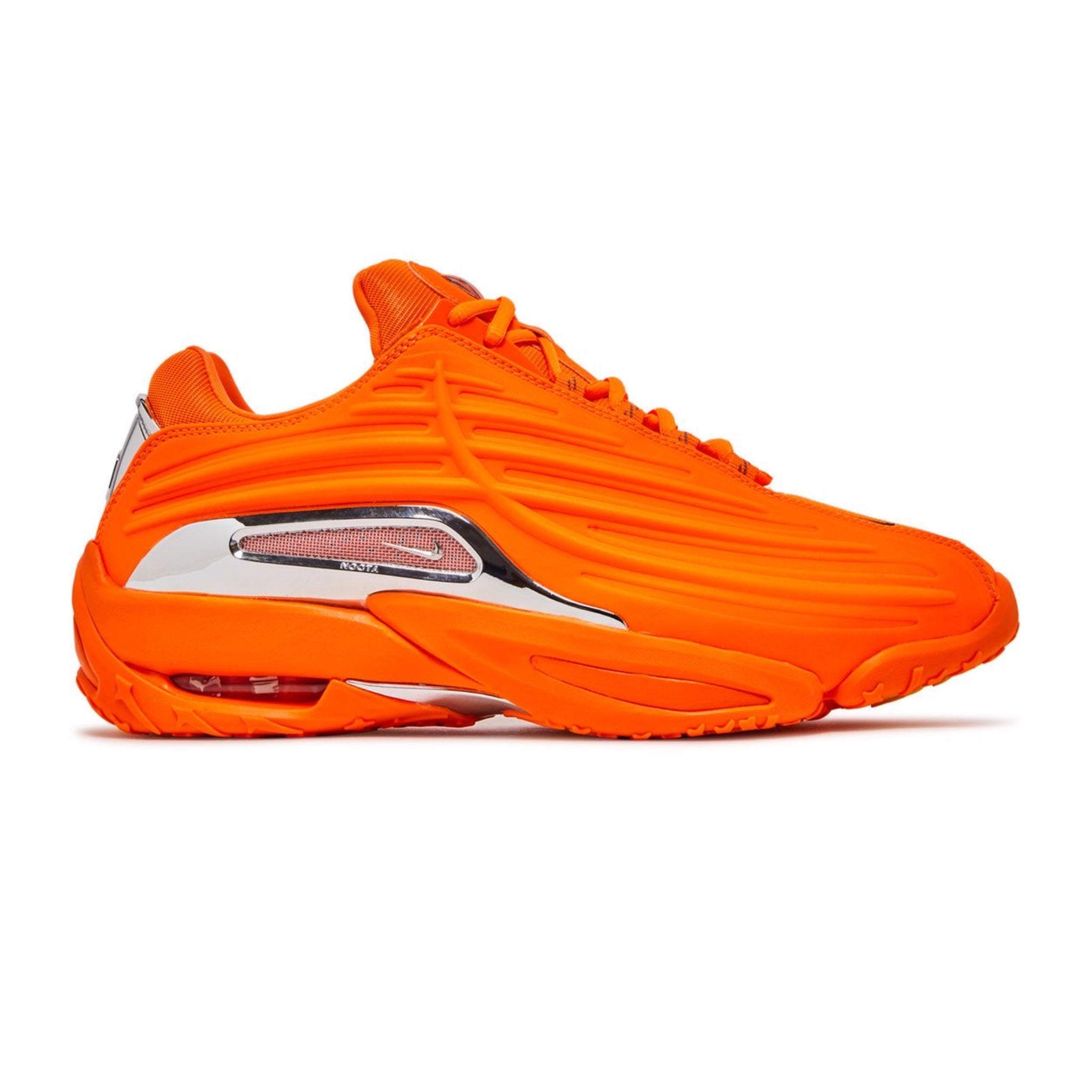 The NOCTA x Hot Step 2 'Total Orange' shoes made their debut during Drake's 'It's All a Blur' Tour, a follow-up to the original Hot Step from 2021. A vibrant orange hue molded synthetic leather upper is treated to a 3M reflective coating, accented with shiny chrome details on the midfoot and back tab. The NOCTA logo appears on the tongue and insoles, giving them a signature touch. A matching orange foam midsole contains and exposed Air-sole heel unit for soft cushioning underfoot.