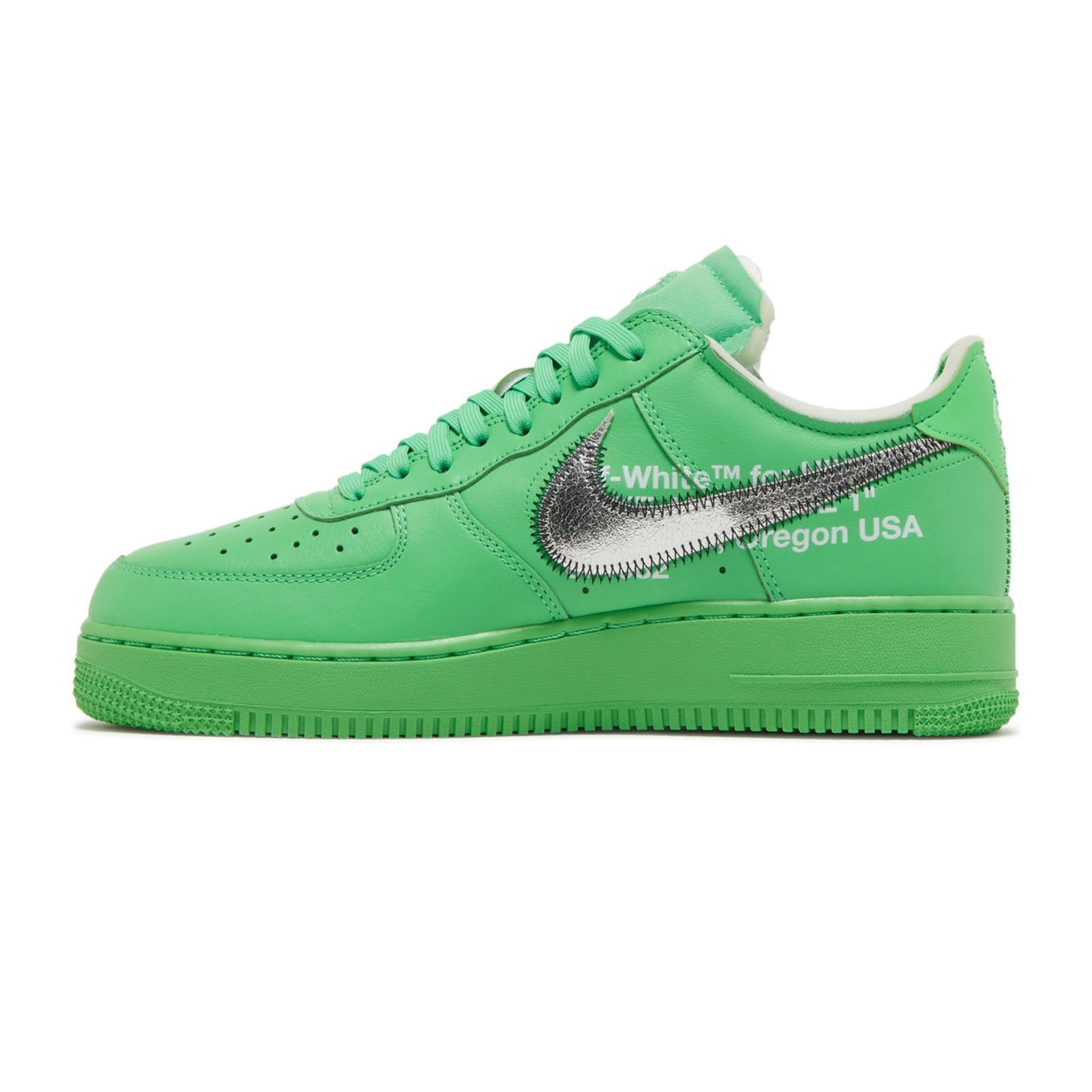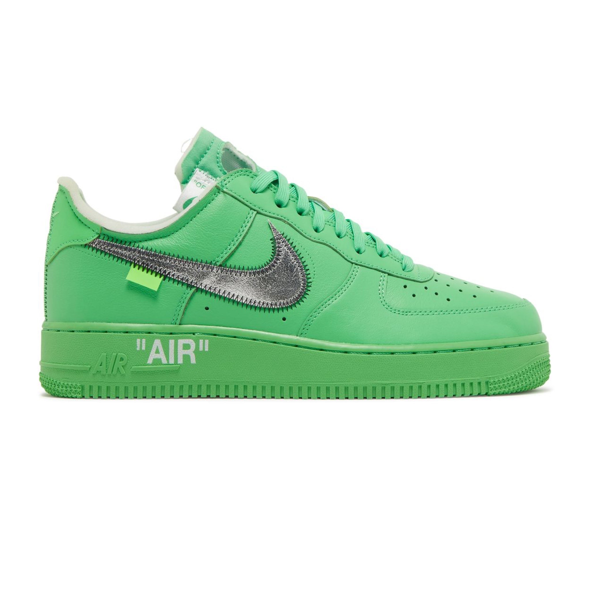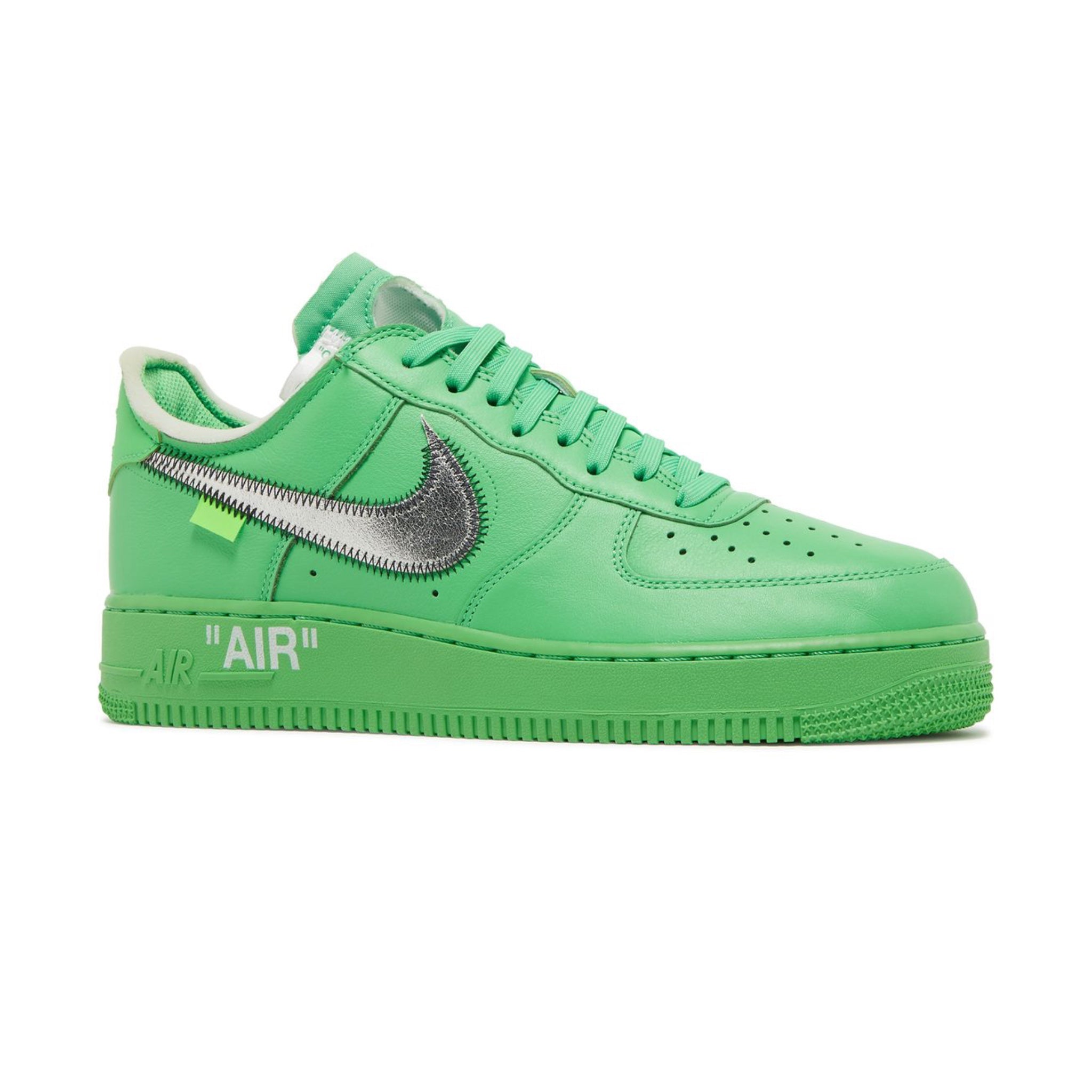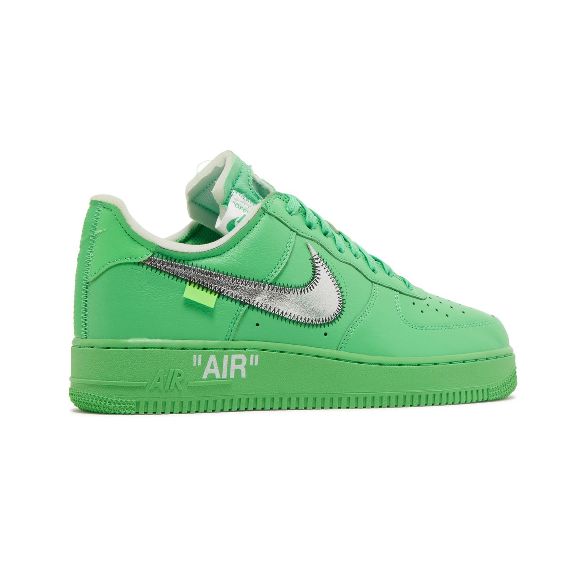 The Off-White x Nike Air Force 1 Low SP 'Brooklyn' features the same color block and details first seen in the 2019 'MCA' iteration and the 2021 'Lemonade' version. The 'Brooklyn' colorway features a vivid green leather upper, with classic Abloh details such as exposed foam construction and medial side text in Helvetica. The silver foil Swooshes return with black zigzag stitching, along with 'AIR' stamped on the lateral midsole.