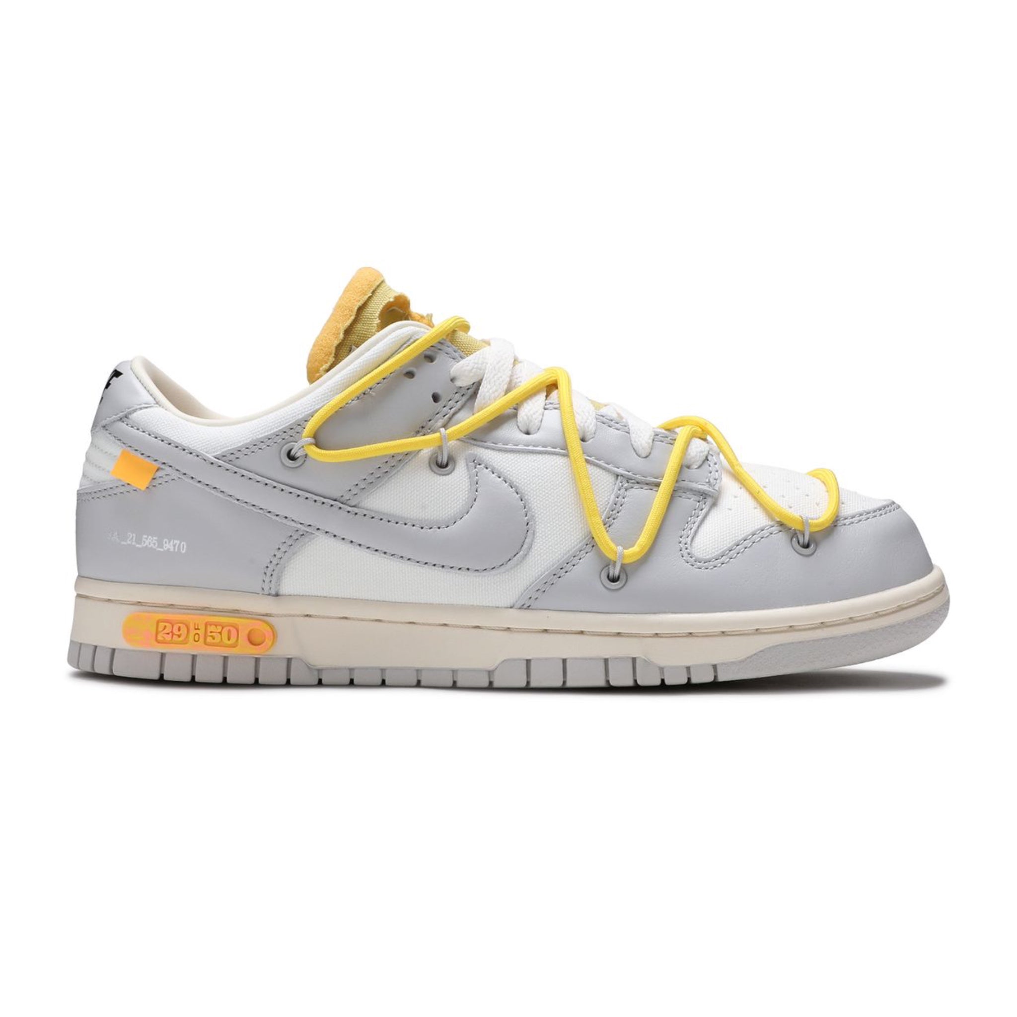 The Off-White Nike Dunk Low is part of the collection dubbed 'Dear Summer,' an expansive sequel to Virgil Abloh's initial 2019 collaboration with Nike Dunk. The shoe has a white leather upper accentuated by overlays in light grey canvas. It features a plastic zip tie and printed Helvetica text, characteristic design elements of Virgil Abloh. Hits of contrasting color appear with its zip-tie, secondary lacing system, rectangular tab attached to the Swoosh, and exposed-foam tongue. The lateral midsole is adorned with a '29 of 50' badge, indicating that only 50 pairs of this shoe were produced.