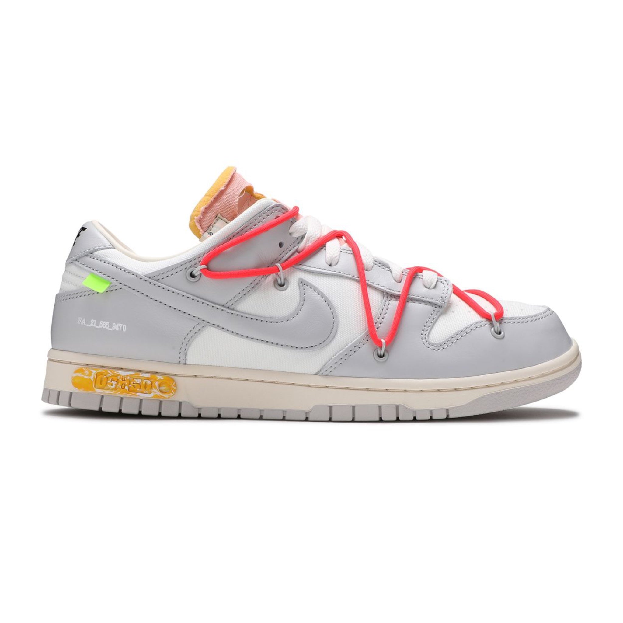 The Off-White Nike Dunk Low is part of the collection dubbed 'Dear Summer,' an expansive sequel to Virgil Abloh's initial 2019 collaboration with Nike Dunk. The shoe has a white leather upper accentuated by overlays in light grey canvas. It features a plastic zip tie and printed Helvetica text, characteristic design elements of Virgil Abloh. Hits of contrasting color appear with its zip-tie, secondary lacing system, rectangular tab attached to the Swoosh, and exposed-foam tongue. The lateral midsole is adorned with a '06 of 50' badge, indicating that only 50 pairs of this shoe were produced.