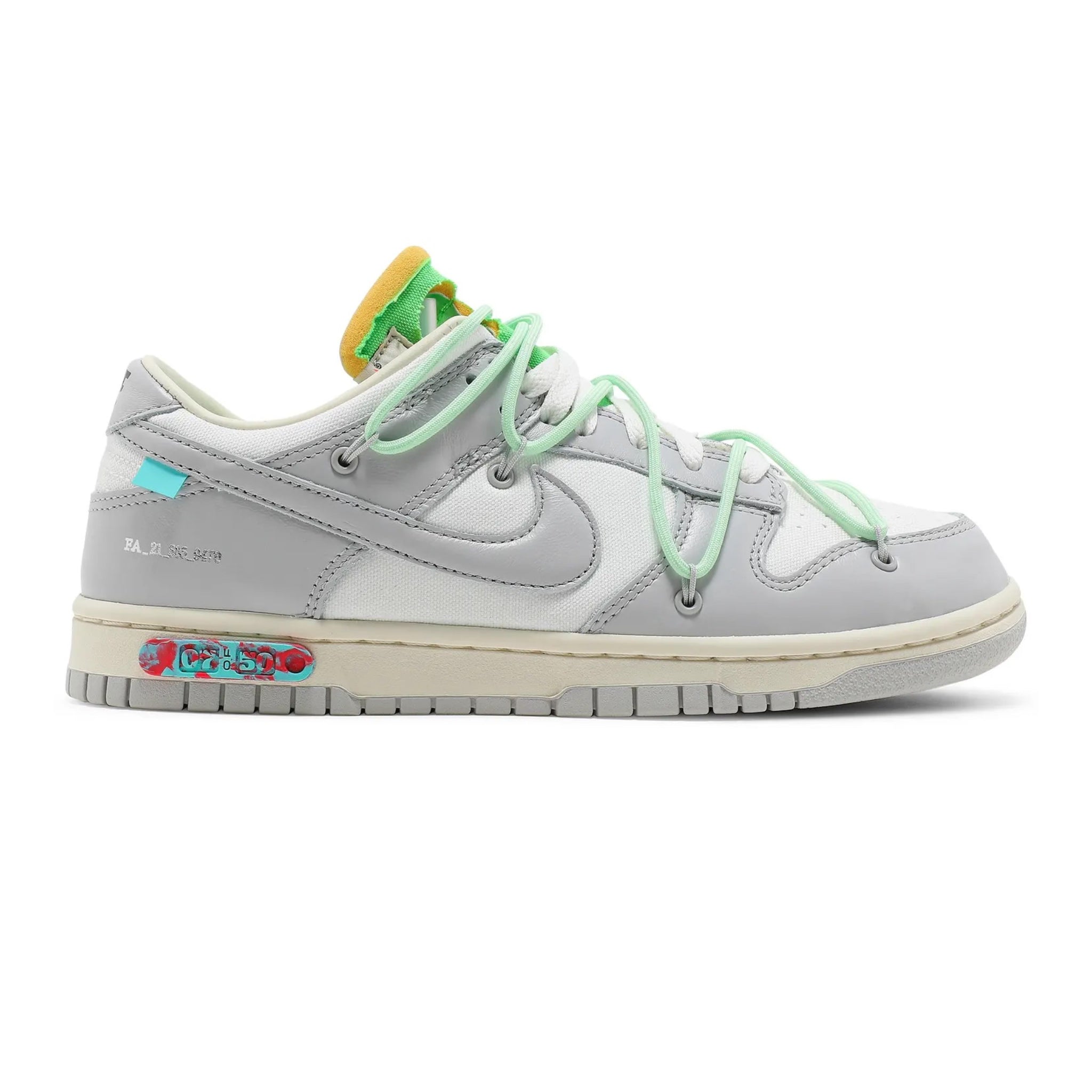 The Off-White Nike Dunk Low is part of the collection dubbed 'Dear Summer,' an expansive sequel to Virgil Abloh's initial 2019 collaboration with Nike Dunk. The shoe has a white leather upper accentuated by overlays in light grey canvas. It features a plastic zip tie and printed Helvetica text, characteristic design elements of Virgil Abloh. Hits of contrasting color appear with its zip-tie, secondary lacing system, rectangular tab attached to the Swoosh, and exposed-foam tongue. The lateral midsole is adorned with a '07 of 50' badge, indicating that only 50 pairs of this shoe were produced.