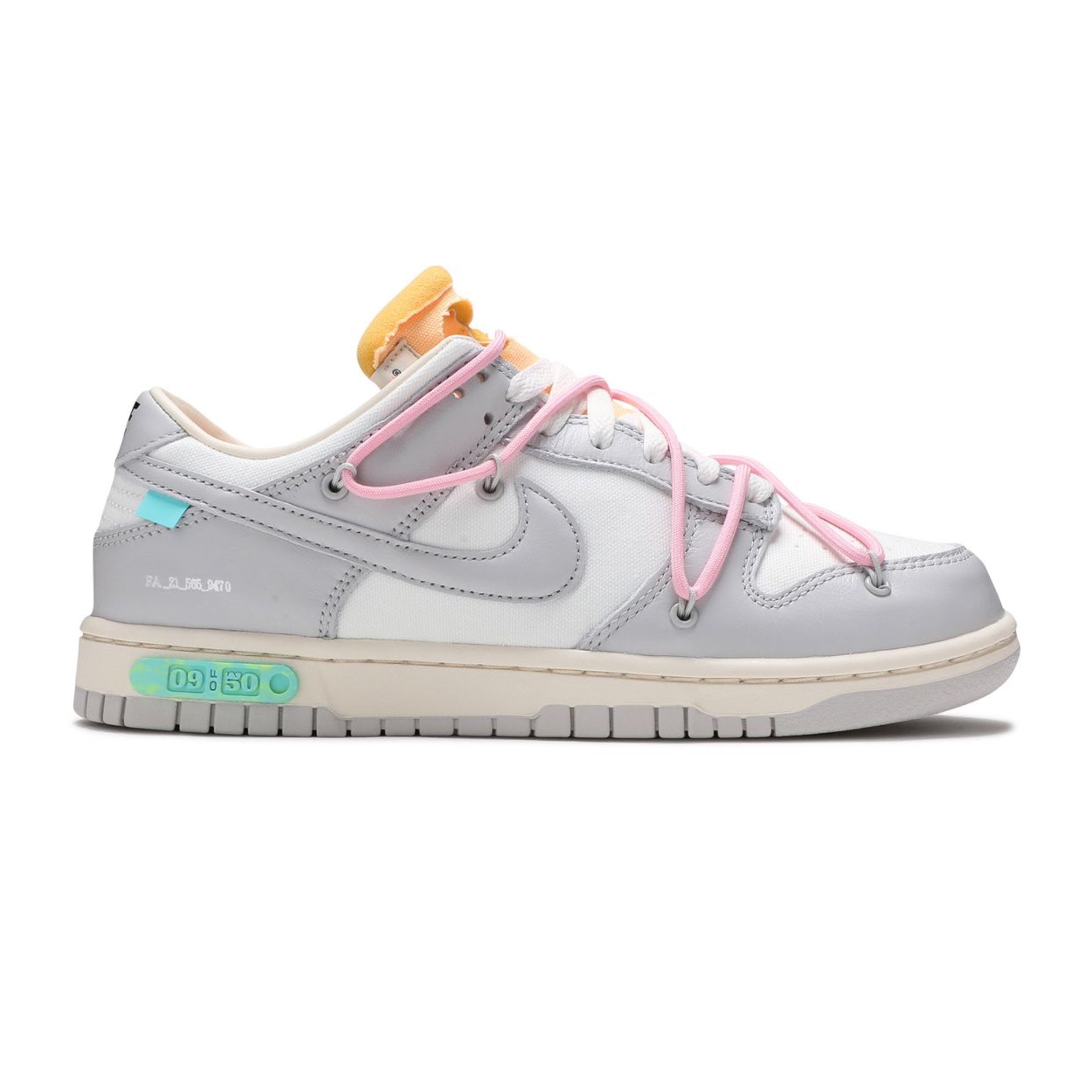 The Off-White Nike Dunk Low is part of the collection dubbed 'Dear Summer,' an expansive sequel to Virgil Abloh's initial 2019 collaboration with Nike Dunk. The shoe has a white leather upper accentuated by overlays in light grey canvas. It features a plastic zip tie and printed Helvetica text, characteristic design elements of Virgil Abloh. Hits of contrasting color appear with its zip-tie, secondary lacing system, rectangular tab attached to the Swoosh, and exposed-foam tongue. The lateral midsole is adorned with a '09 of 50' badge, indicating that only 50 pairs of this shoe were produced.