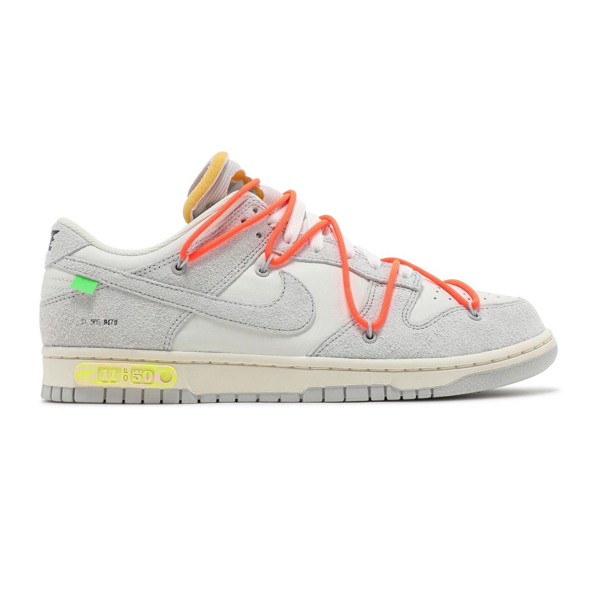 The Off-White Nike Dunk Low is part of the collection dubbed 'Dear Summer,' an expansive sequel to Virgil Abloh's initial 2019 collaboration with Nike Dunk. The shoe has a white leather upper accentuated by overlays in light grey canvas. It features a plastic zip tie and printed Helvetica text, characteristic design elements of Virgil Abloh. Hits of contrasting color appear with its zip-tie, secondary lacing system, rectangular tab attached to the Swoosh, and exposed-foam tongue. The lateral midsole is adorned with a '11 of 50' badge, indicating that only 50 pairs of this shoe were produced.