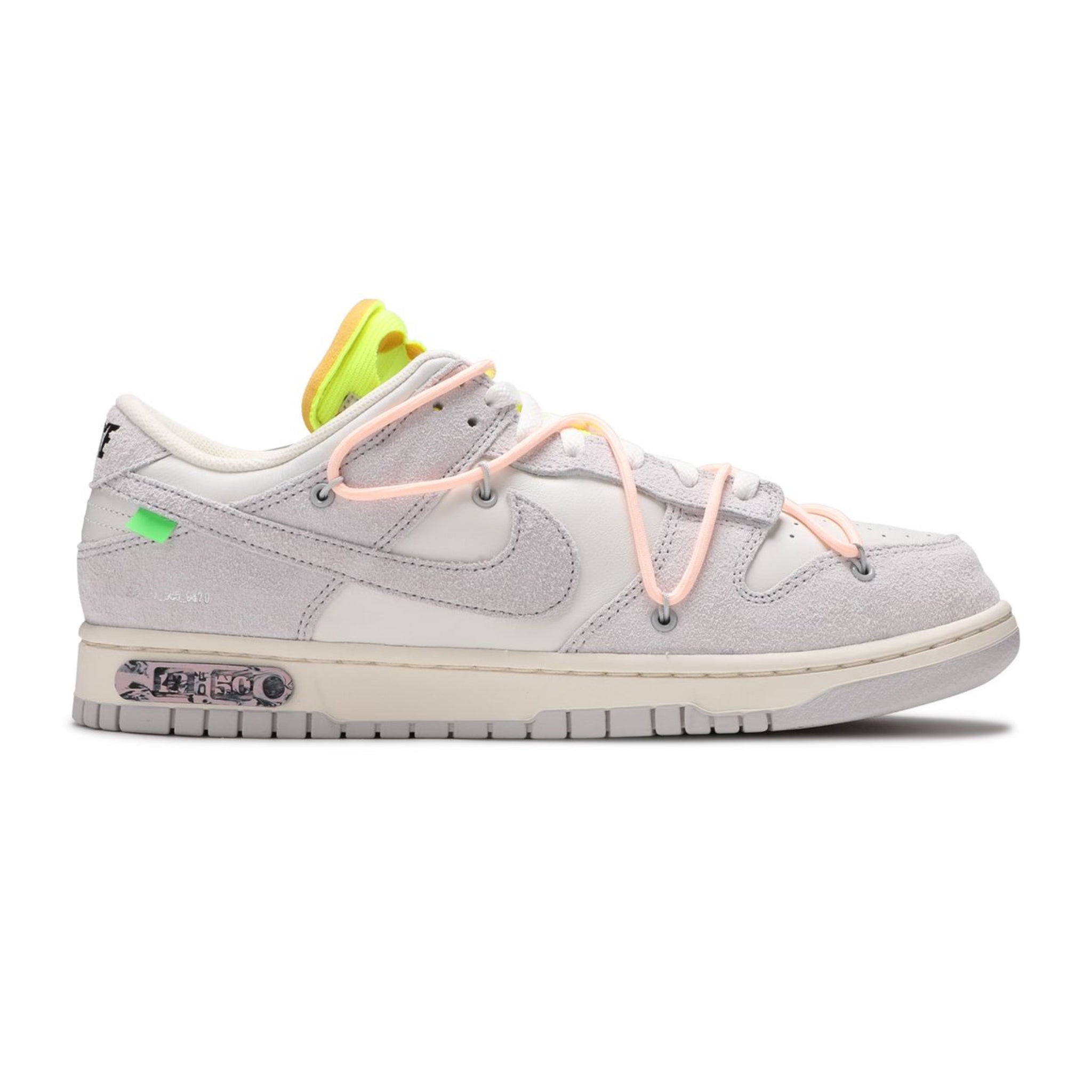 The Off-White Nike Dunk Low is part of the collection dubbed 'Dear Summer,' an expansive sequel to Virgil Abloh's initial 2019 collaboration with Nike Dunk. The shoe has a white leather upper accentuated by overlays in light grey canvas. It features a plastic zip tie and printed Helvetica text, characteristic design elements of Virgil Abloh. Hits of contrasting color appear with its zip-tie, secondary lacing system, rectangular tab attached to the Swoosh, and exposed-foam tongue. The lateral midsole is adorned with a '12 of 50' badge, indicating that only 50 pairs of this shoe were produced.
