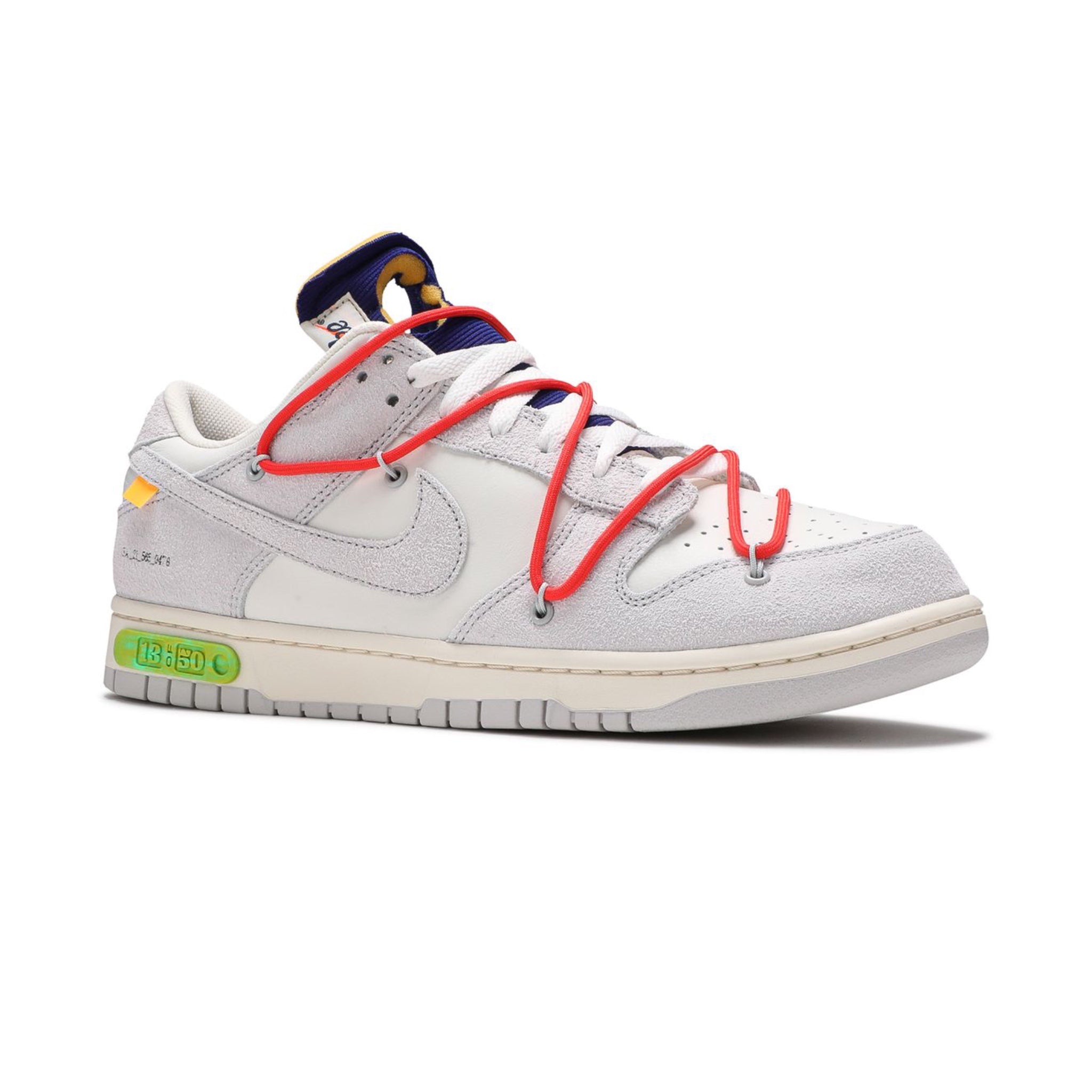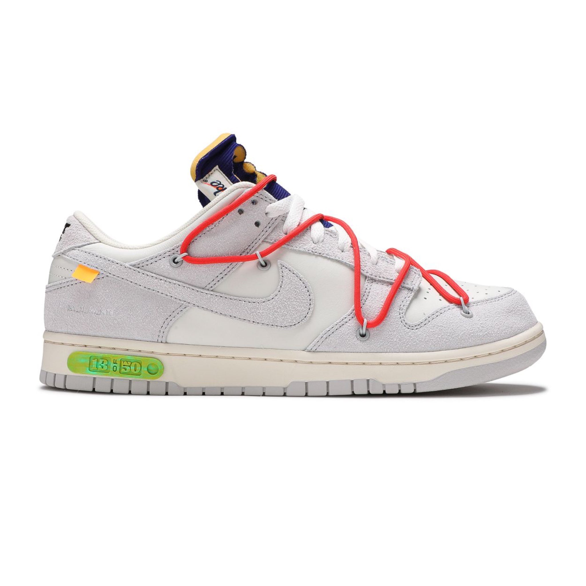 The Off-White Nike Dunk Low is part of the collection dubbed 'Dear Summer,' an expansive sequel to Virgil Abloh's initial 2019 collaboration with Nike Dunk. The shoe has a white leather upper accentuated by overlays in light grey canvas. It features a plastic zip tie and printed Helvetica text, characteristic design elements of Virgil Abloh. Hits of contrasting color appear with its zip-tie, secondary lacing system, rectangular tab attached to the Swoosh, and exposed-foam tongue. The lateral midsole is adorned with a '13 of 50' badge, indicating that only 50 pairs of this shoe were produced.