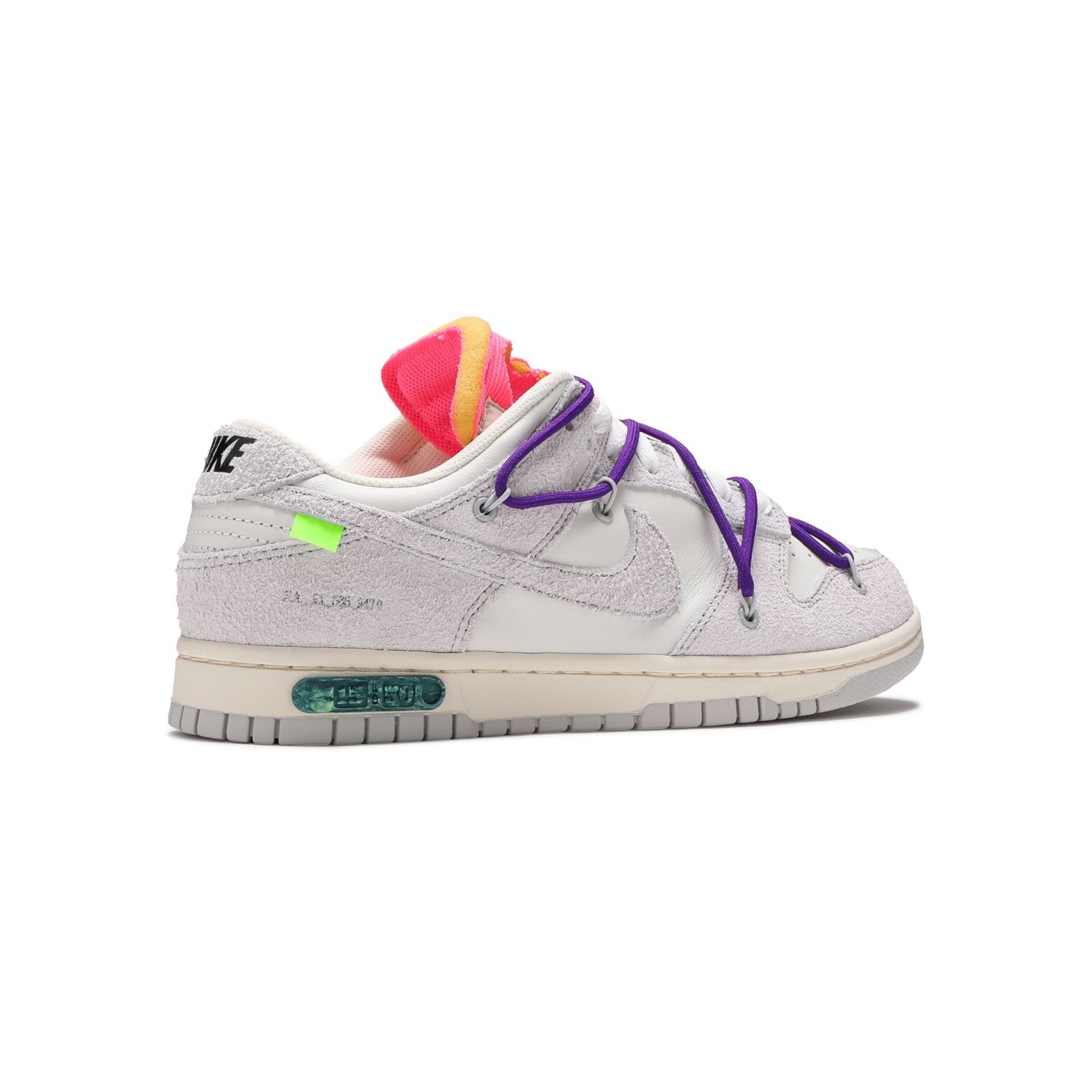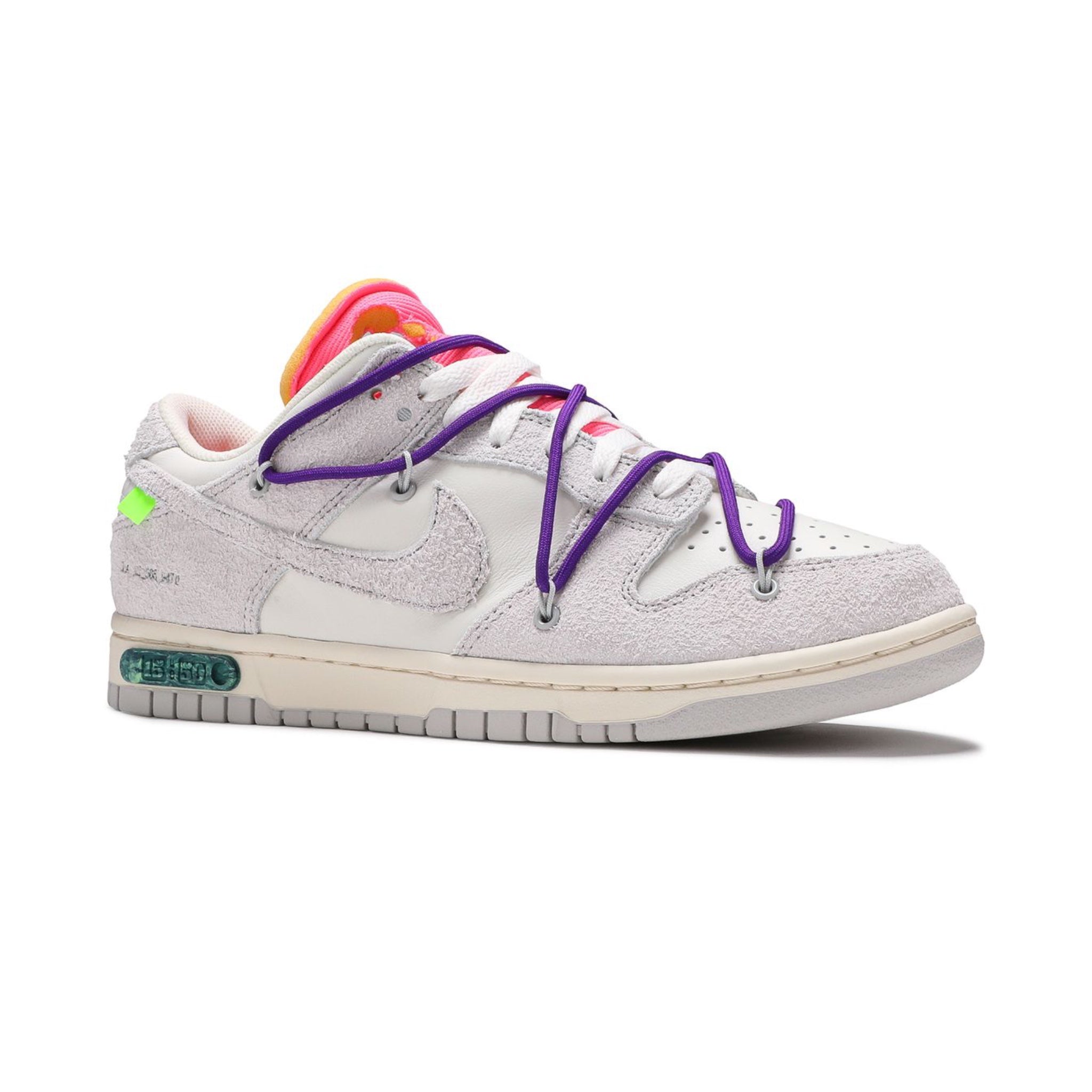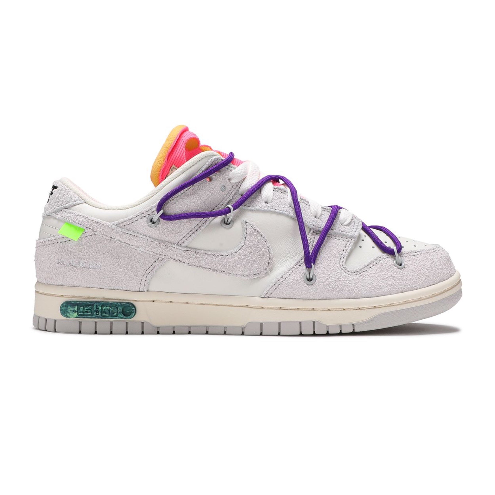 The Off-White Nike Dunk Low is part of the collection dubbed 'Dear Summer,' an expansive sequel to Virgil Abloh's initial 2019 collaboration with Nike Dunk. The shoe has a white leather upper accentuated by overlays in light grey canvas. It features a plastic zip tie and printed Helvetica text, characteristic design elements of Virgil Abloh. Hits of contrasting color appear with its zip-tie, secondary lacing system, rectangular tab attached to the Swoosh, and exposed-foam tongue. The lateral midsole is adorned with a '15 of 50' badge, indicating that only 50 pairs of this shoe were produced.
