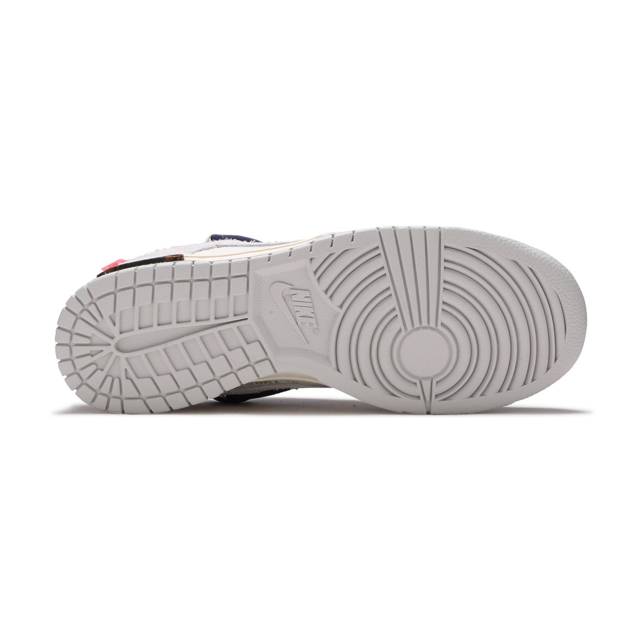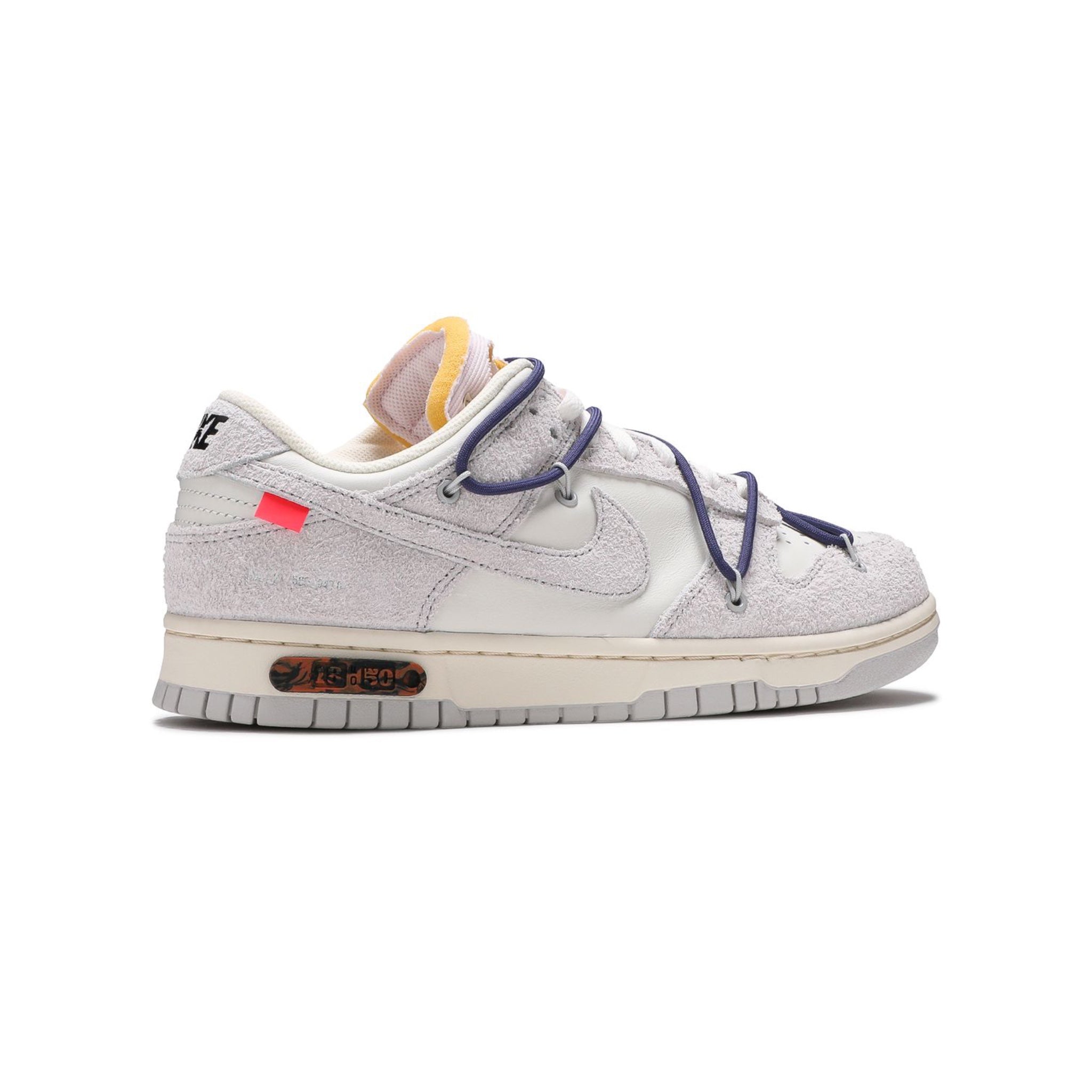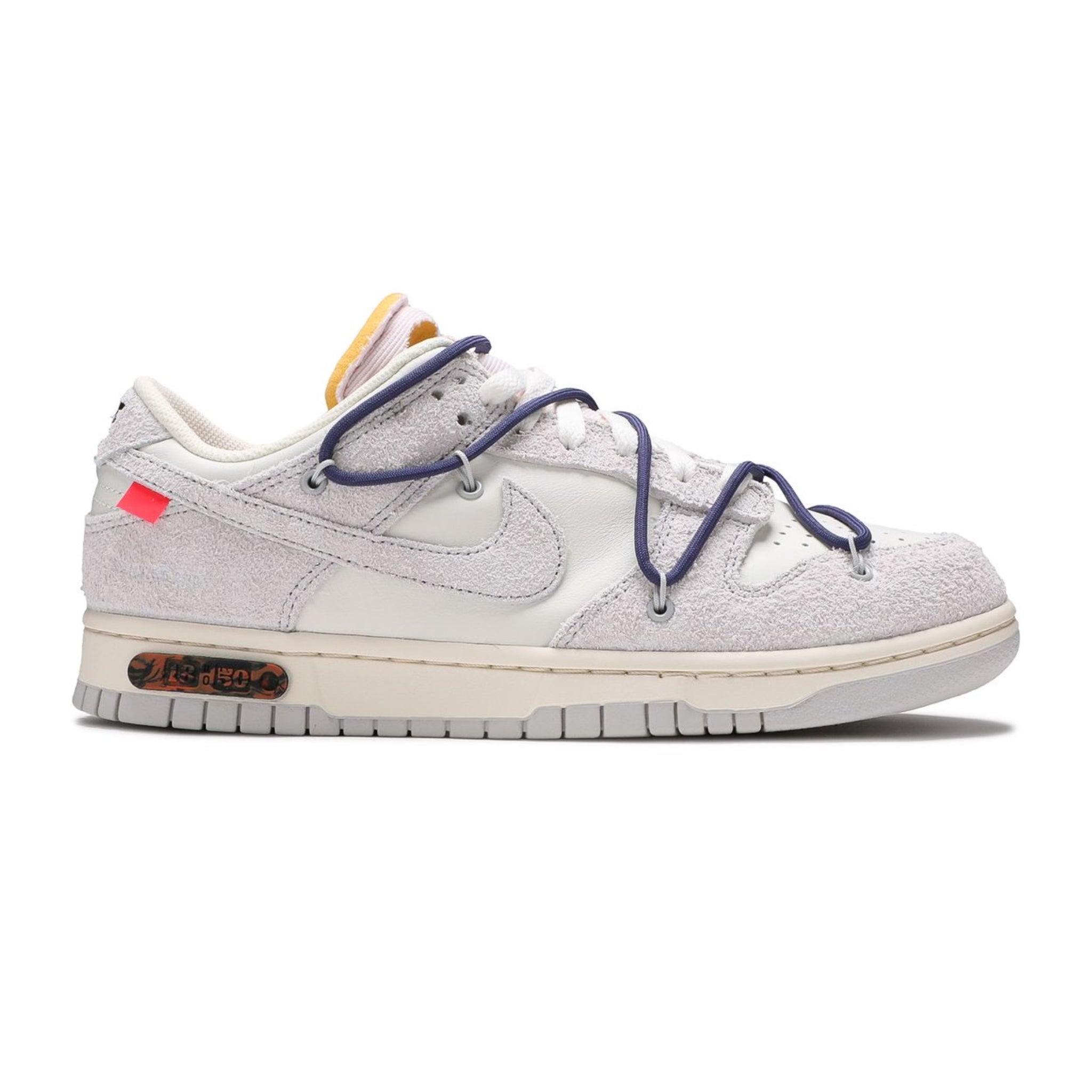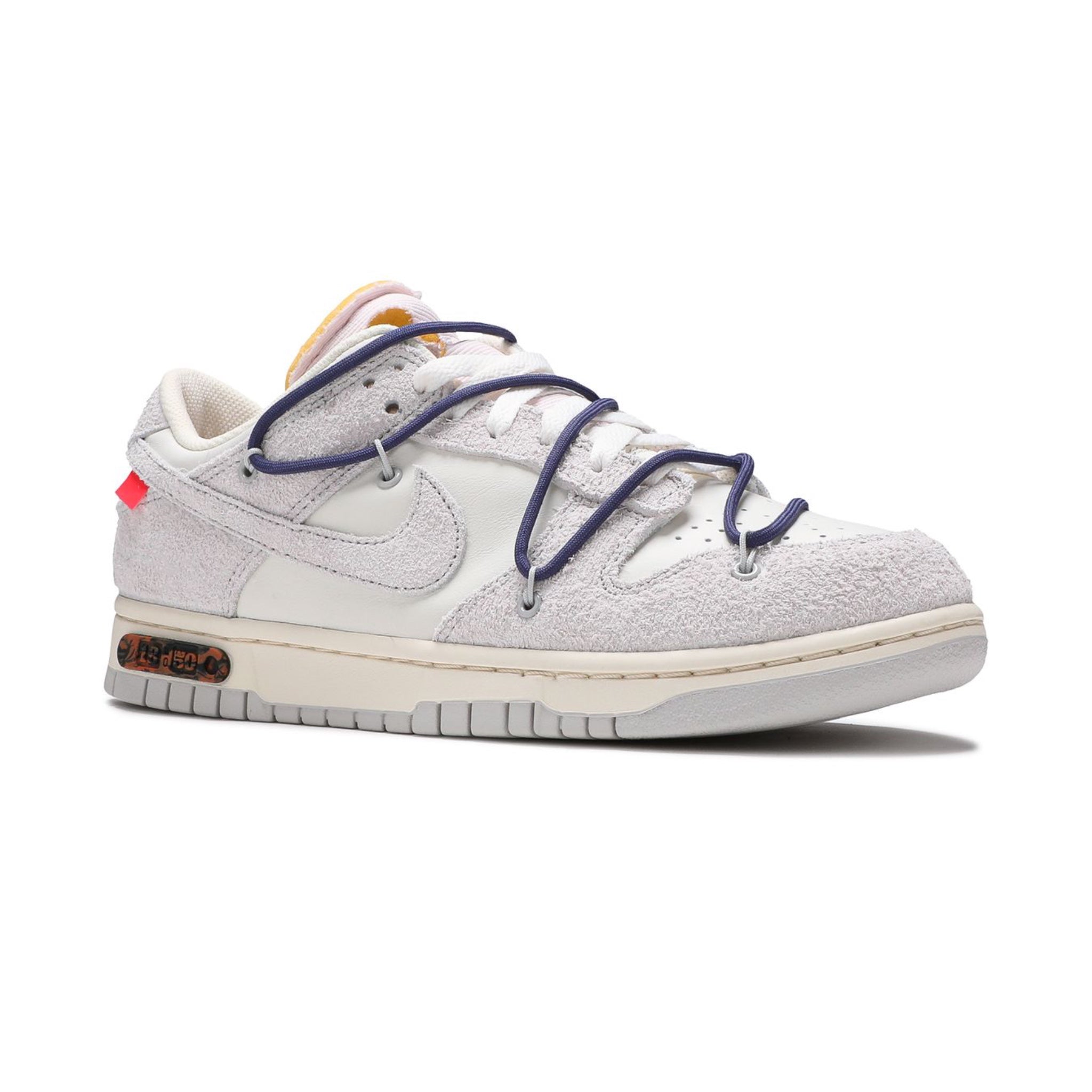 The Off-White Nike Dunk Low is part of the collection dubbed 'Dear Summer,' an expansive sequel to Virgil Abloh's initial 2019 collaboration with Nike Dunk. The shoe has a white leather upper accentuated by overlays in light grey canvas. It features a plastic zip tie and printed Helvetica text, characteristic design elements of Virgil Abloh. Hits of contrasting color appear with its zip-tie, secondary lacing system, rectangular tab attached to the Swoosh, and exposed-foam tongue. The lateral midsole is adorned with a '18 of 50' badge, indicating that only 50 pairs of this shoe were produced.
