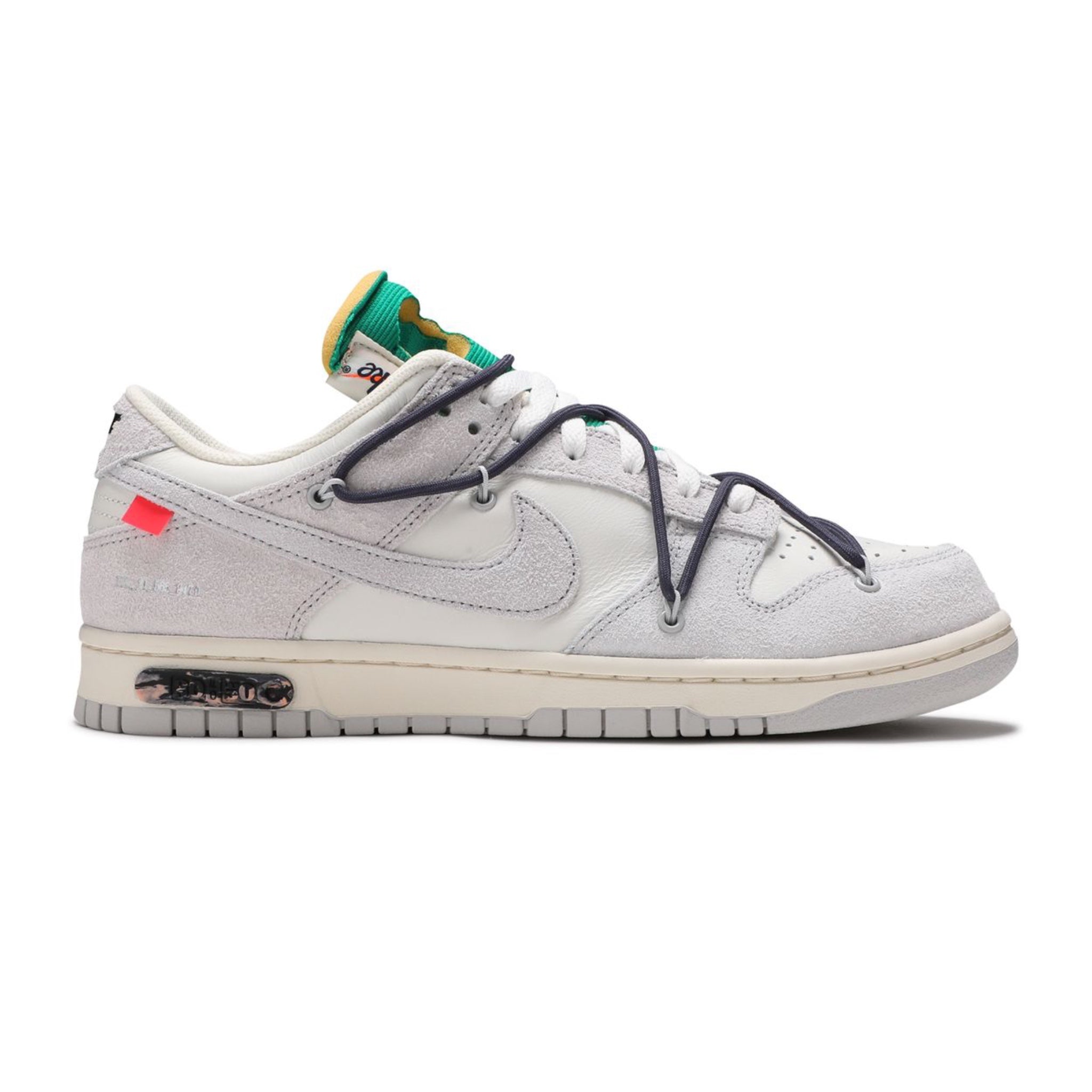 The Off-White Nike Dunk Low is part of the collection dubbed 'Dear Summer,' an expansive sequel to Virgil Abloh's initial 2019 collaboration with Nike Dunk. The shoe has a white leather upper accentuated by overlays in light grey canvas. It features a plastic zip tie and printed Helvetica text, characteristic design elements of Virgil Abloh. Hits of contrasting color appear with its zip-tie, secondary lacing system, rectangular tab attached to the Swoosh, and exposed-foam tongue. The lateral midsole is adorned with a '20 of 50' badge, indicating that only 50 pairs of this shoe were produced.