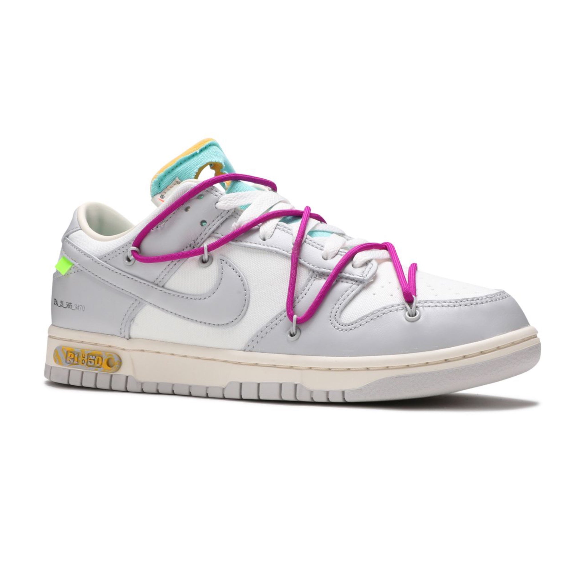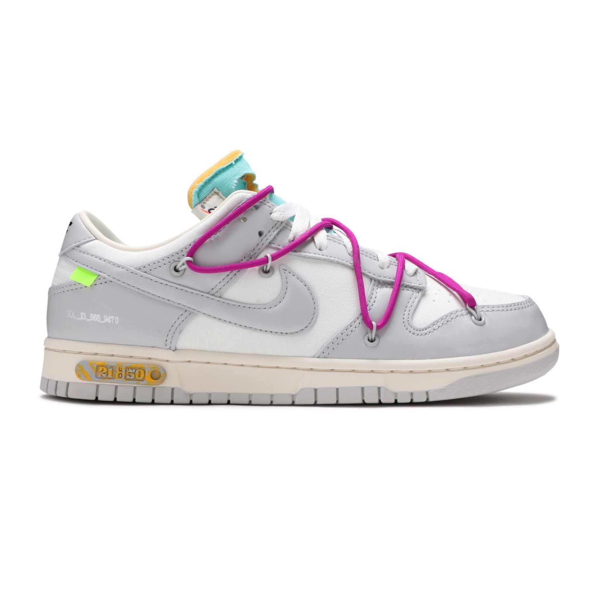 The Off-White Nike Dunk Low is part of the collection dubbed 'Dear Summer,' an expansive sequel to Virgil Abloh's initial 2019 collaboration with Nike Dunk. The shoe has a white leather upper accentuated by overlays in light grey canvas. It features a plastic zip tie and printed Helvetica text, characteristic design elements of Virgil Abloh. Hits of contrasting color appear with its zip-tie, secondary lacing system, rectangular tab attached to the Swoosh, and exposed-foam tongue. The lateral midsole is adorned with a '21 of 50' badge, indicating that only 50 pairs of this shoe were produced.