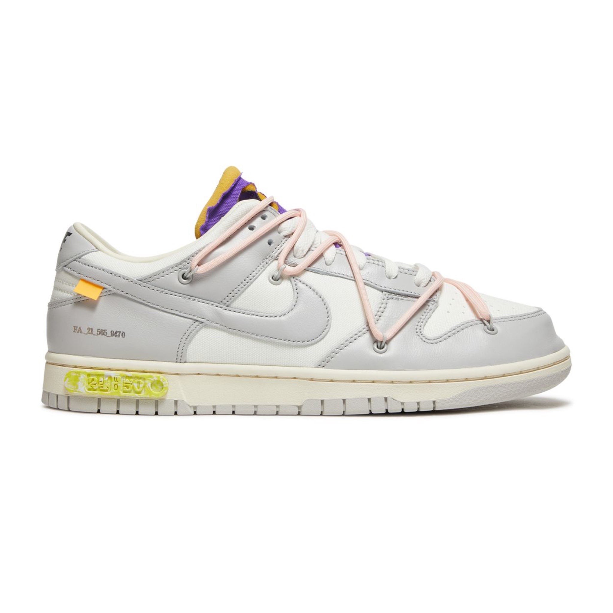 The Off-White Nike Dunk Low is part of the collection dubbed 'Dear Summer,' an expansive sequel to Virgil Abloh's initial 2019 collaboration with Nike Dunk. The shoe has a white leather upper accentuated by overlays in light grey canvas. It features a plastic zip tie and printed Helvetica text, characteristic design elements of Virgil Abloh. Hits of contrasting color appear with its zip-tie, secondary lacing system, rectangular tab attached to the Swoosh, and exposed-foam tongue. The lateral midsole is adorned with a '24 of 50' badge, indicating that only 50 pairs of this shoe were produced.