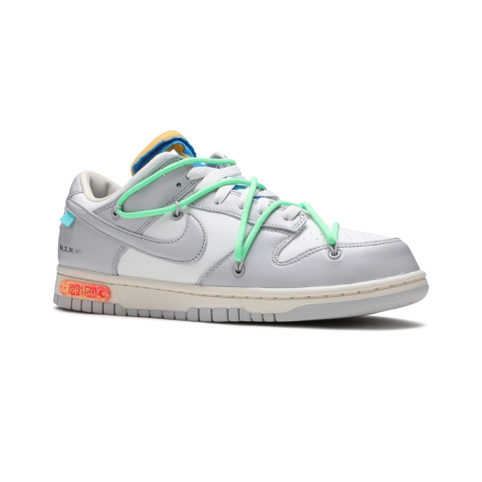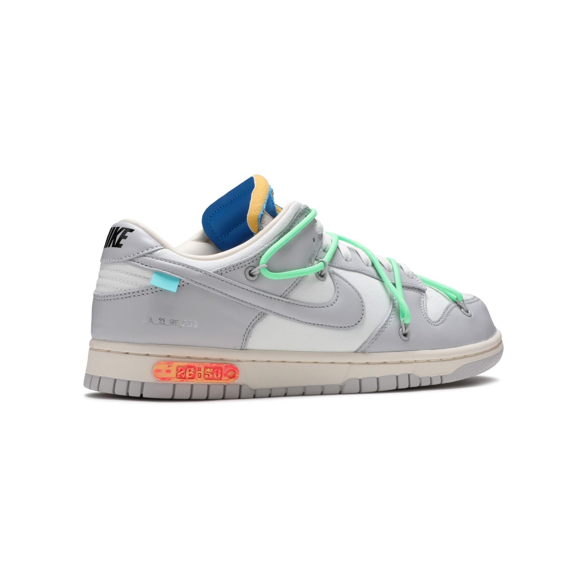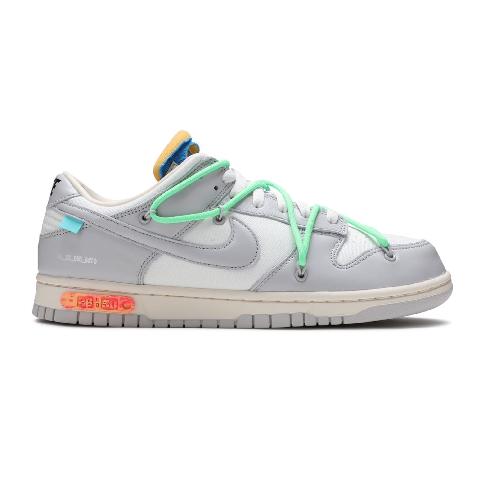 The Off-White Nike Dunk Low is part of the collection dubbed 'Dear Summer,' an expansive sequel to Virgil Abloh's initial 2019 collaboration with Nike Dunk. The shoe has a white leather upper accentuated by overlays in light grey canvas. It features a plastic zip tie and printed Helvetica text, characteristic design elements of Virgil Abloh. Hits of contrasting color appear with its zip-tie, secondary lacing system, rectangular tab attached to the Swoosh, and exposed-foam tongue. The lateral midsole is adorned with a '26 of 50' badge, indicating that only 50 pairs of this shoe were produced.