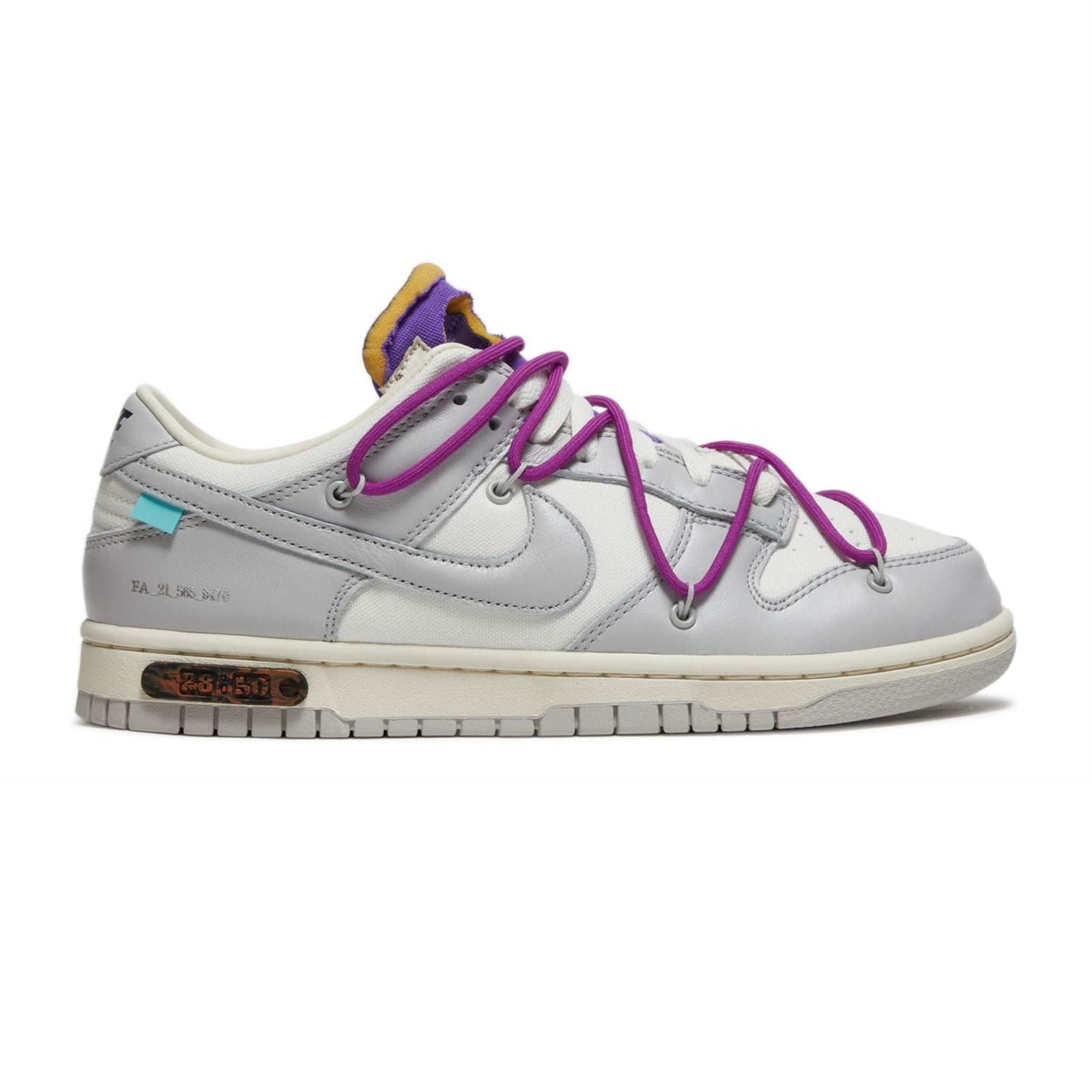 The Off-White Nike Dunk Low is part of the collection dubbed 'Dear Summer,' an expansive sequel to Virgil Abloh's initial 2019 collaboration with Nike Dunk. The shoe has a white leather upper accentuated by overlays in light grey canvas. It features a plastic zip tie and printed Helvetica text, characteristic design elements of Virgil Abloh. Hits of contrasting color appear with its zip-tie, secondary lacing system, rectangular tab attached to the Swoosh, and exposed-foam tongue. The lateral midsole is adorned with a '28 of 50' badge, indicating that only 50 pairs of this shoe were produced.