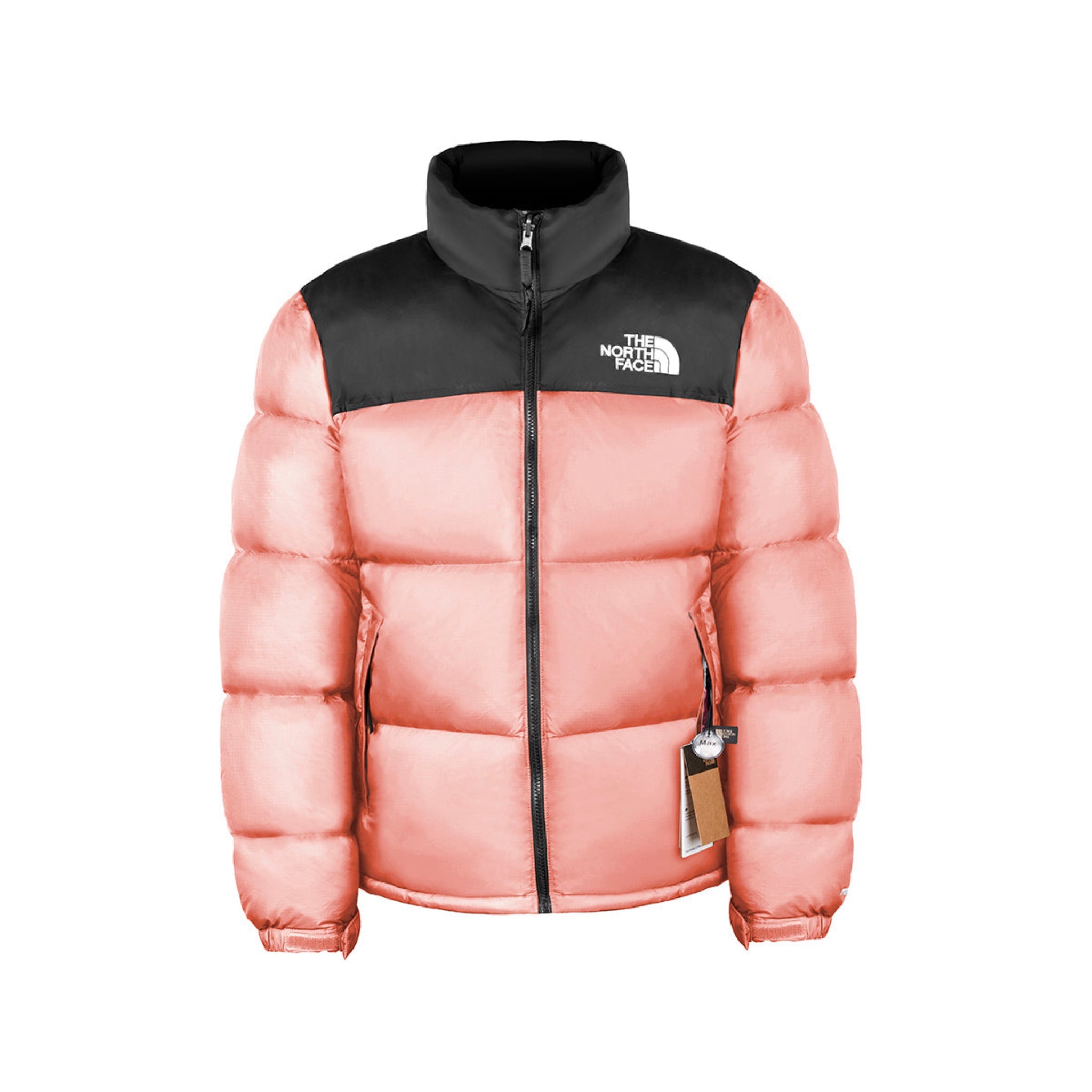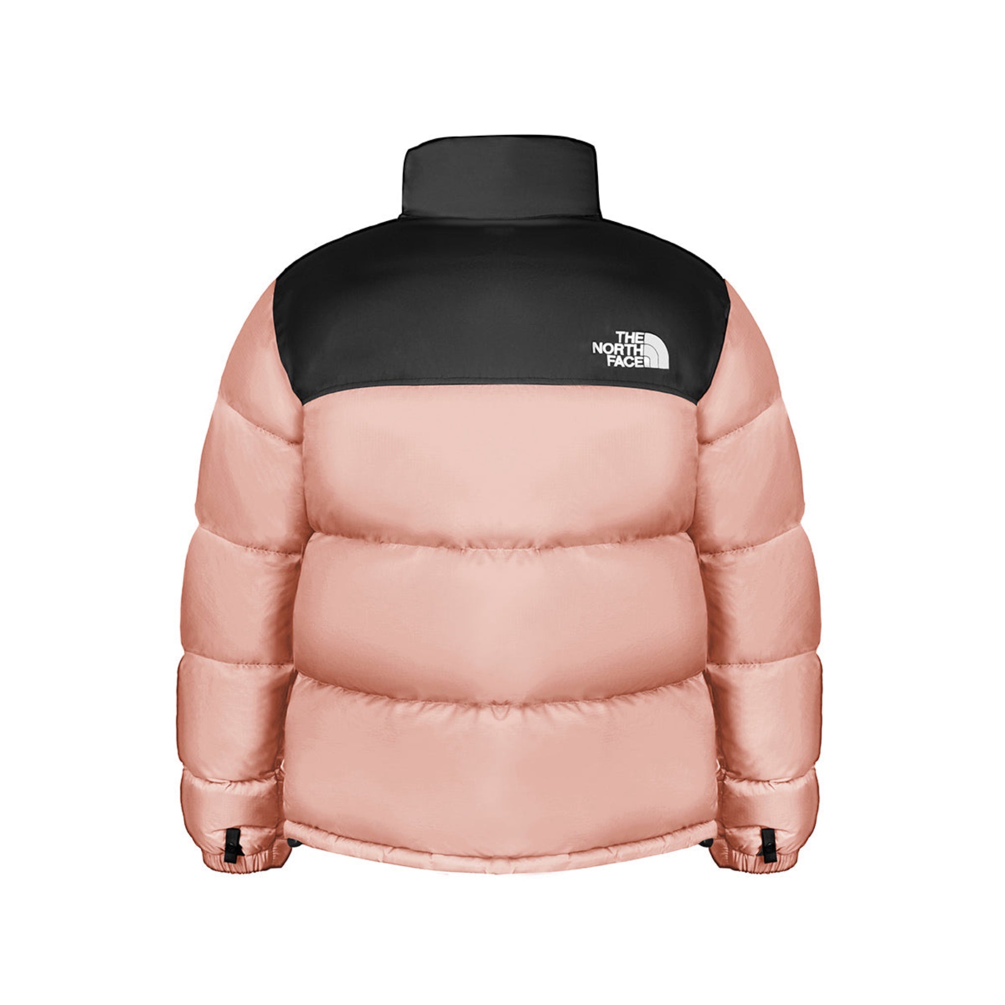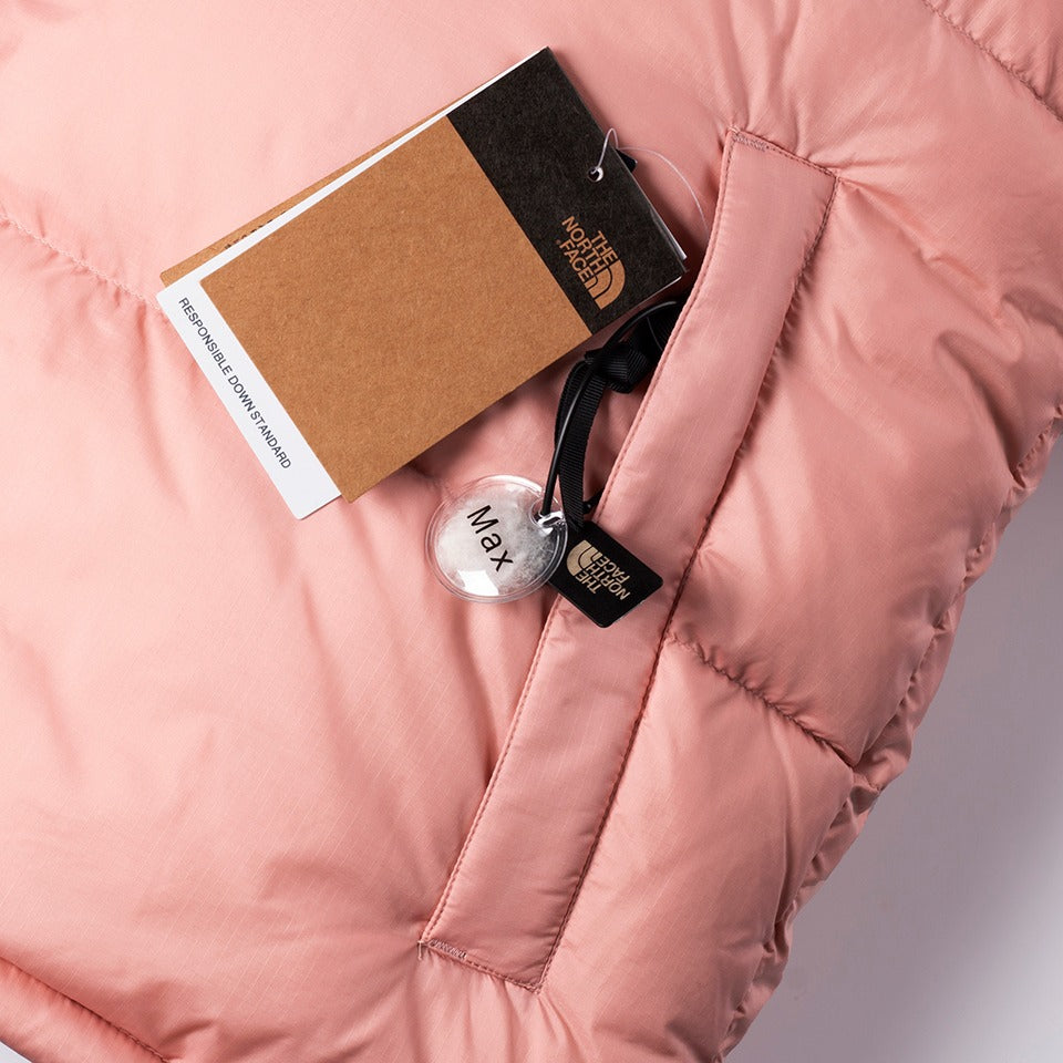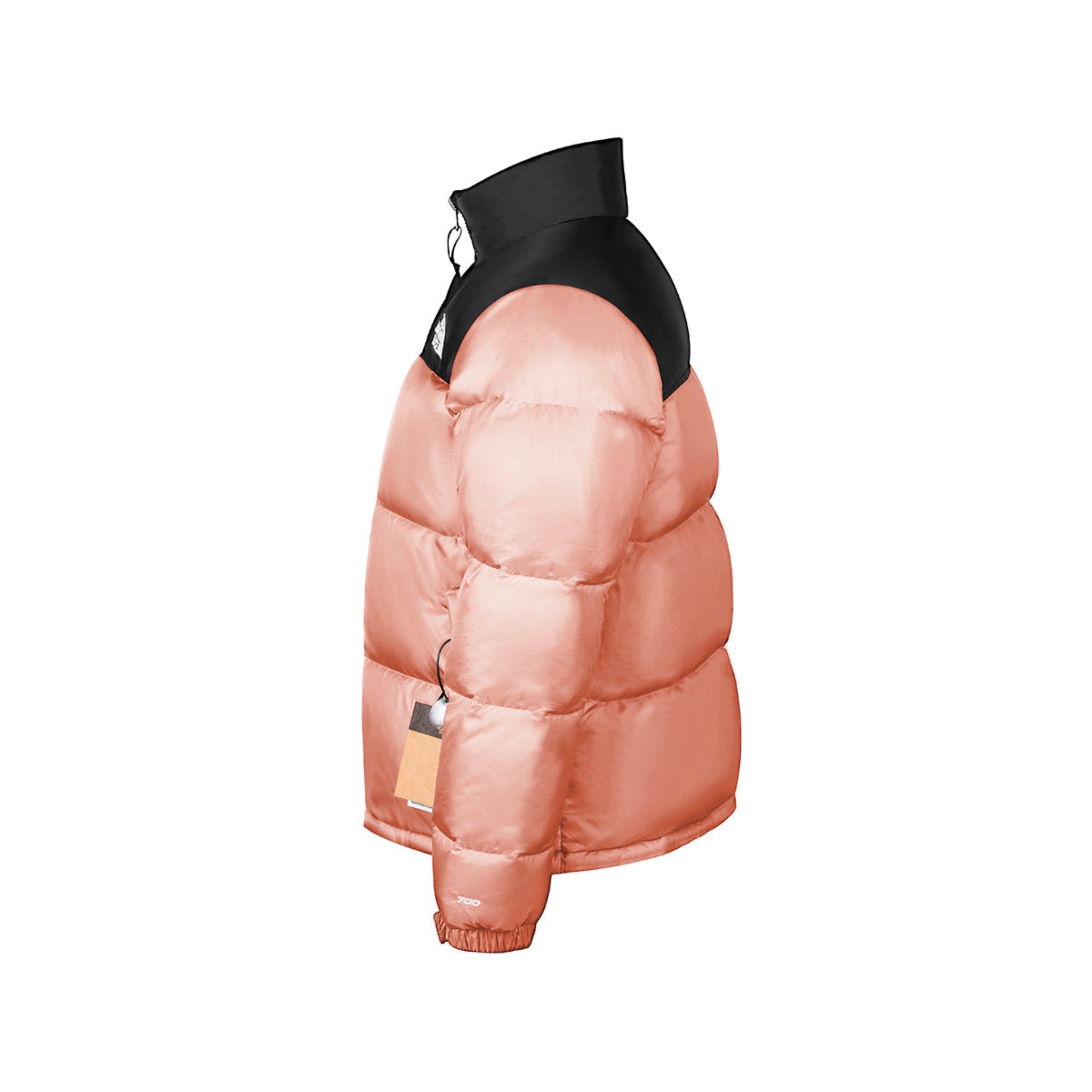 The jacket is a durable and stylish piece inspired by the 1996 version. With its 700-fill down construction, it is known for its lofty quality. The jacket features durable hood at the rear, making it practical and functional. The design is available in black and  peach purple, and it is adorned with the brand's logo at the chest and rear. a sleek and sto