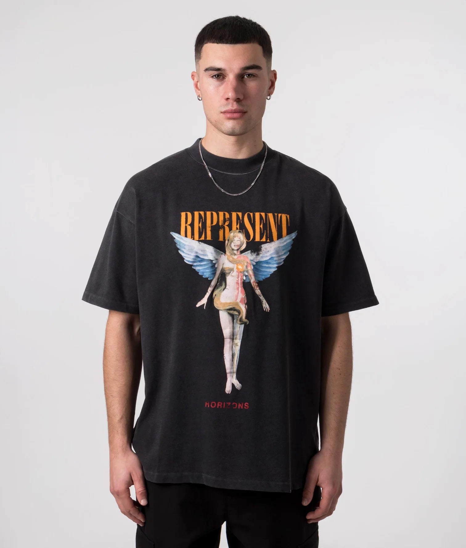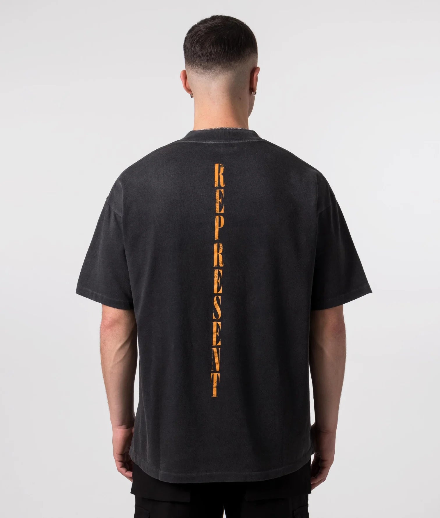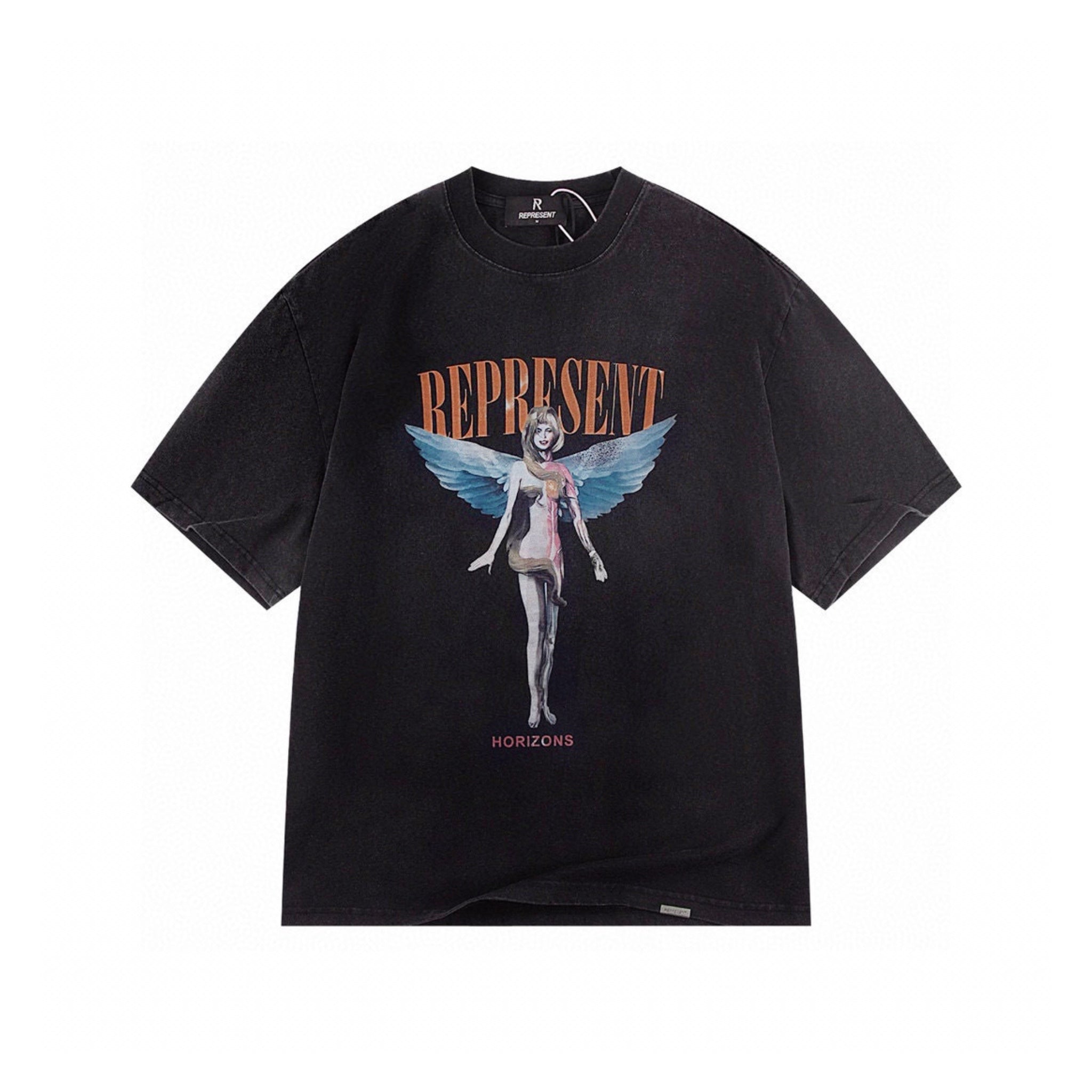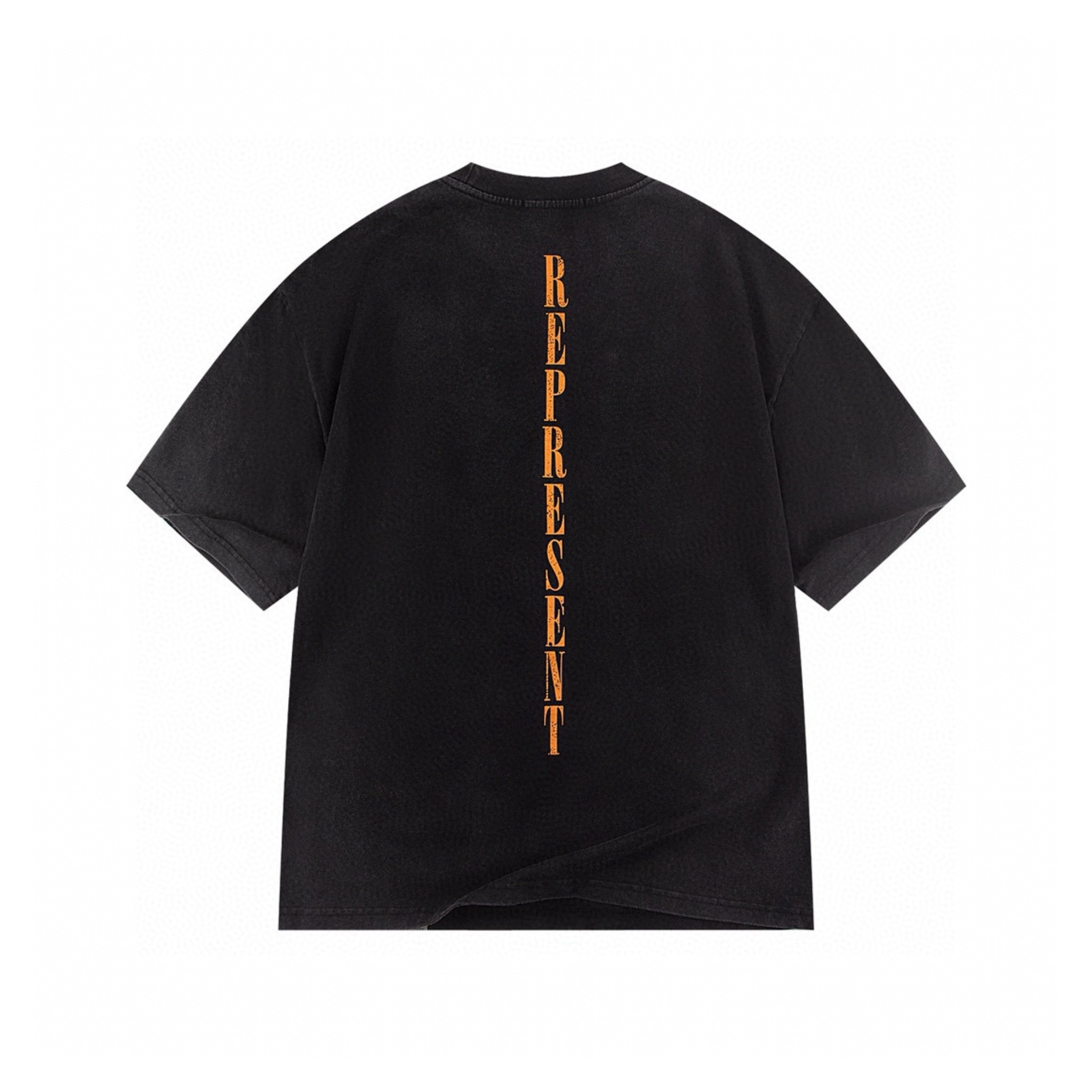 The Represent Reborn T-Shirt showcases a distinctive design with "represent" printed vertically along the spine, complemented by an eye-catching orange Toothfairy print on the front. This expert-crafted tee blends bold aesthetics with a comfortable fit, perfect for those seeking a unique and stylish statement piece.
