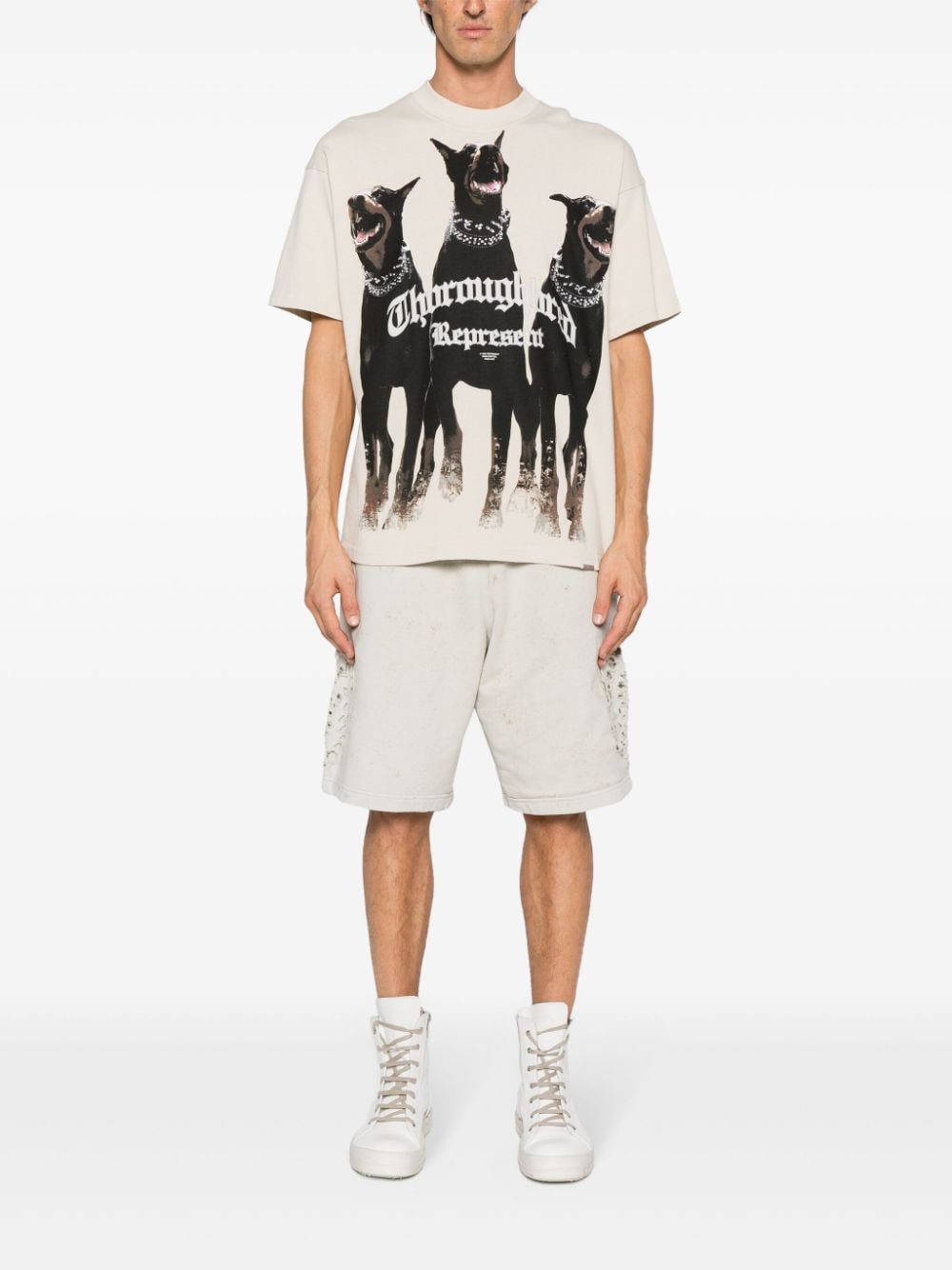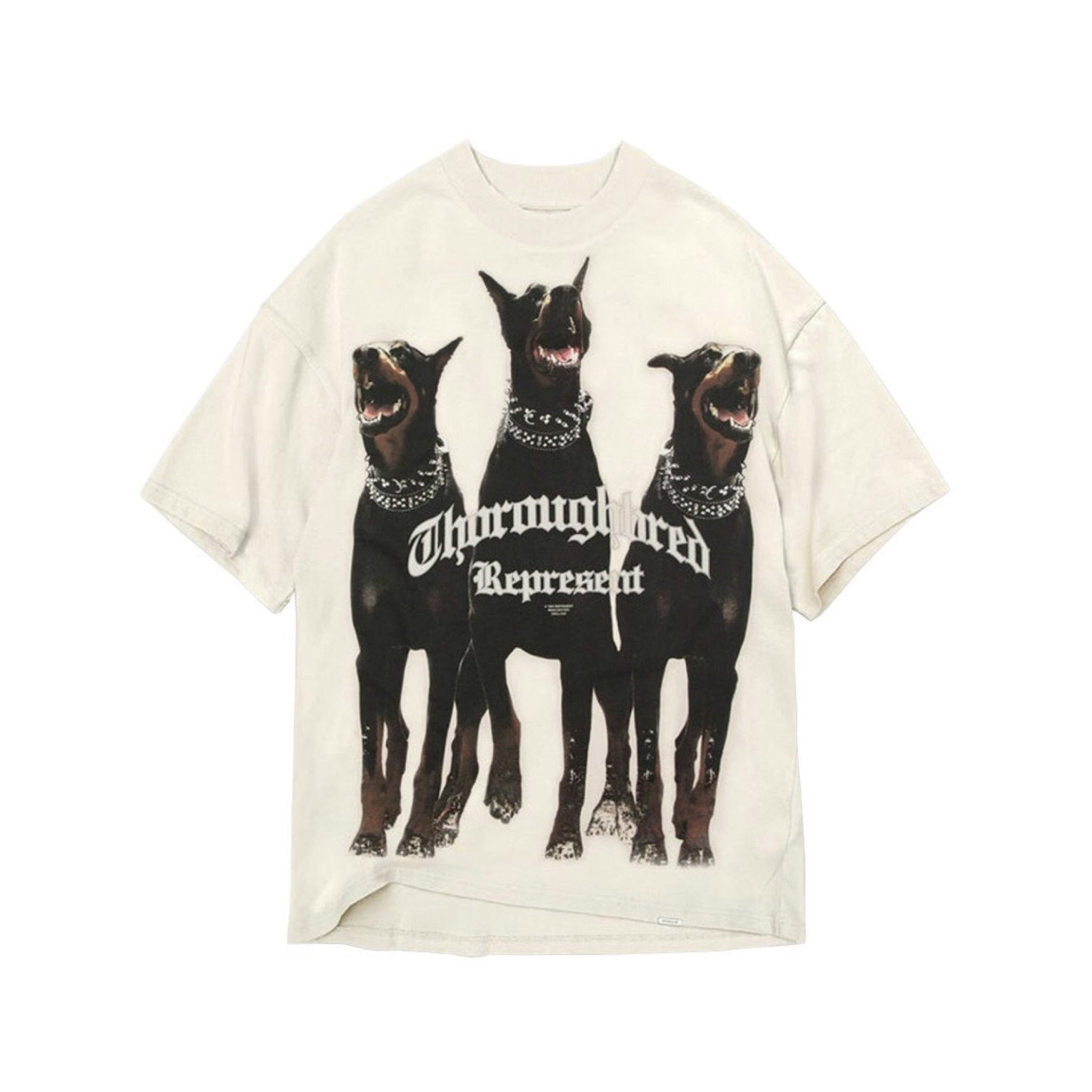 Represent's Thoroughbred graphic is a depiction of three dogs with bold lettering across. It is seen in multiple items of the British streetwear brand, like this cream-white cotton T-shirt.