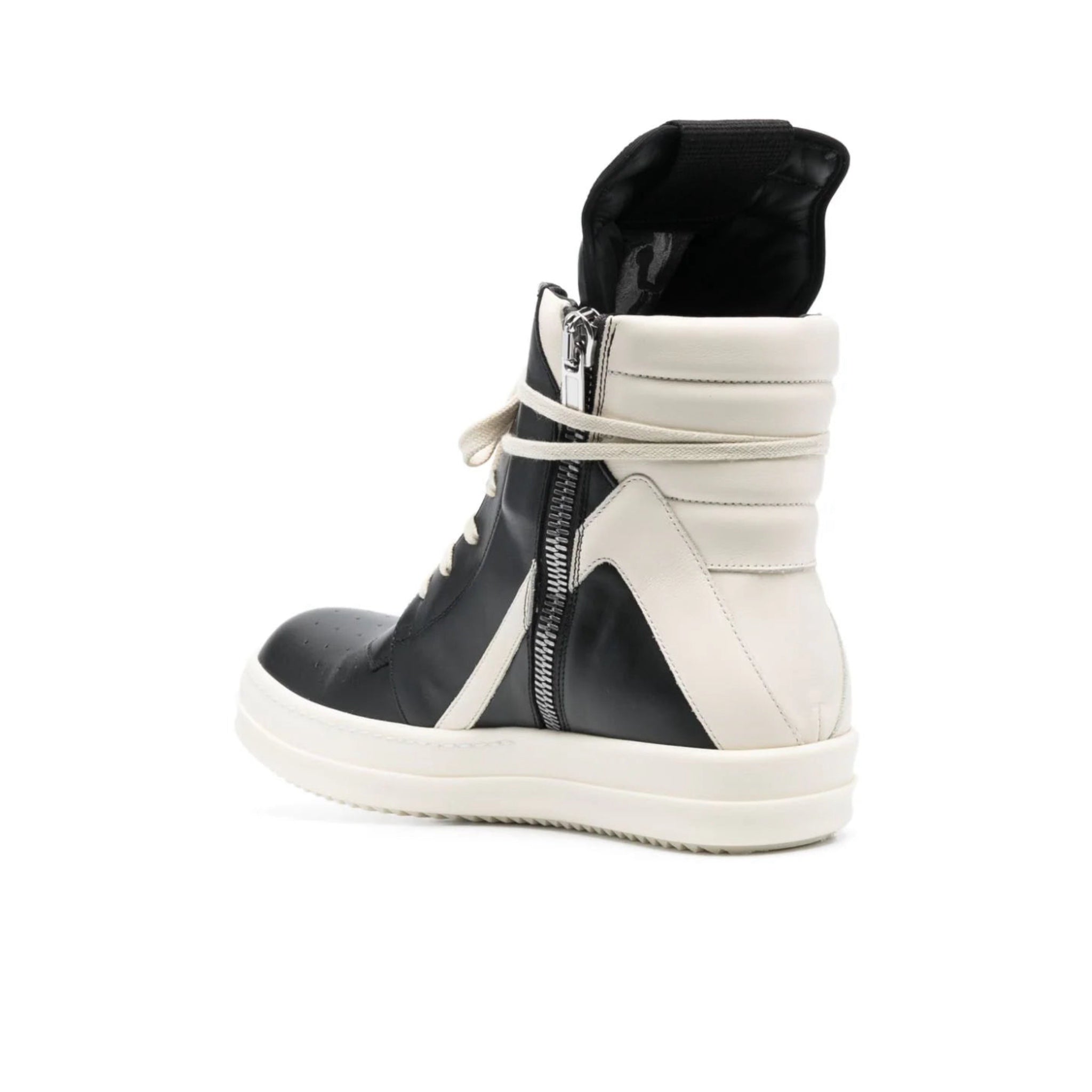 Leather lace-up high-top sneakers from Rick Owens featuring black/white, calf leather, eyelet detailing, front lace-up fastening, round toe, contrasting toecap and flat rubber sole.