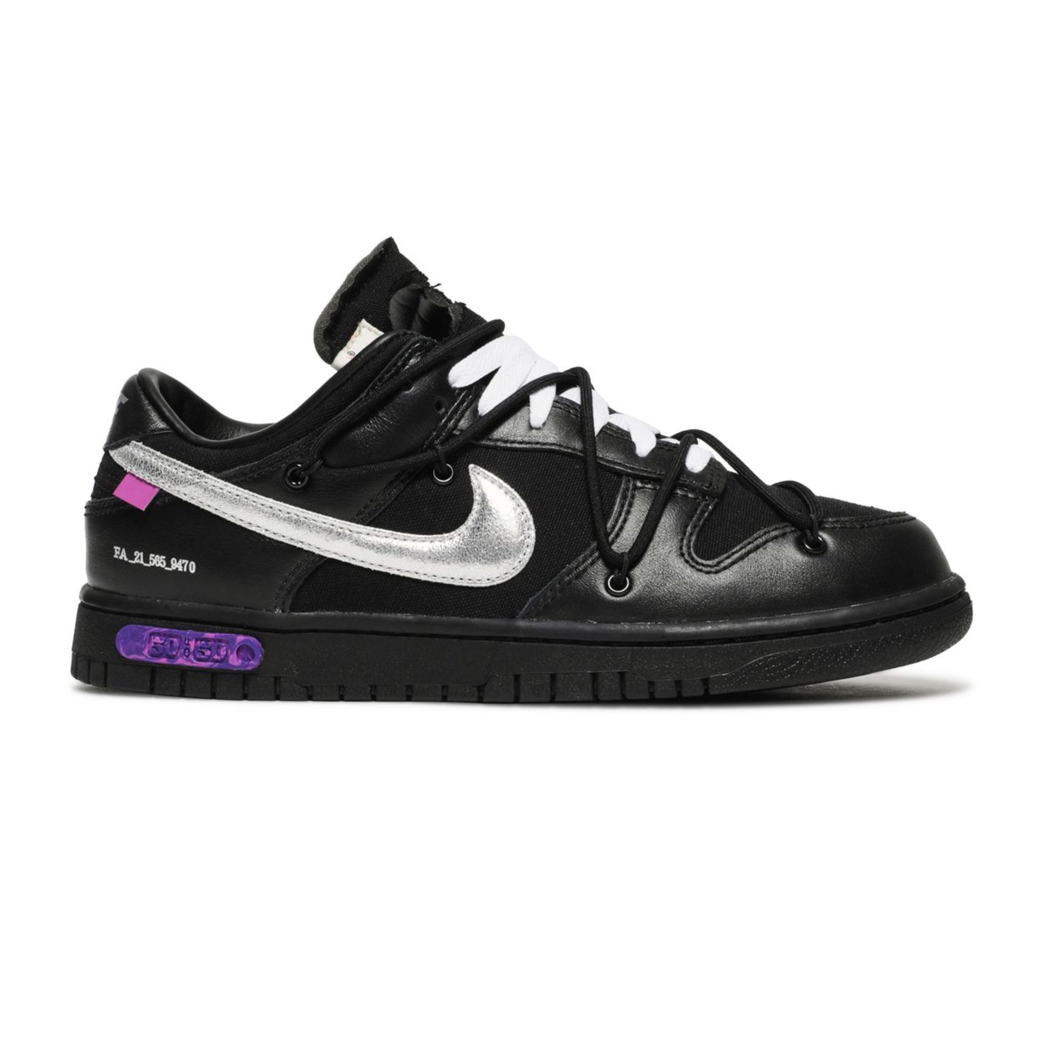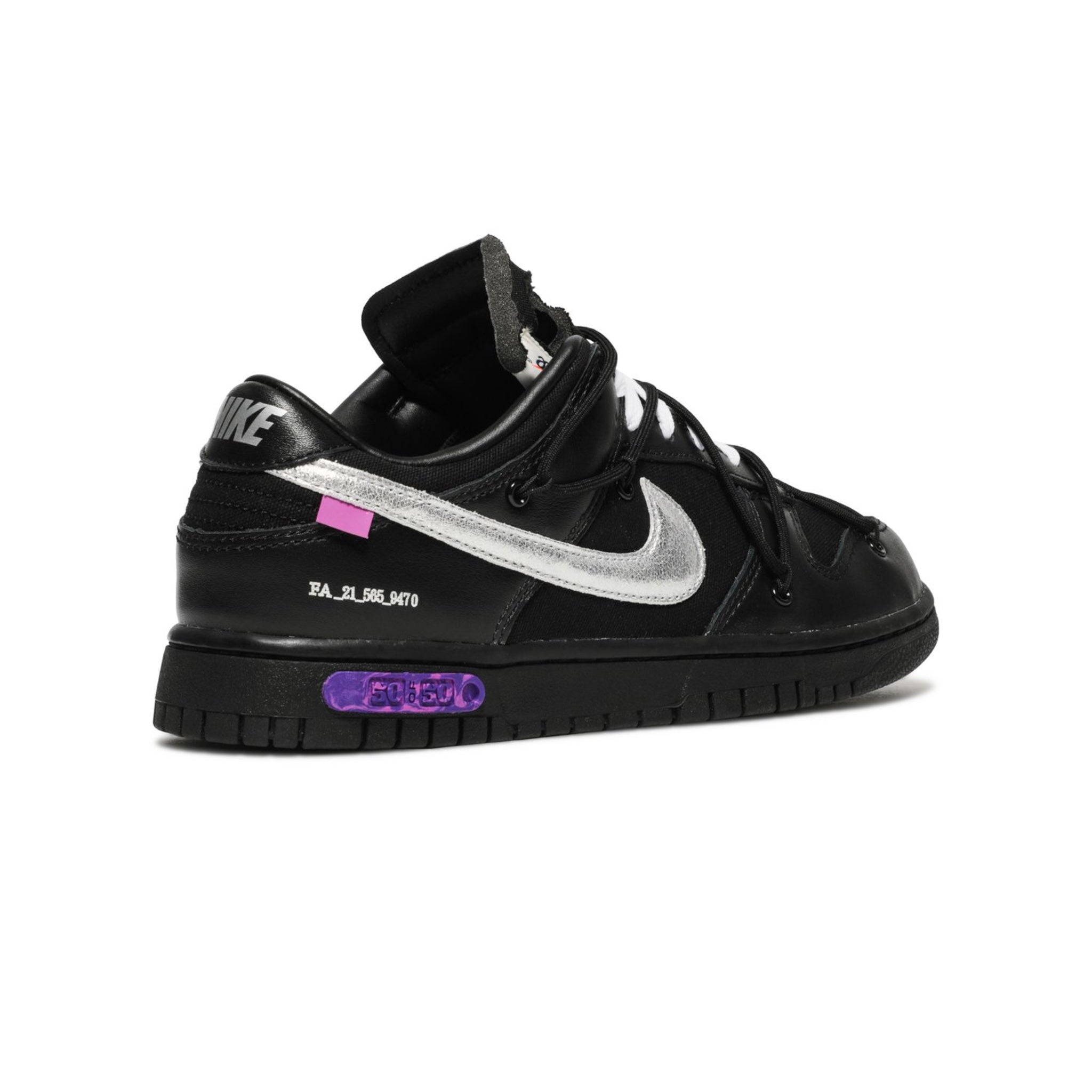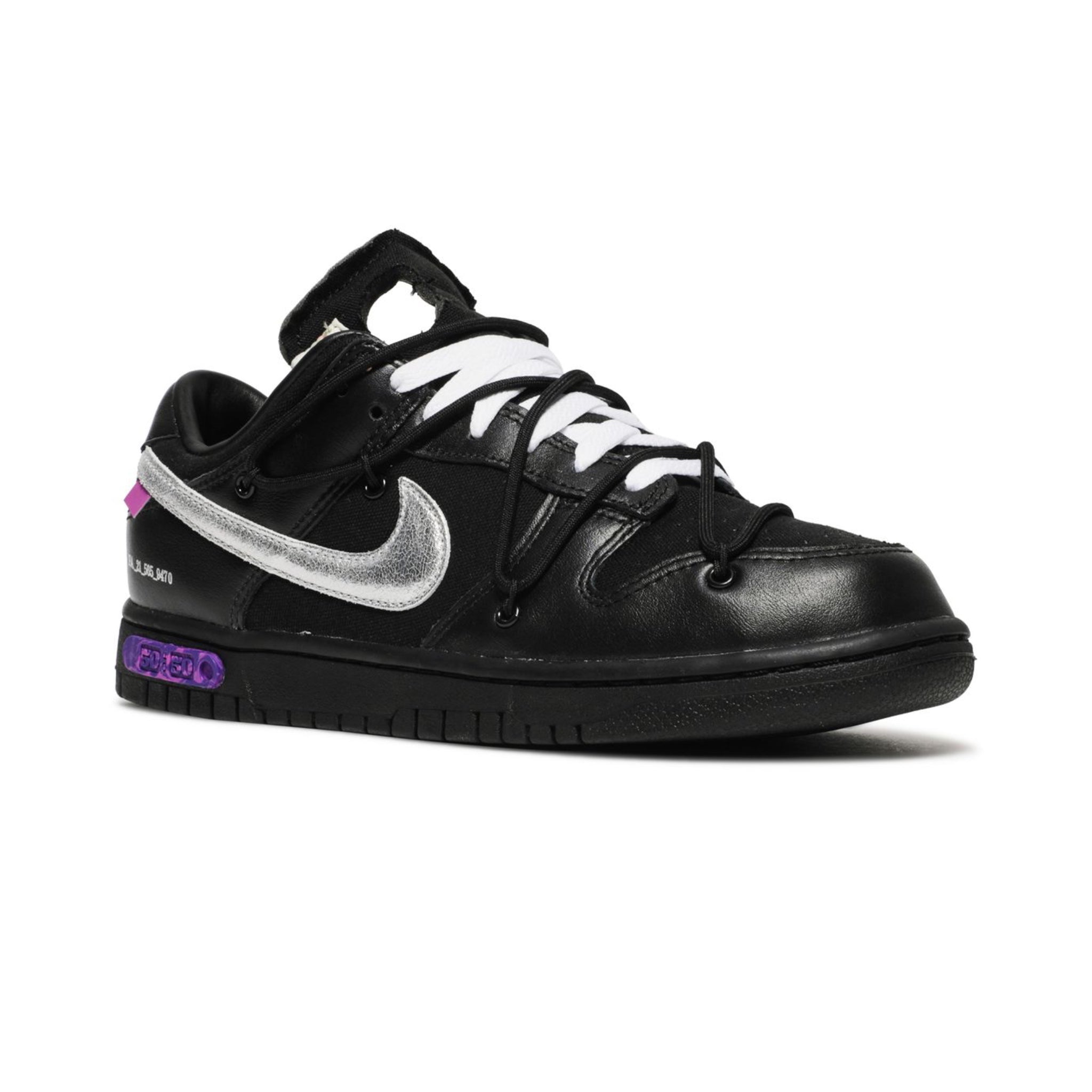 Part of the Dear Summer collection, the Off-White x Dunk Low 'Dear Summer - 50 of 50' is the final iteration of the pack. Built with canvas and leather, the shoe's upper appears primarily in black, with the Swoosh branding highlighting the side wall in metallic silver. An exposed-foam tongue adds a deconstructed touch, while signature Virgil Abloh features take the shape of Helvetica text, a plastic zip tie and supplemental rope laces. Underfoot, '50 of 50' on the midsole denotes the model's status as the final in the set.