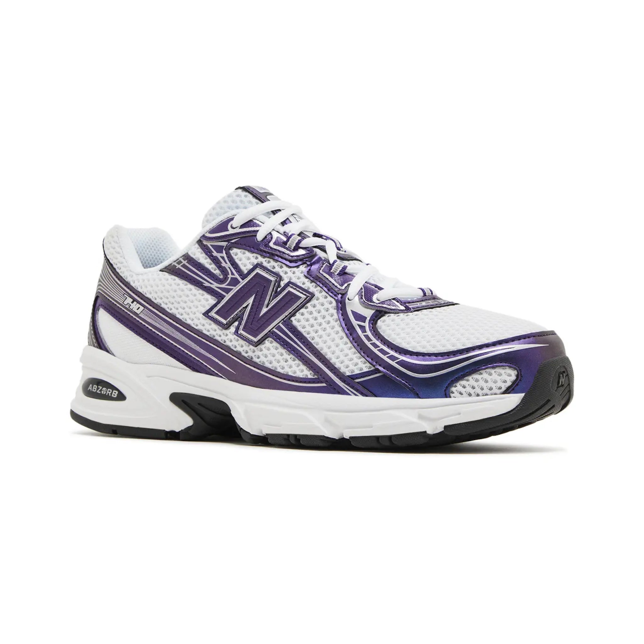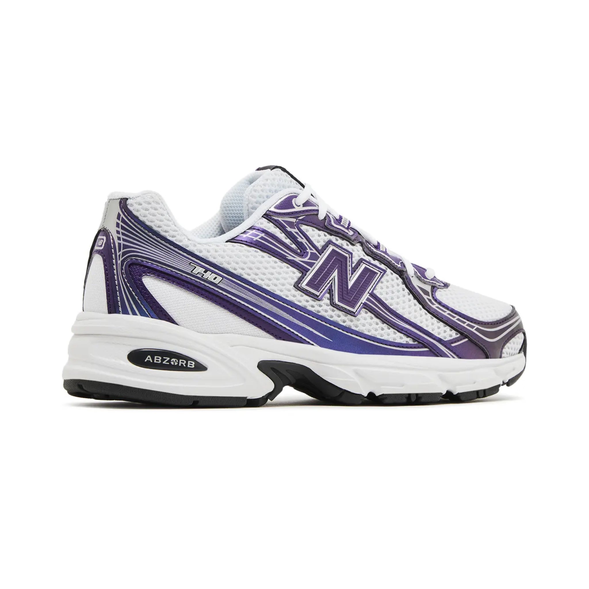The New Balance 740 'Concord Grape' brings a white open-cell mesh upper with gradient purple synthetic leather overlays. The latter are accented with metallic silver details, while a molded 'N' logo and a Flying NB emblem adorn the tongue and heel, respectively. A plush ABZORB midsole brings a comfortable feel with every step.